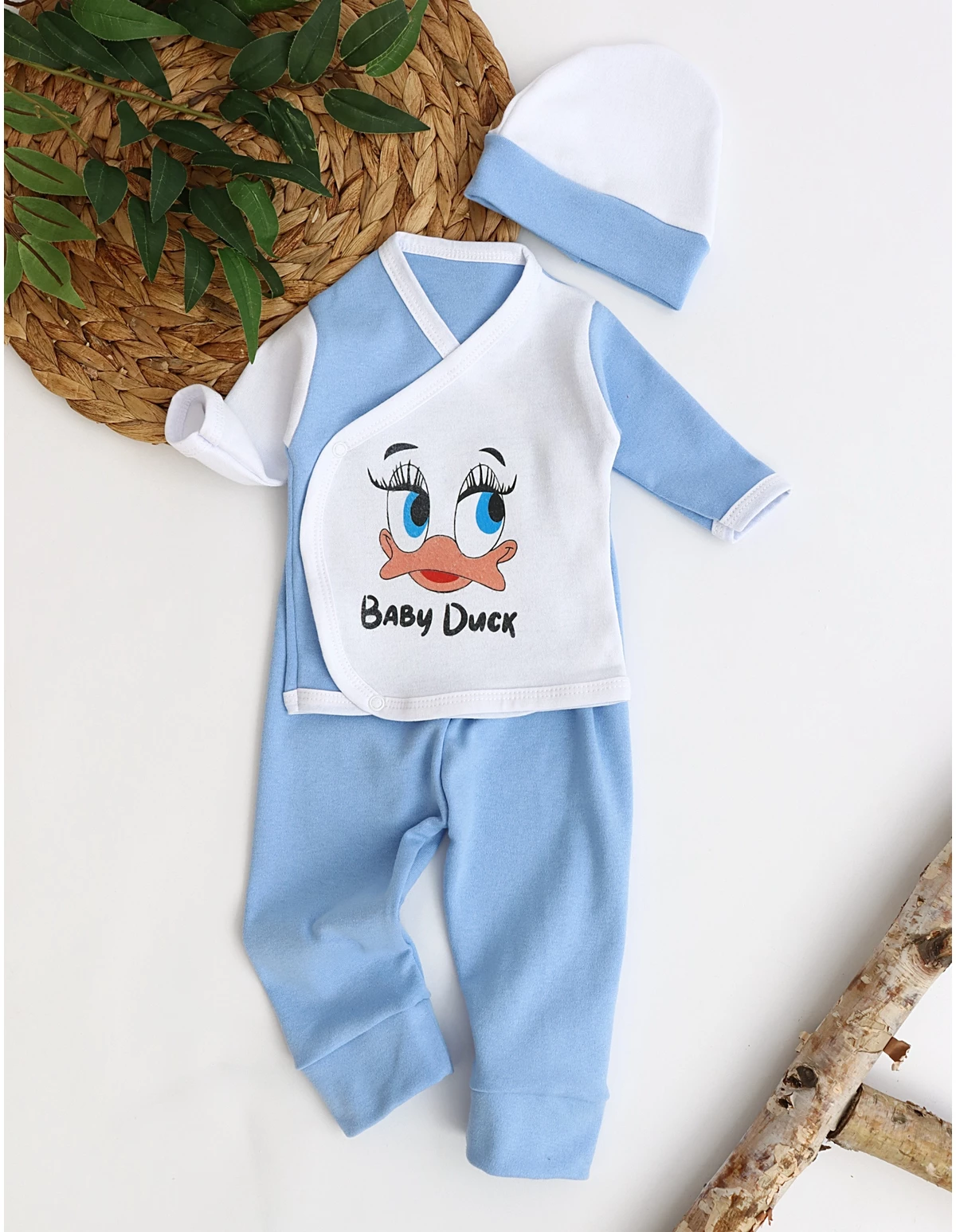 Oferă-i nou-născutului tău startul perfect în viață cu acest adorabil costum de 3 piese, conceput special pentru bebelușii între 0 și 1 lună. Setul include o bluziță cu un imprimeu jucăuș de rățușcă și deschidere ușoară în capse, pantalonași confortabili cu elastic în talie și o căciuliță asortată, toate fabricate din 100% bumbac moale. Acest set asigură confortul absolut necesar bebelușului tău, fiind ideal pentru pielea sensibilă și pentru zilele și nopțile de explorare și odihnă. Haine bebe, haine bebelusi, haine nou nascut, haine copii.