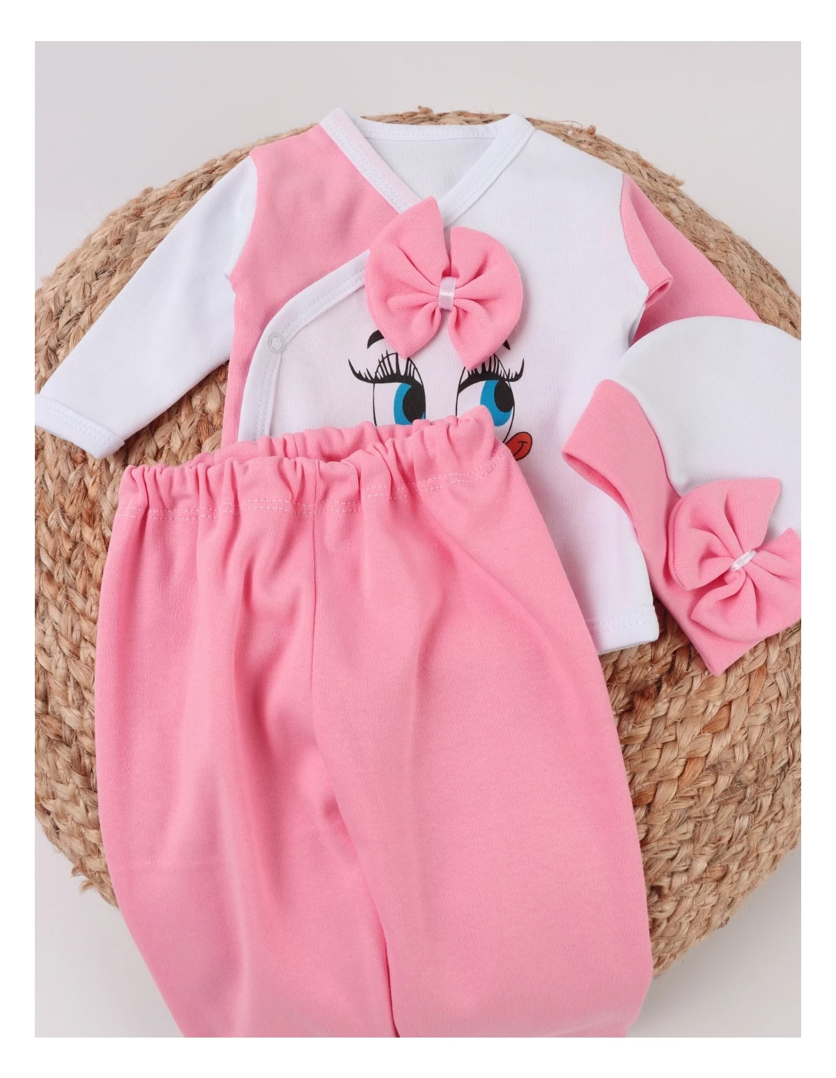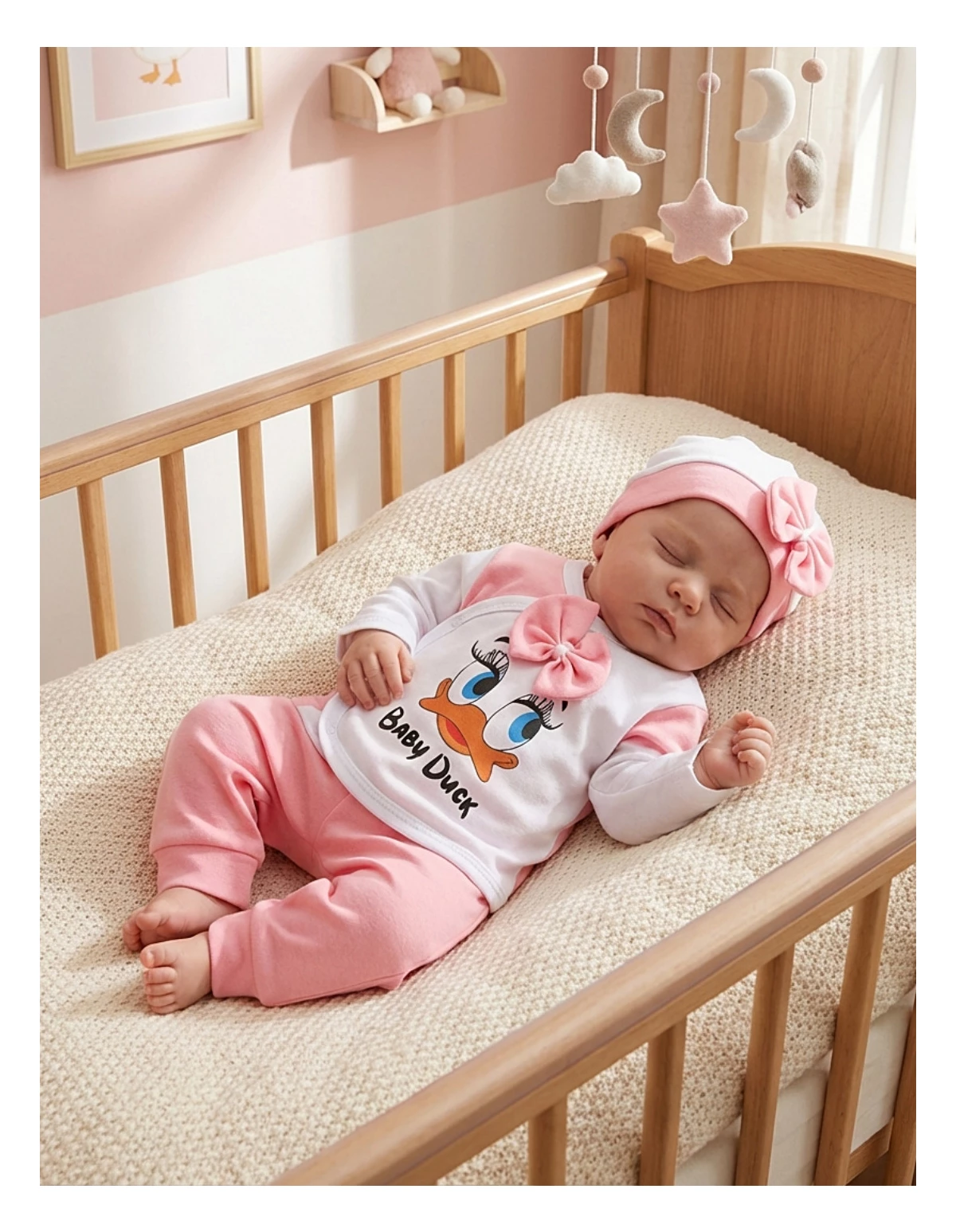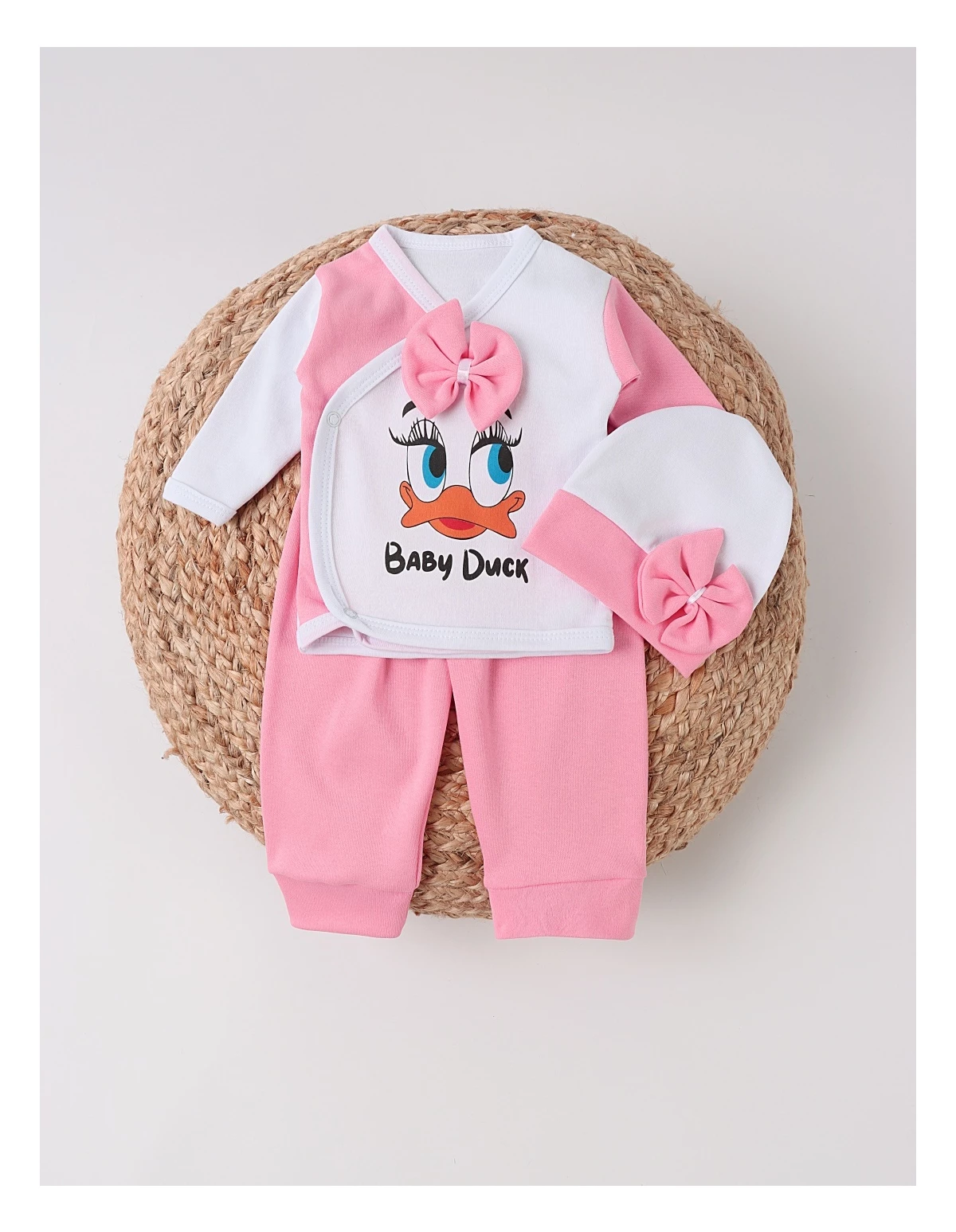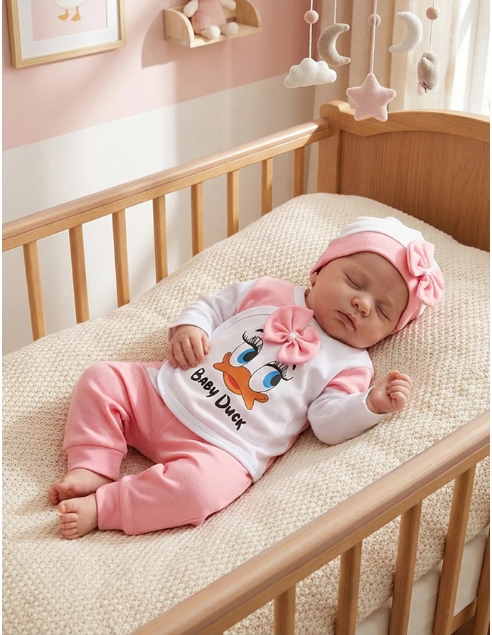 Oferă-i nou-născutului tău startul perfect în viață cu acest adorabil costum de 3 piese, conceput special pentru bebelușii între 0 și 1 lună. Setul include o bluziță cu un imprimeu jucăuș de rățușcă și deschidere ușoară în capse, pantalonași confortabili cu elastic în talie și o căciuliță asortată, toate fabricate din 100% bumbac moale. Acest set asigură confortul absolut necesar bebelușului tău, fiind ideal pentru pielea sensibilă și pentru zilele și nopțile de explorare și odihnă. Haine bebe, haine bebelusi, haine nou nascut, haine copii.