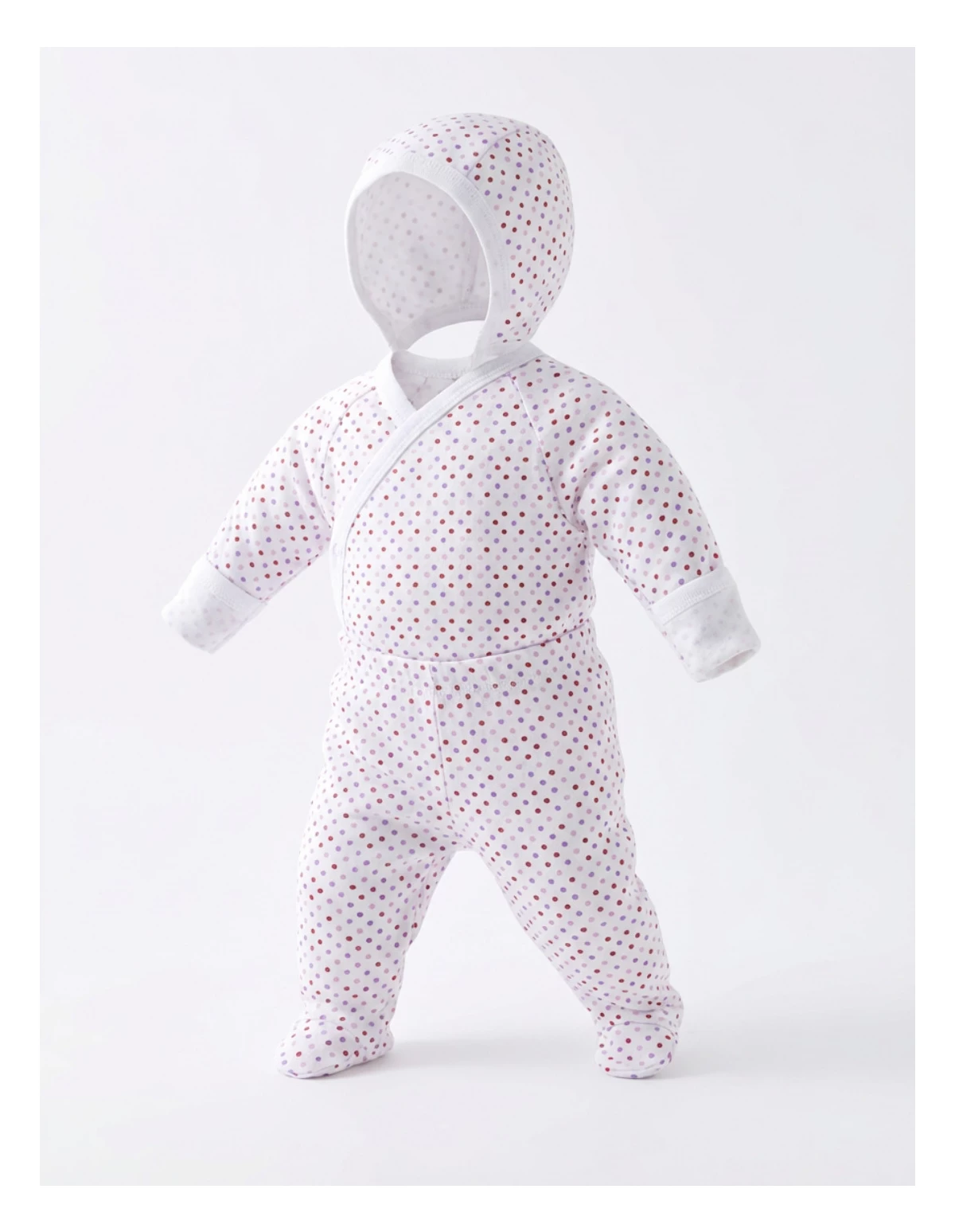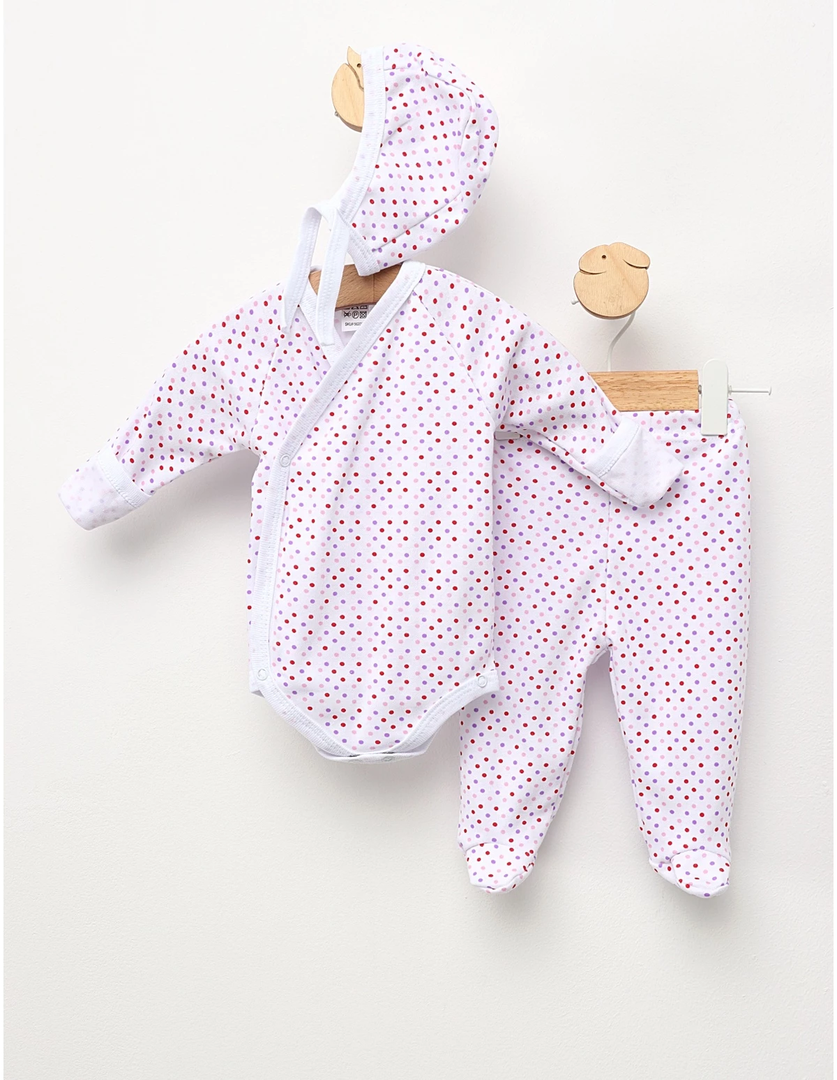 Îmbracă-ți bebelușul în acest costumaș adorabil, perfect pentru a-i oferi confort și siguranță! Setul include un body cu deschidere ușoară în capse, care facilitează schimbarea rapidă, și mănuși integrate ce protejează pielea delicată a bebelușului de zgârieturi accidentale. Căciulița tichie asigură căldură și confort, iar pantalonașii cu botoșei integrați adaugă un plus de practicitate. Imprimeul cu buline multicolore aduce un farmec deosebit acestui outfit. Realizat din 100% bumbac, acest costumaș este blând cu pielea bebelușului, fiind ideal pentru utilizare zilnică. Alege-l pentru a oferi micuțului tău un look drăgălaș și confortabil!