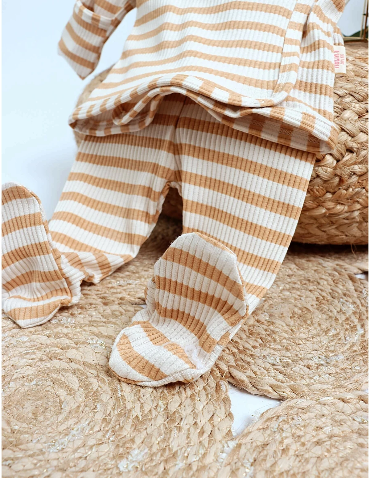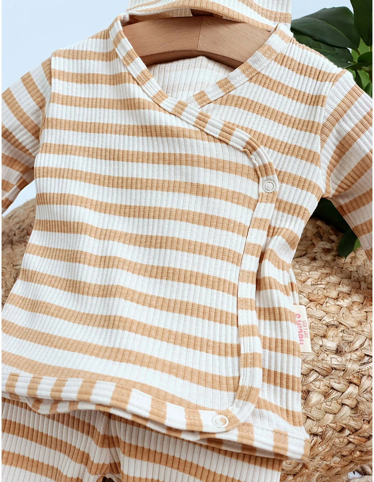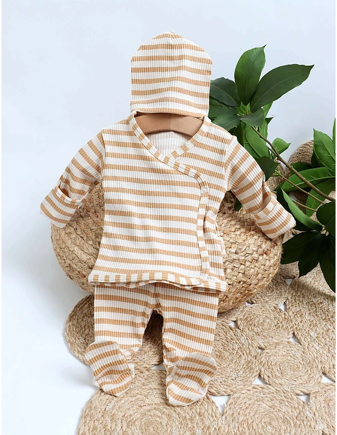 Îmbracă-ți copilul cu stil și confort în acest costumas din 3 piese, perfect pentru orice ocazie! Setul include o bluzită cu închidere în capse parte peste parte, pantalonasi cu botoșei integrați și o caciuliță adorabilă. Imprimeul cu dungute oferă un aspect clasic și elegant, iar materialul din 95% bumbac și 5% licra garantează o potrivire comodă și flexibilă. Ideal pentru joacă, plimbări sau evenimente speciale, acest costumas va deveni rapid preferatul micuțului tău!