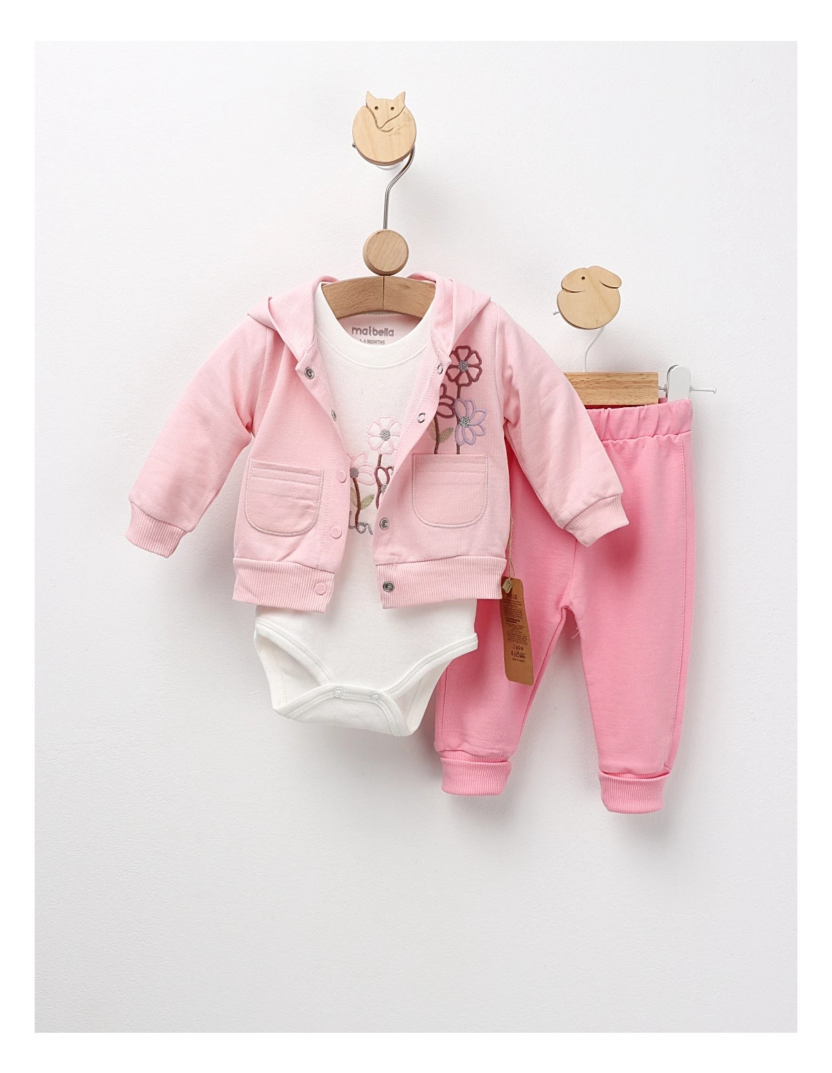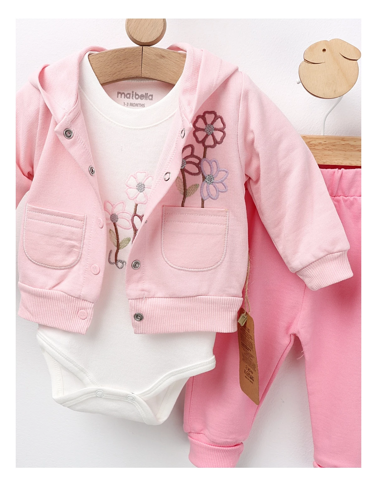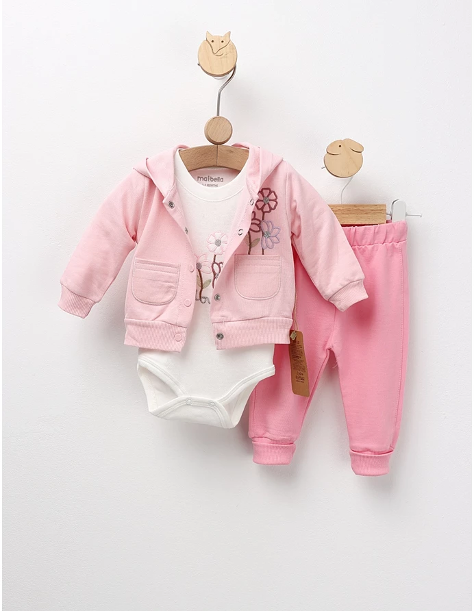 Set de 3 piese pentru bebeluși, ideal pentru primele zile, include o bluză cu glugă și imprimeu cusut cu 'floricele', un body cu deschidere în capse și pantaloni cu elastic în talie. Confecționat din 100% bumbac, acest set oferă confort, siguranță și un aspect adorabil, perfect pentru odihnă, joacă și momente speciale ale micuțului tău.