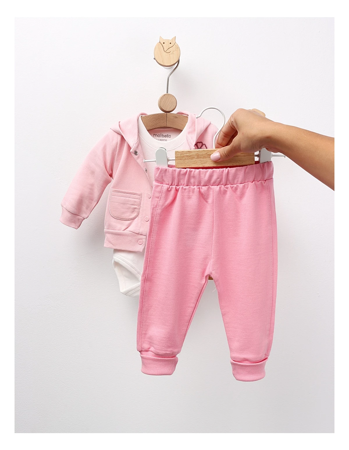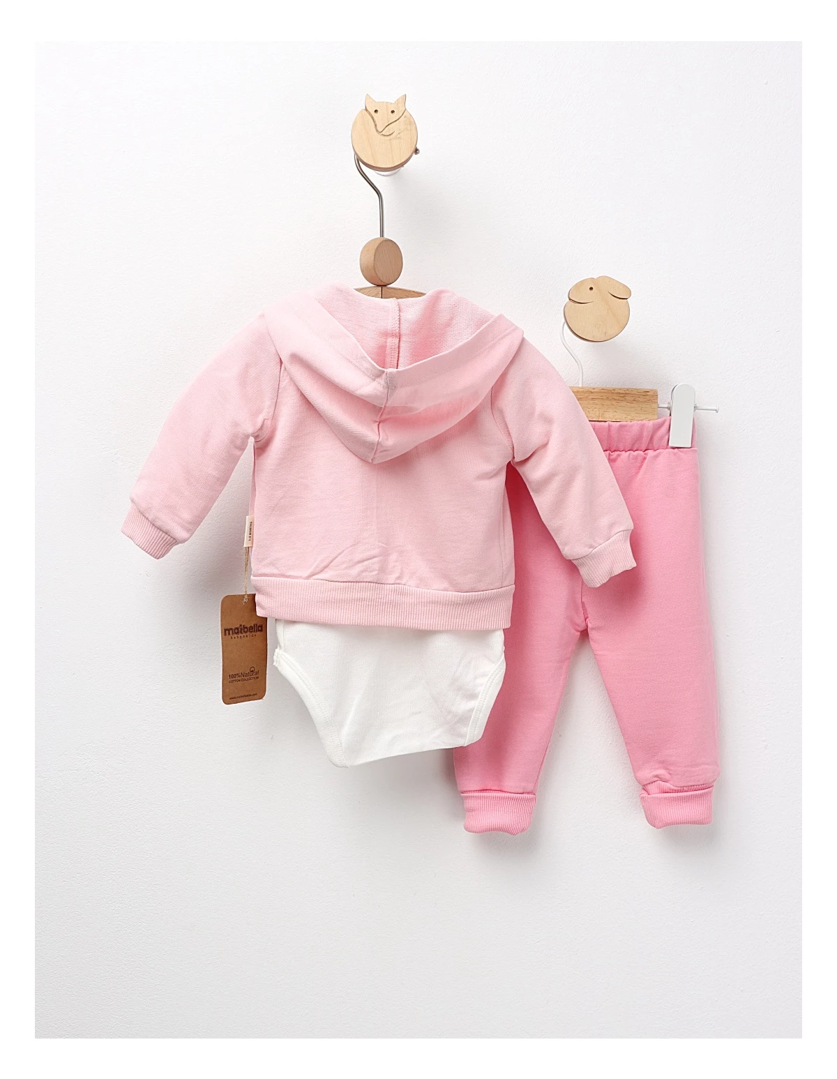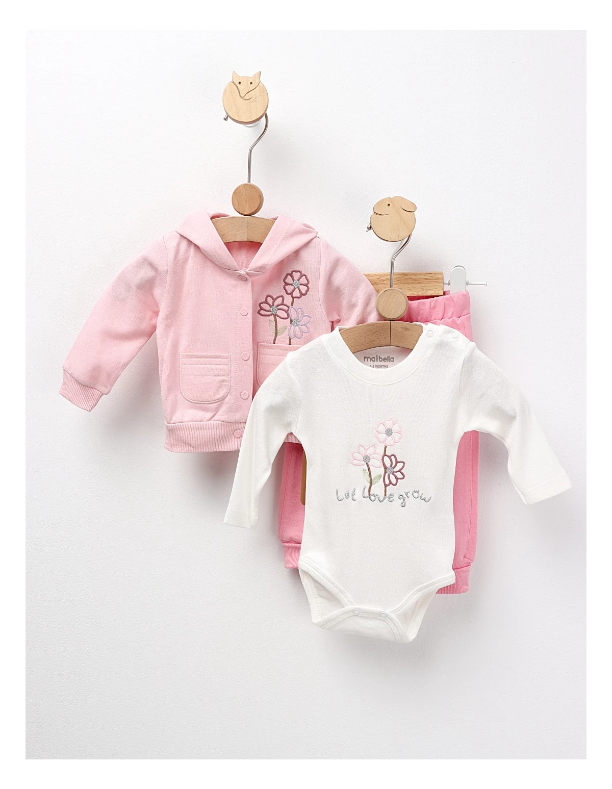 Set de 3 piese pentru bebeluși, ideal pentru primele zile, include o bluză cu glugă și imprimeu cusut cu 'floricele', un body cu deschidere în capse și pantaloni cu elastic în talie. Confecționat din 100% bumbac, acest set oferă confort, siguranță și un aspect adorabil, perfect pentru odihnă, joacă și momente speciale ale micuțului tău.