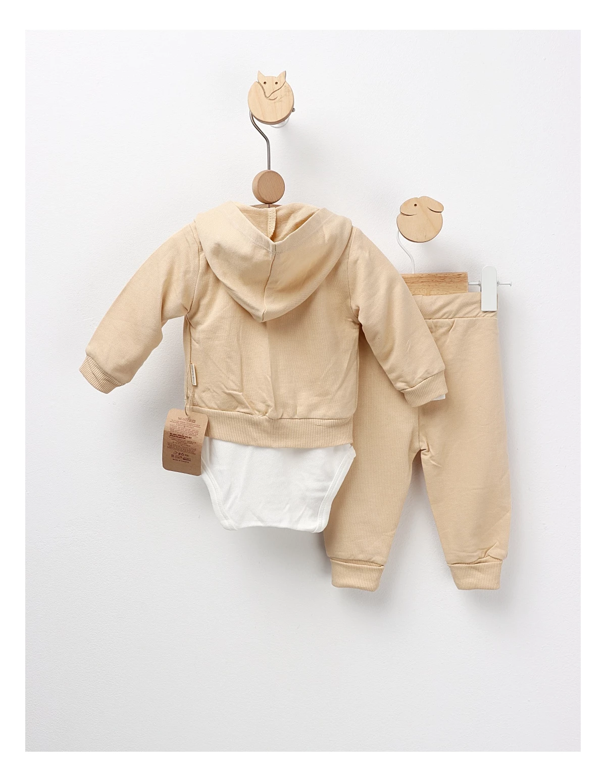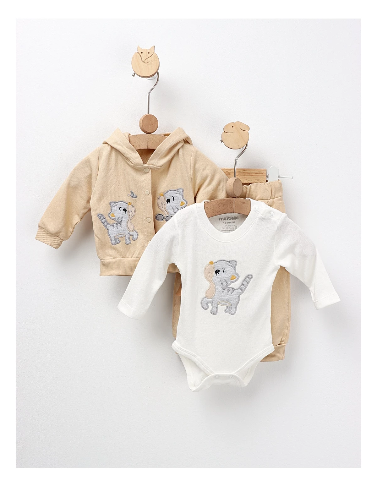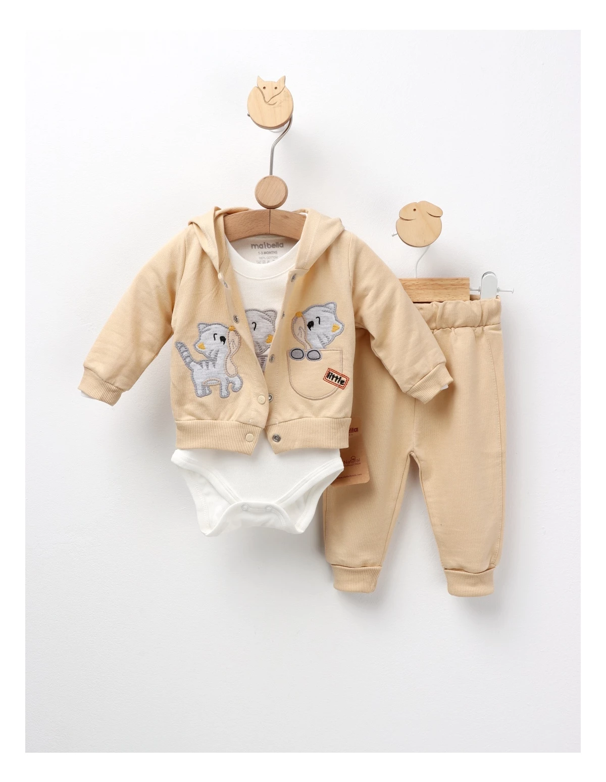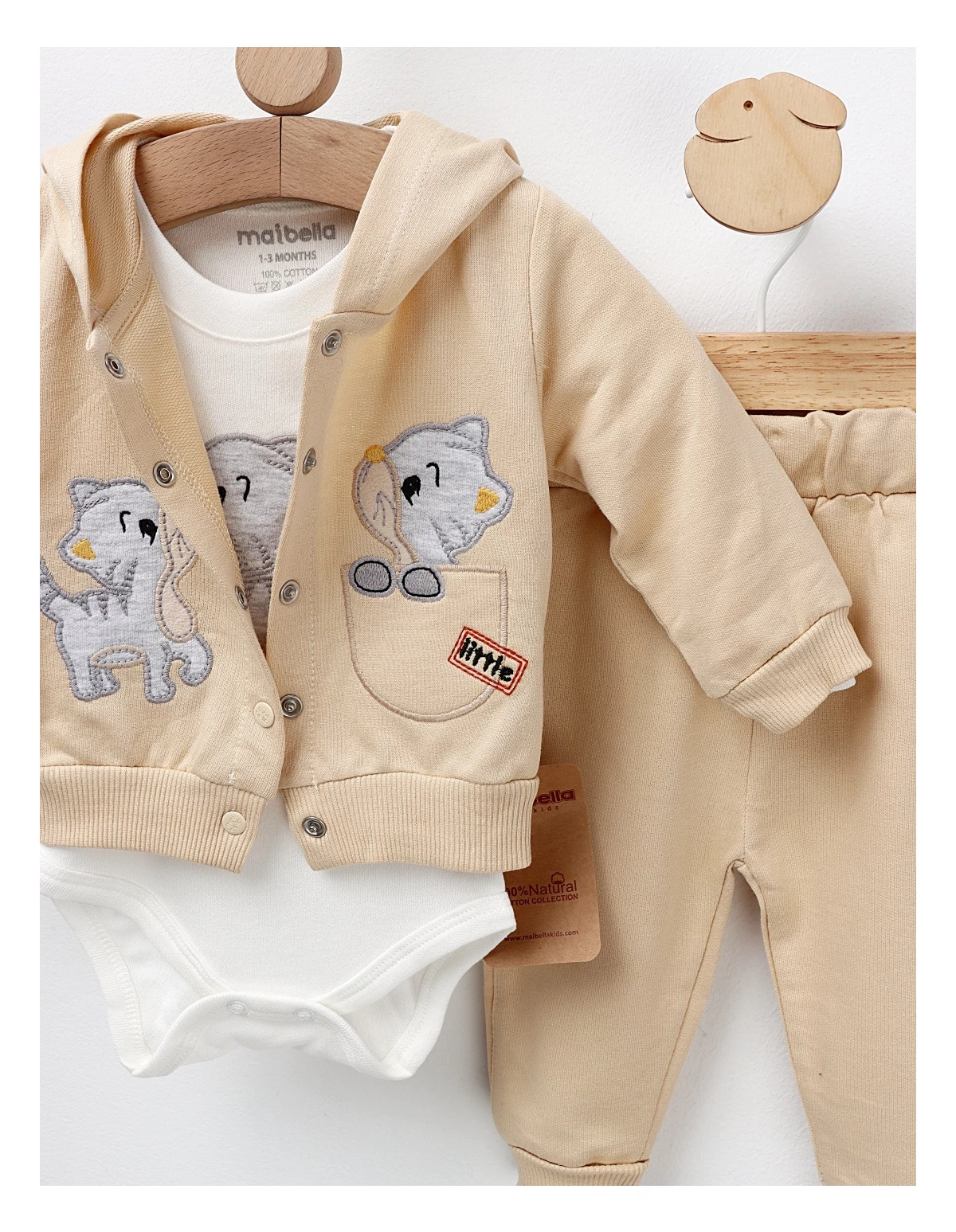 Set de 3 piese pentru bebeluși, ideal pentru primele zile, include o bluză cu glugă și imprimeu cusut cu 'Micuta Pisicuta', un body cu deschidere în capse și pantaloni cu elastic în talie. Confecționat din 100% bumbac, acest set oferă confort, siguranță și un aspect adorabil, perfect pentru odihnă, joacă și momente speciale ale micuțului tău.