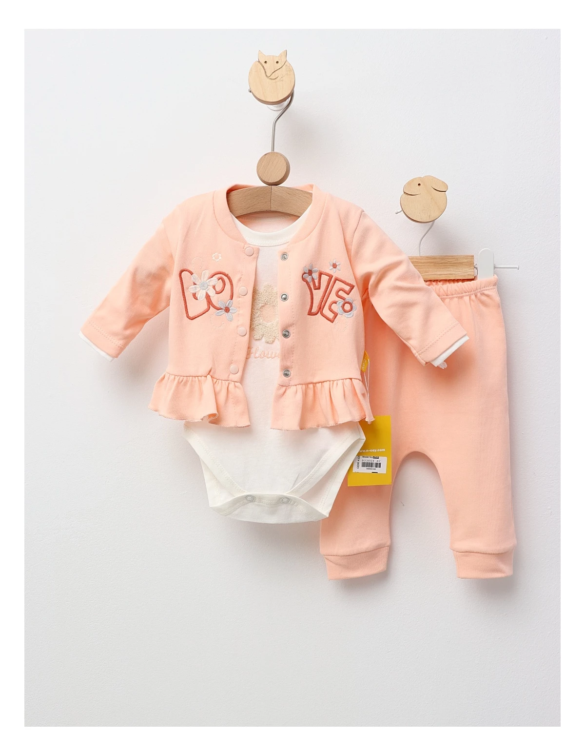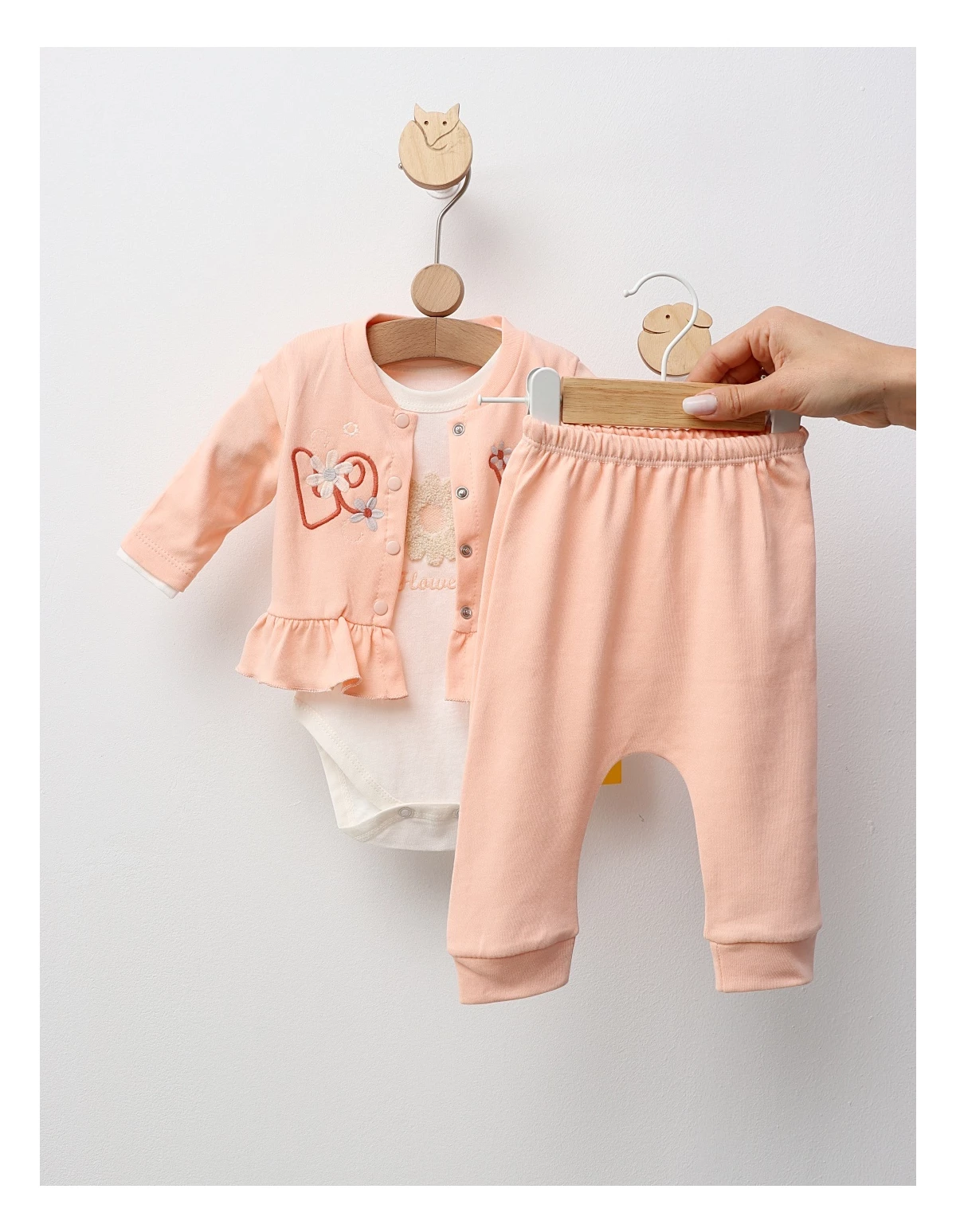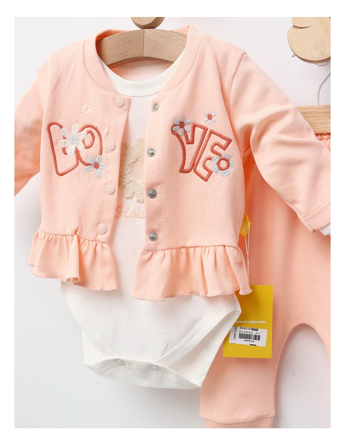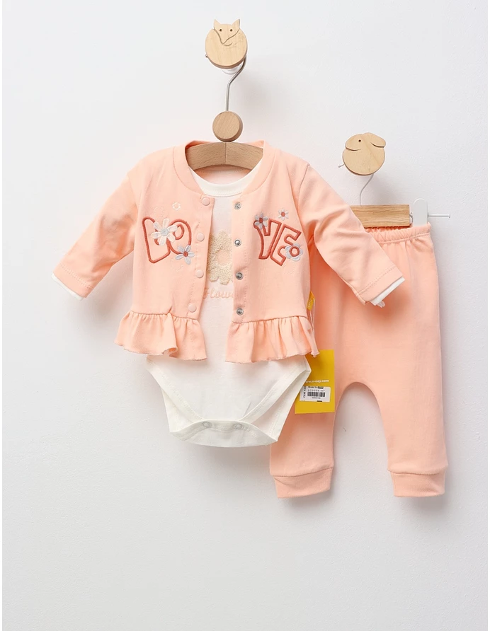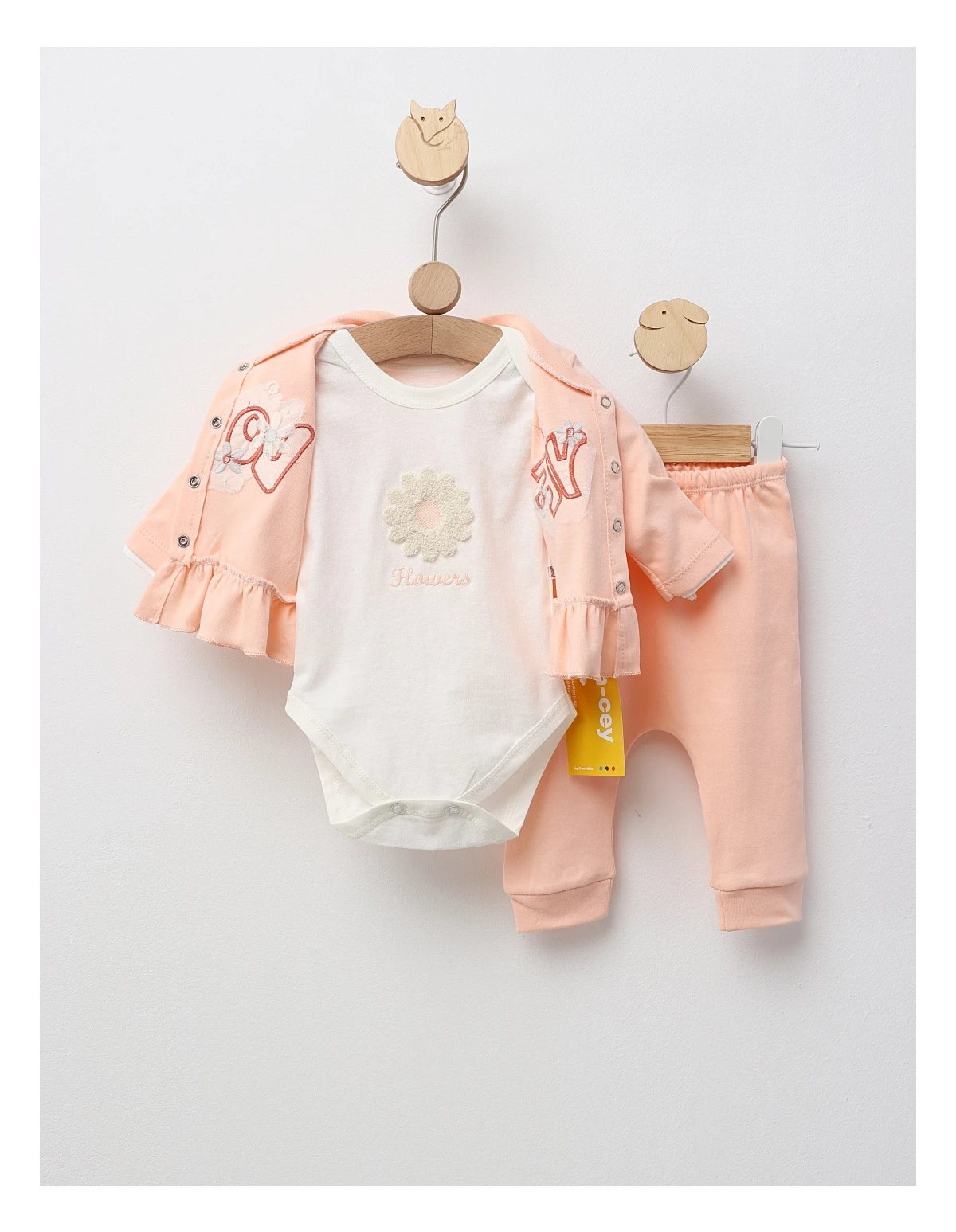 Costumul 3 piese pentru fetițe include o bluză înflorată cu deschidere în capse, un body cu imprimeu de floricică și pantaloni cu elastic în talie. Fabricat din material premium 100% bumbac, acest set oferă confort și eleganță, fiind ideal pentru joacă sau ocazii speciale.
