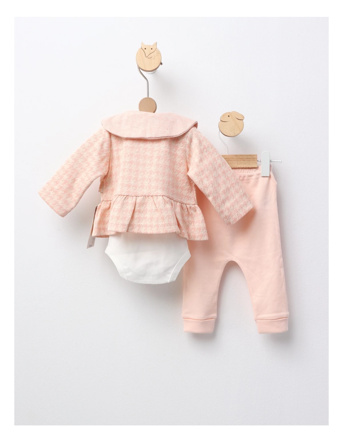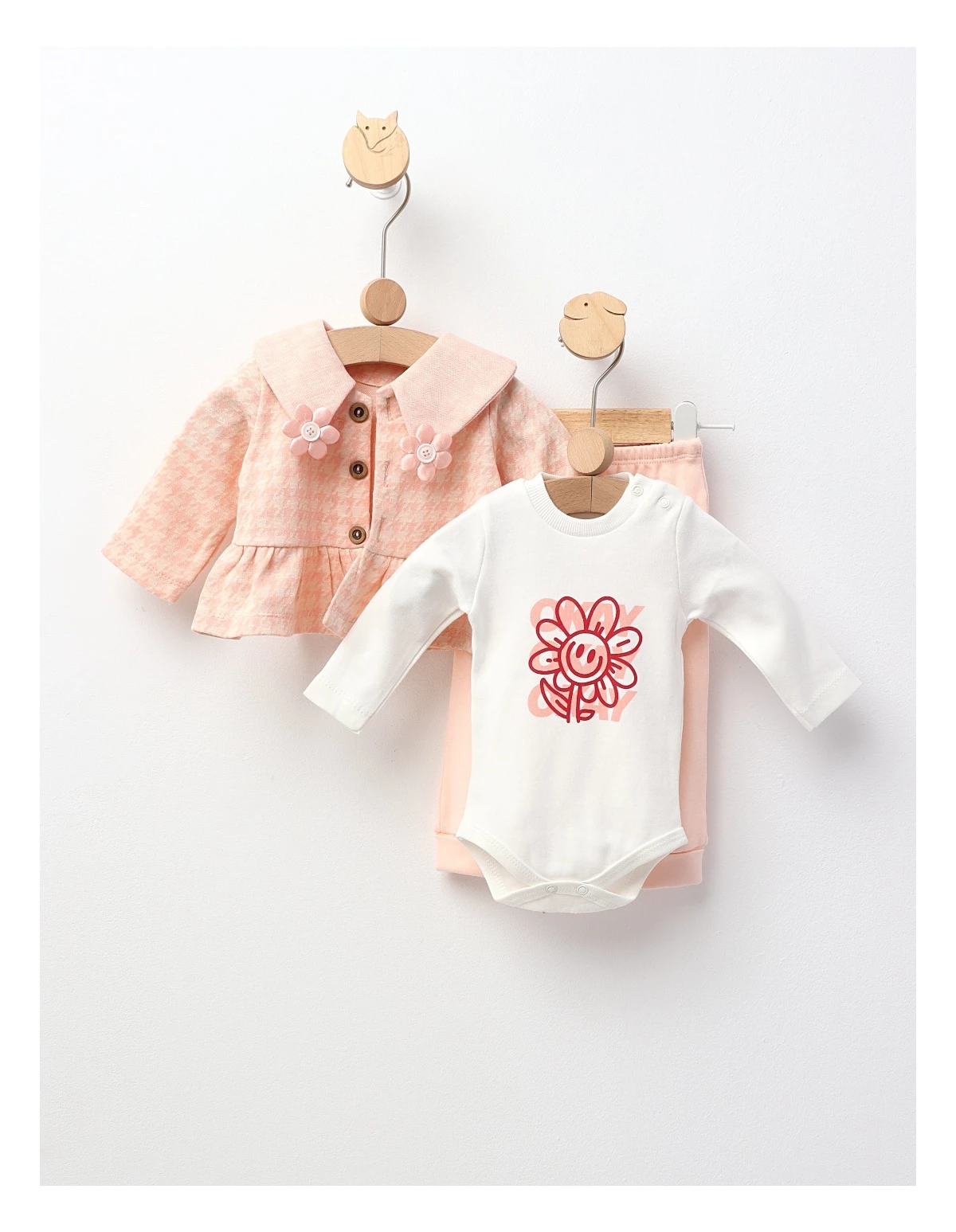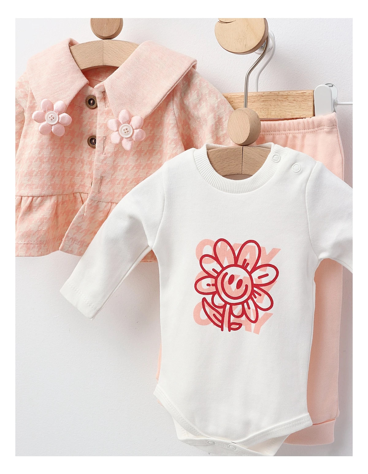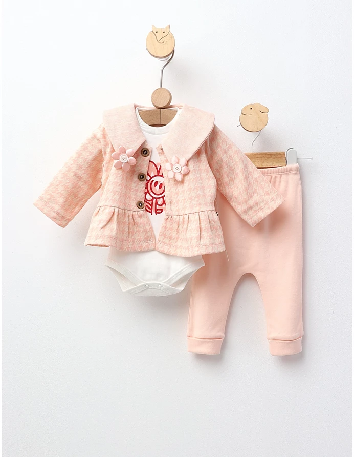 Set de 3 piese pentru bebeluțe, perfect pentru primele zile și momente speciale. Include o jacheta cu deschidere în nasturi, un body cu deschidere în capse, și pantaloni cu elastic în talie. Confecționat din 80% bumbac și 20% poliester, acest set oferă confort, siguranță și un aspect adorabil, ideal pentru odihnă și joacă în sezonul cald.