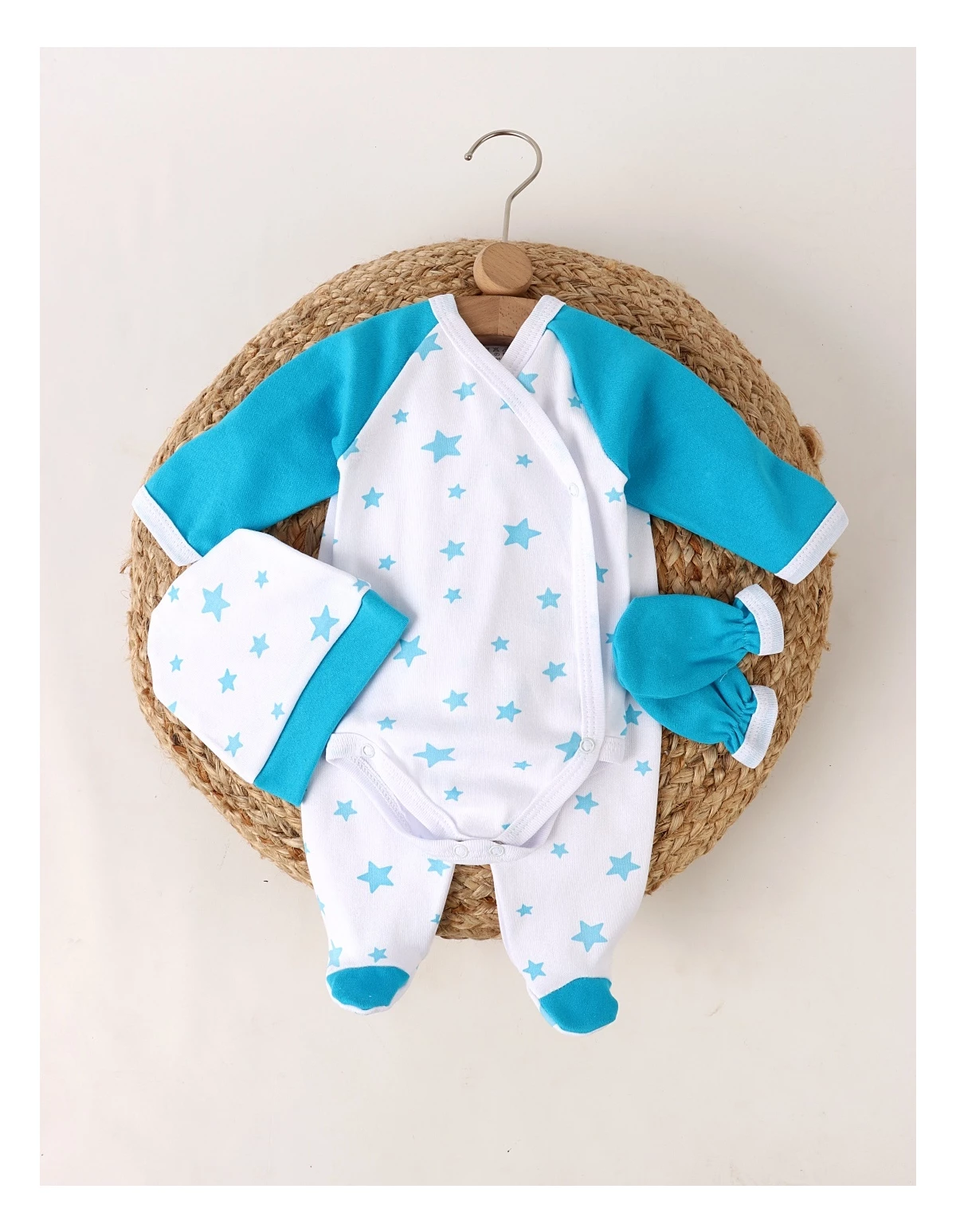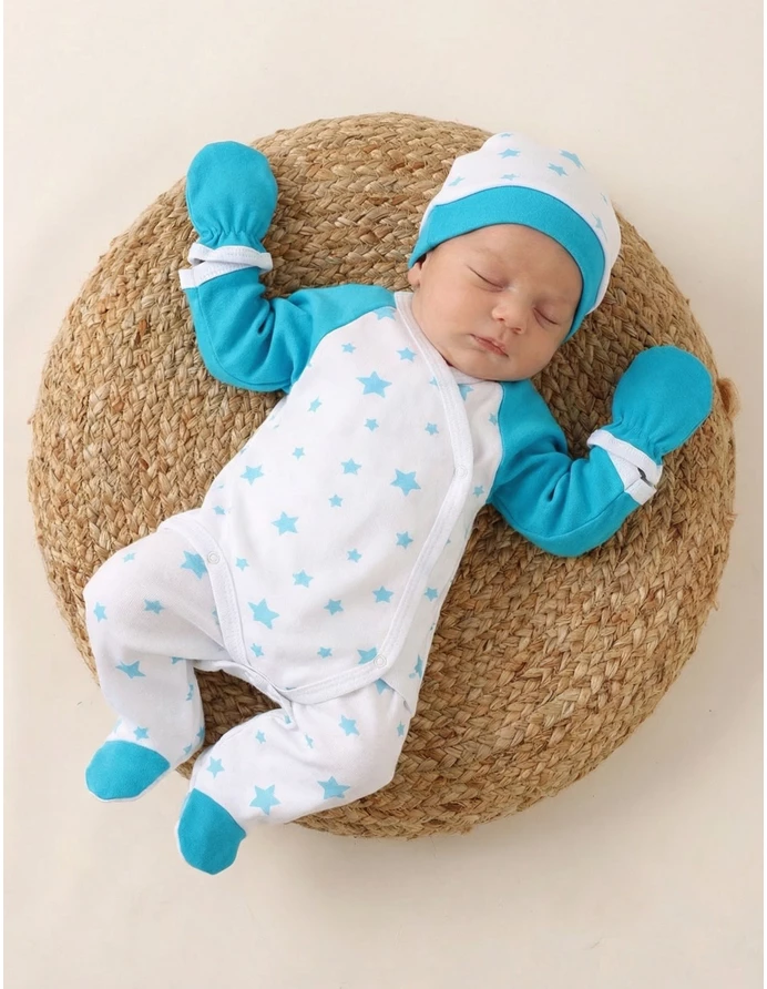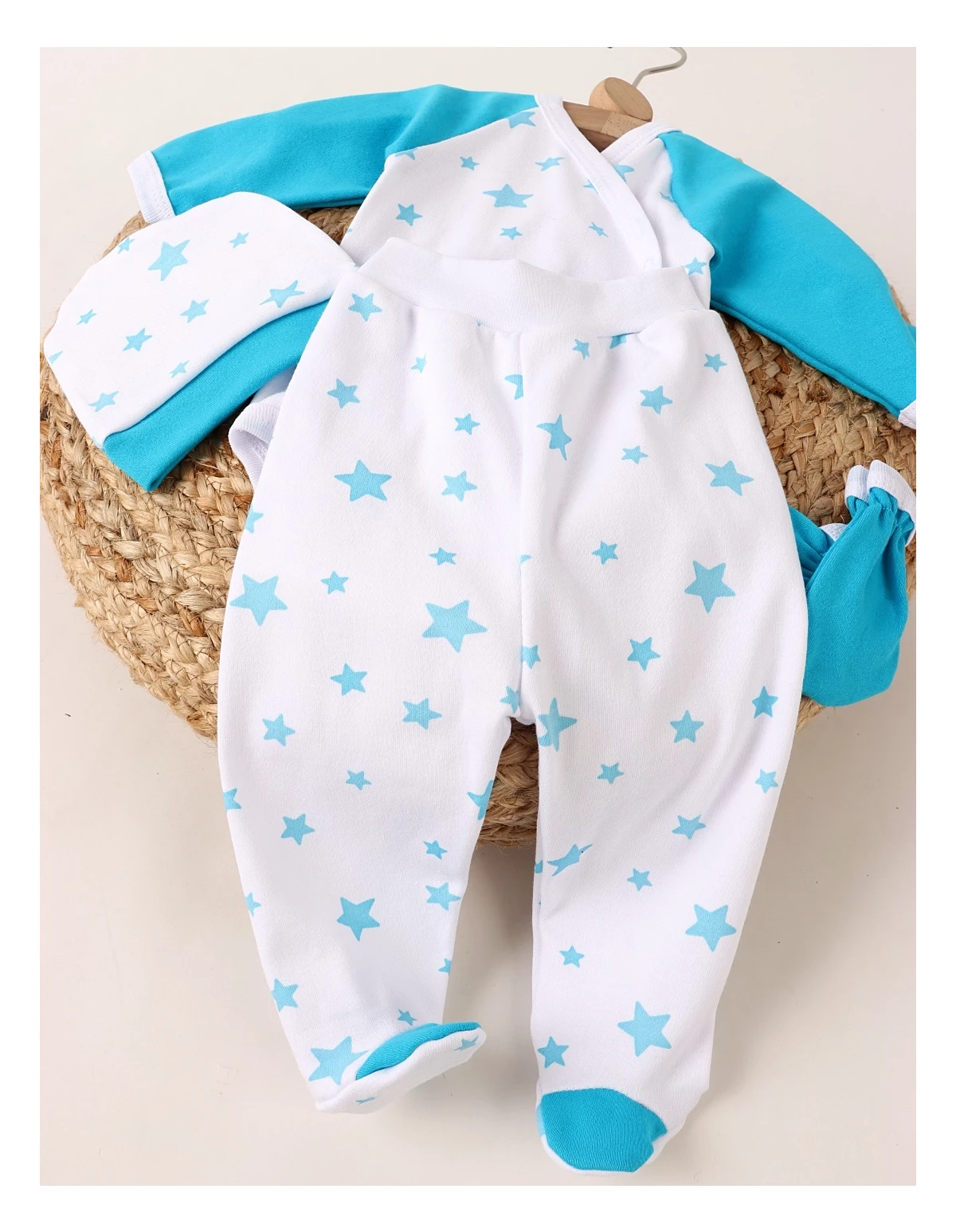Costumas 4 piese format din body cu maneca lunga deschide pe o parte cu capse, pantaloni model cu botosi,manusi si caciulita. Material 100% bumbac
