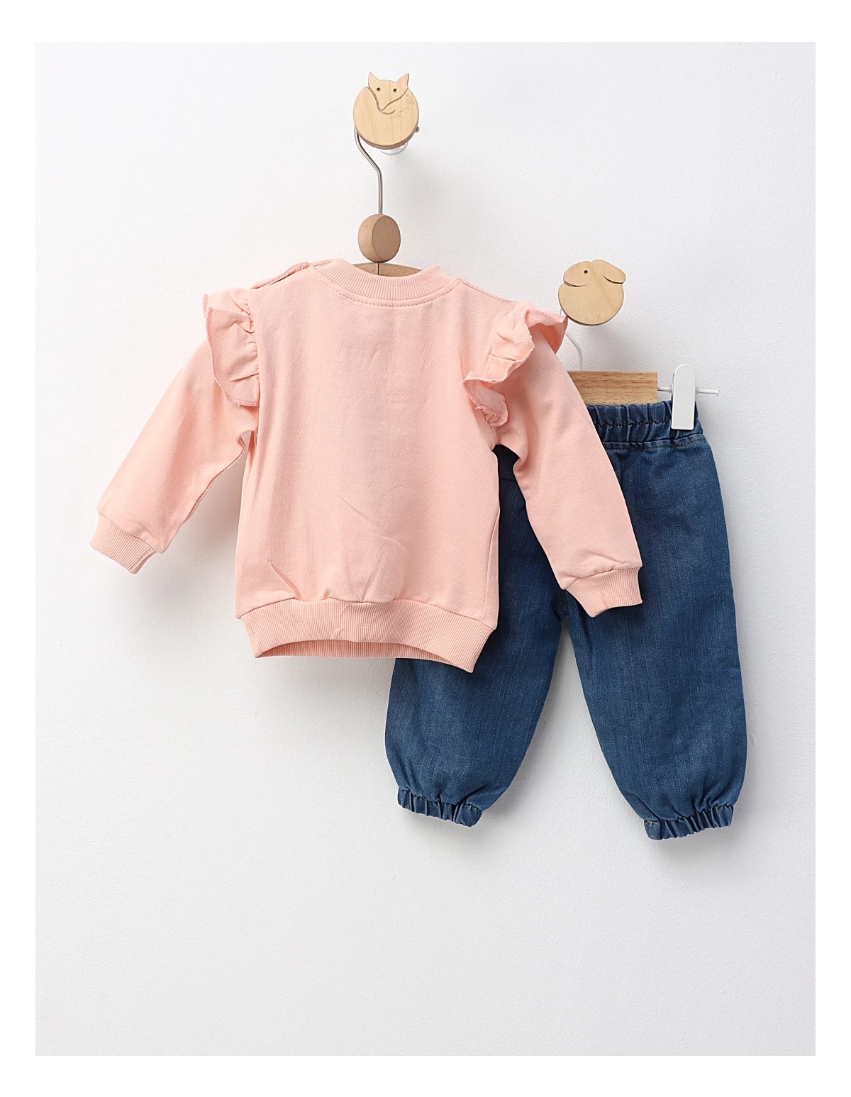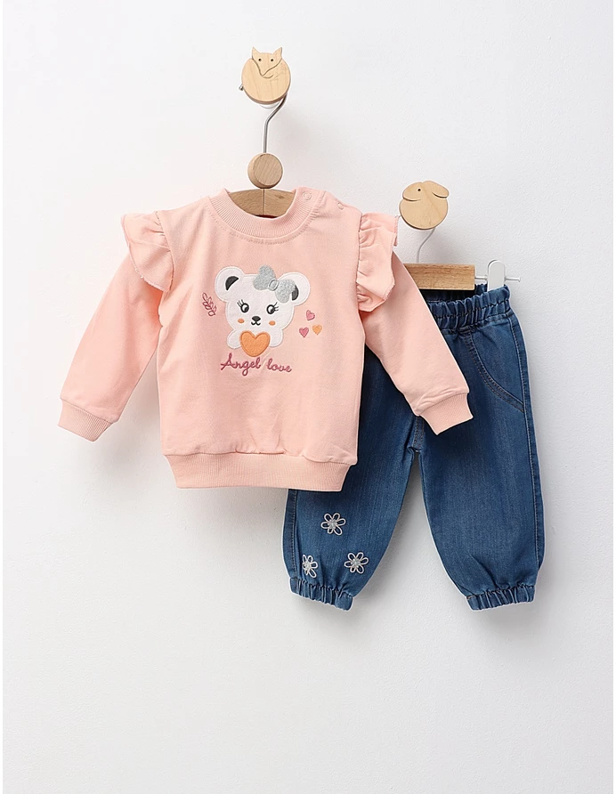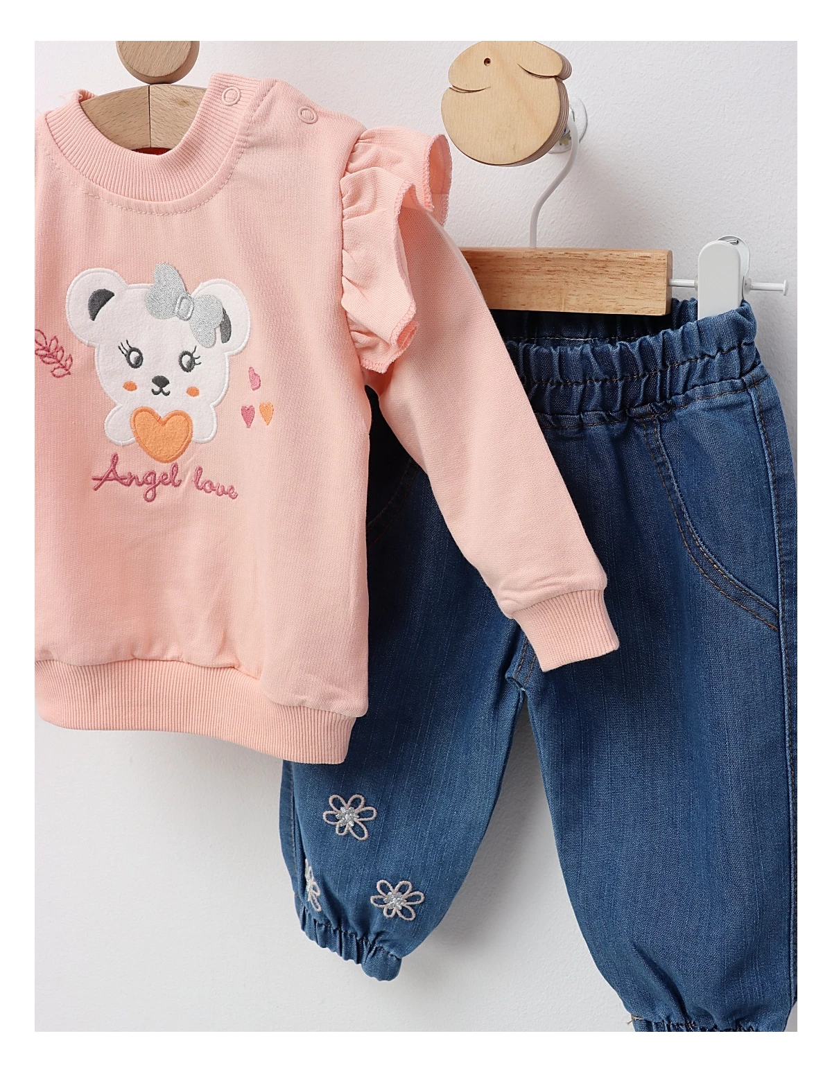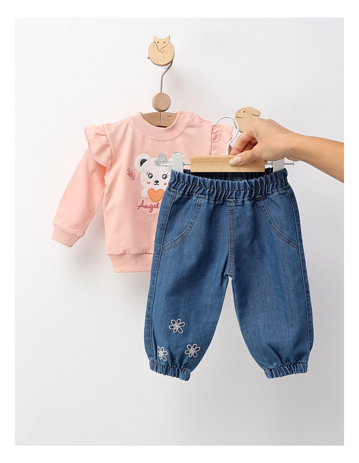 Costum pentru fetițe, format dintr-o bluză cu deschidere și volănașe pe umăr, decorată cu imprimeu cusut cu „Fetița ursulet” și pantaloni din blugi cu elastic în talie. Confecționat din 100% bumbac, acest set oferă confort, lejeritate și un stil drăgălaș, perfect pentru zilele de activitate sau plimbări în sezonul cald.