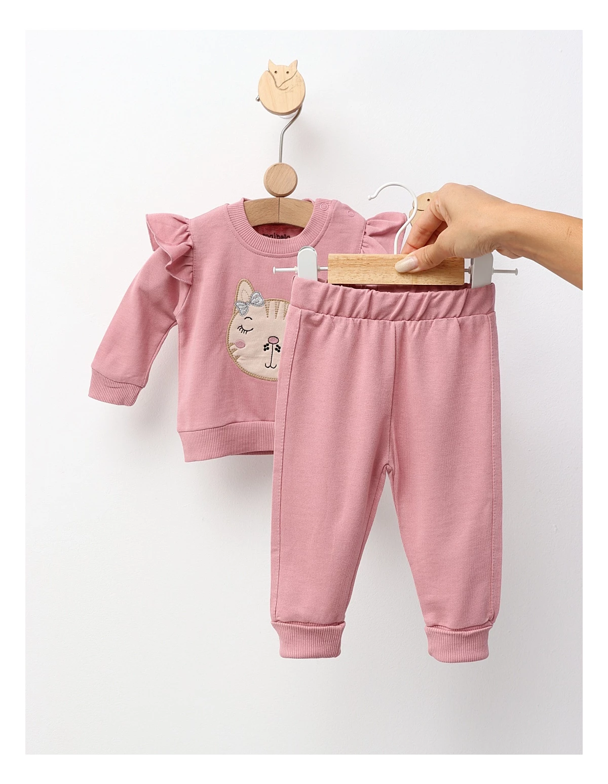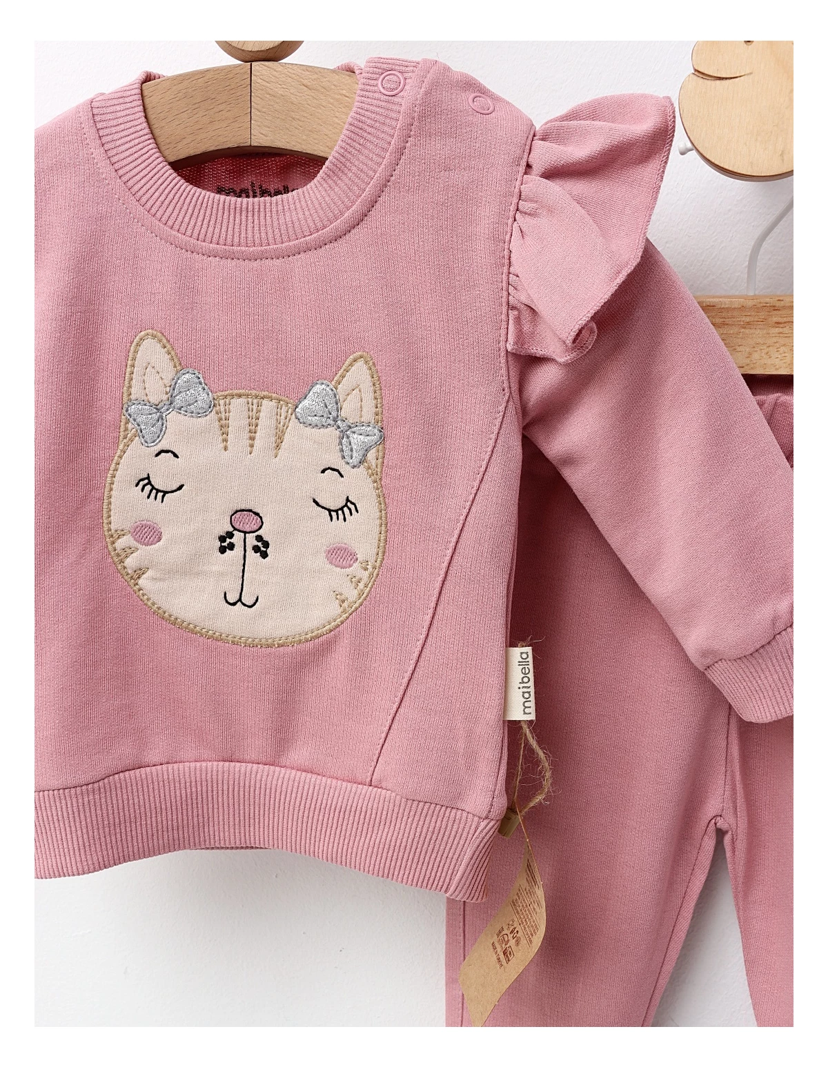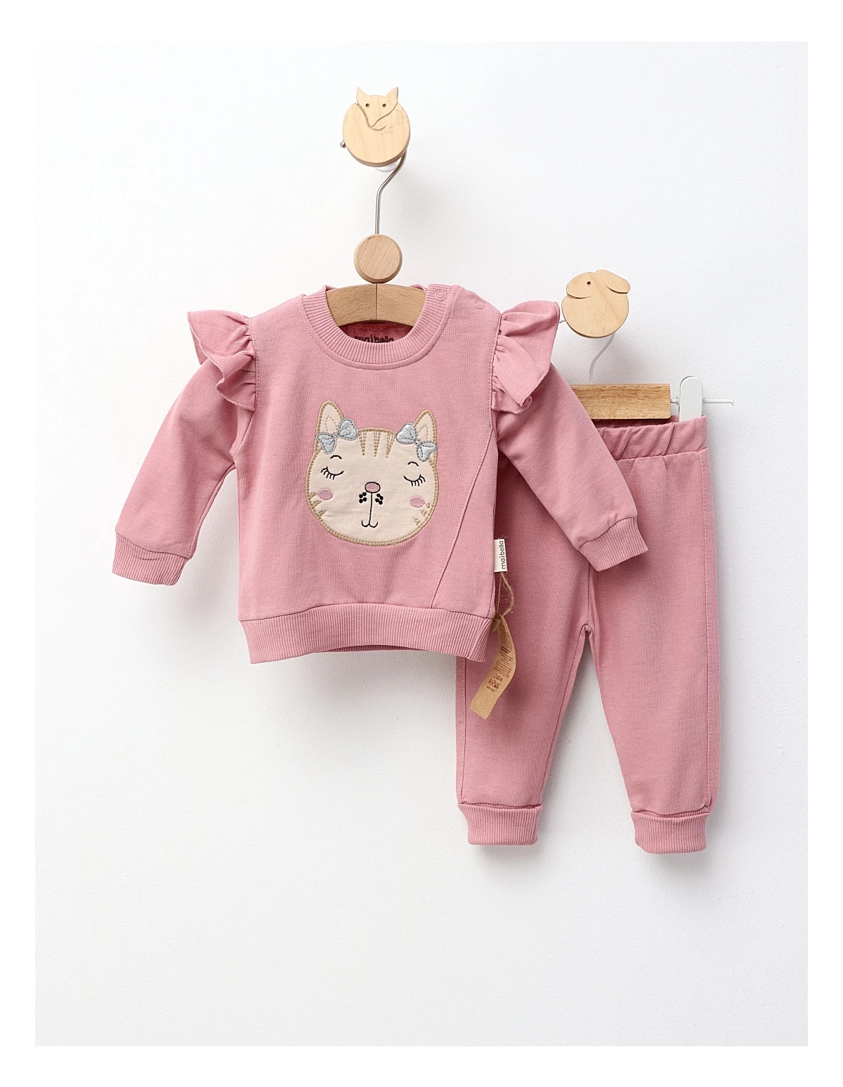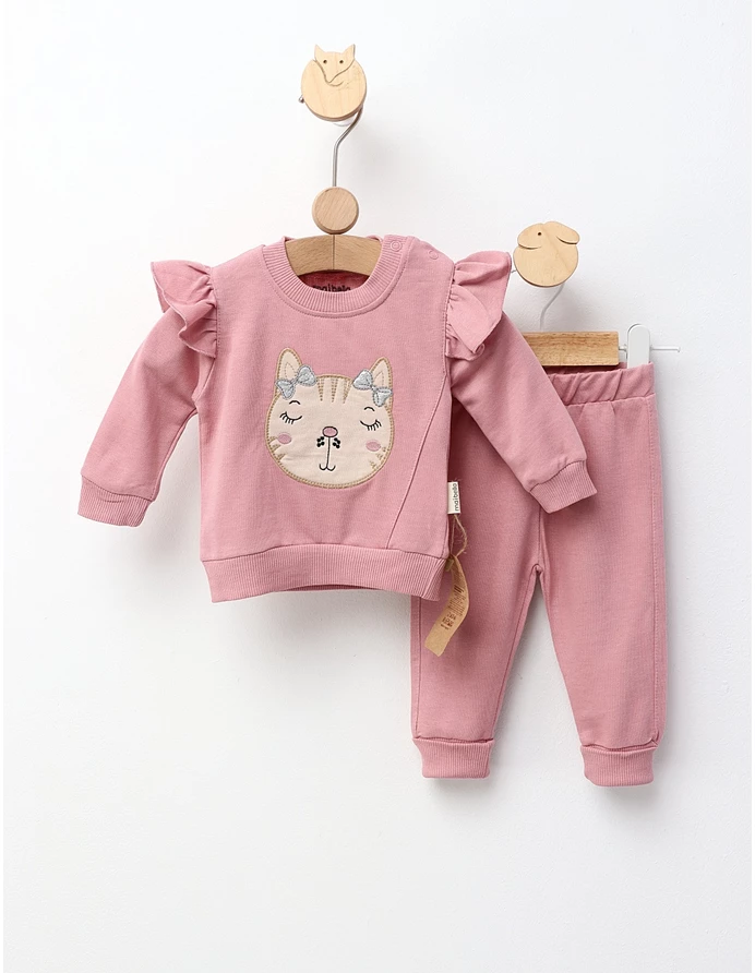 Costum pentru fetițe, format dintr-o bluză cu volănașe pe umeri și deschidere în capse pe umăr, cu imprimeu cusut cu pisicuță și fundiță, și pantaloni cu elastic în talie. Confecționat din 100% bumbac, acest set asigură confort, libertate de mișcare și un stil adorabil, perfect pentru zilele de joacă sau plimbări în sezonul cald.