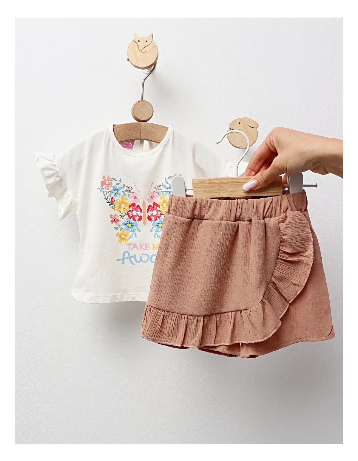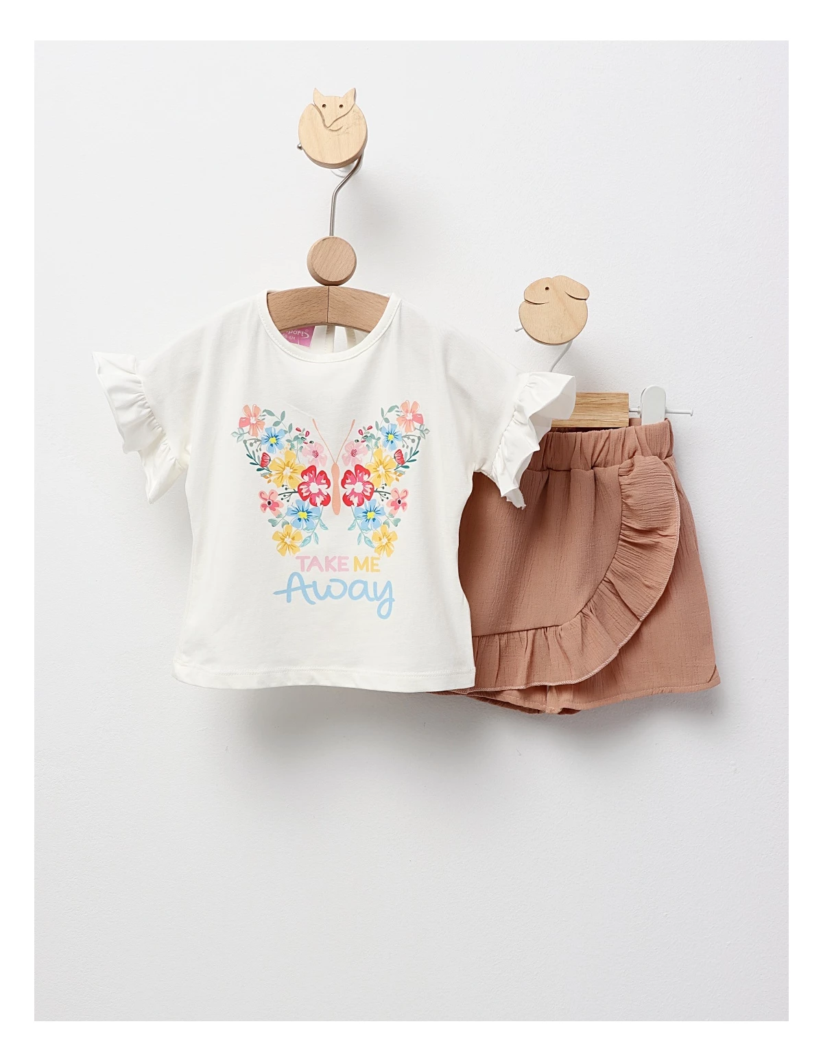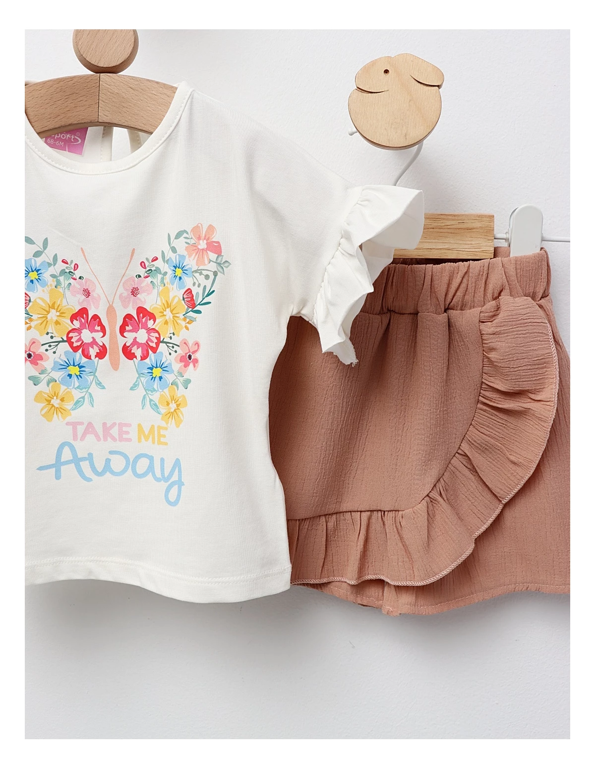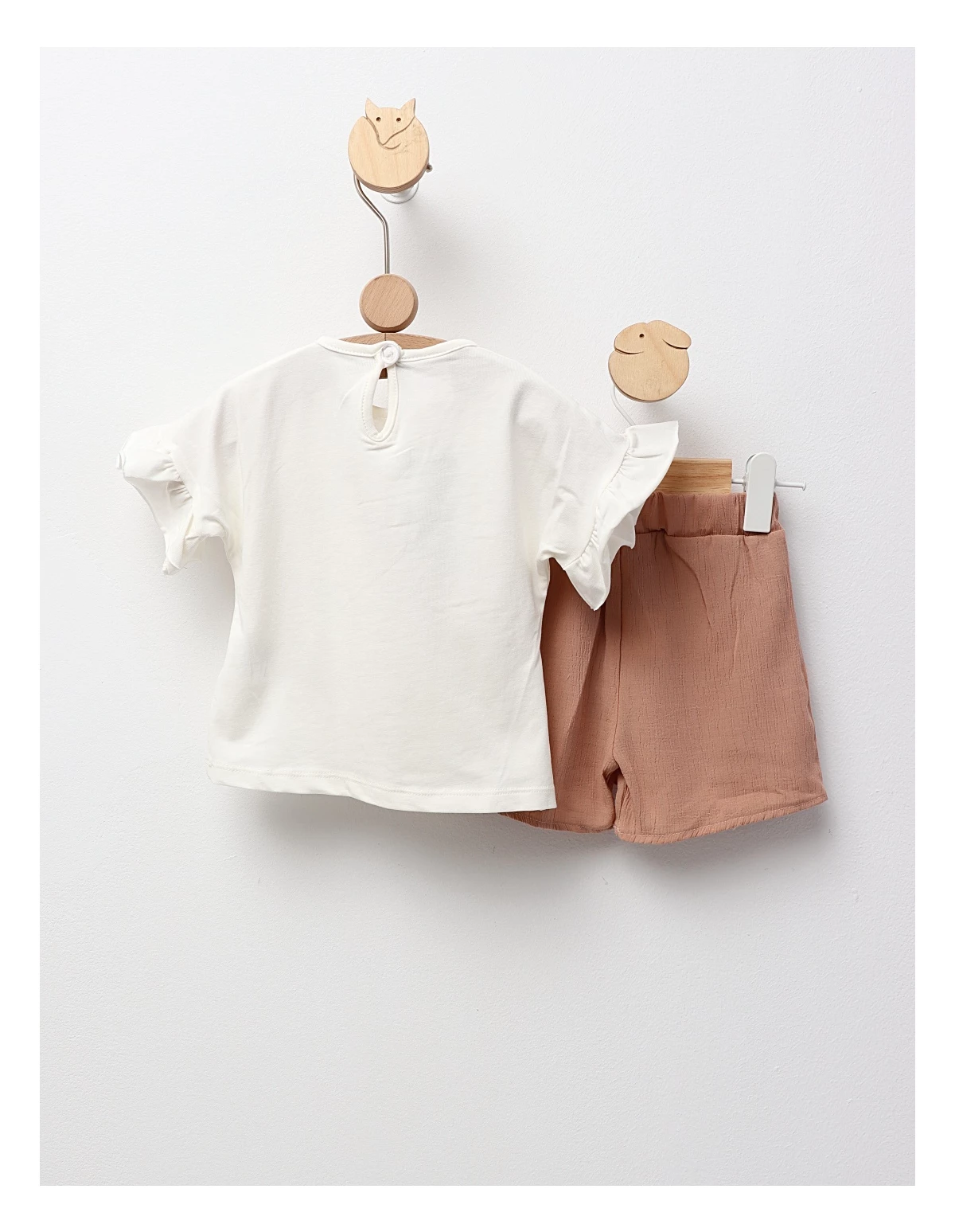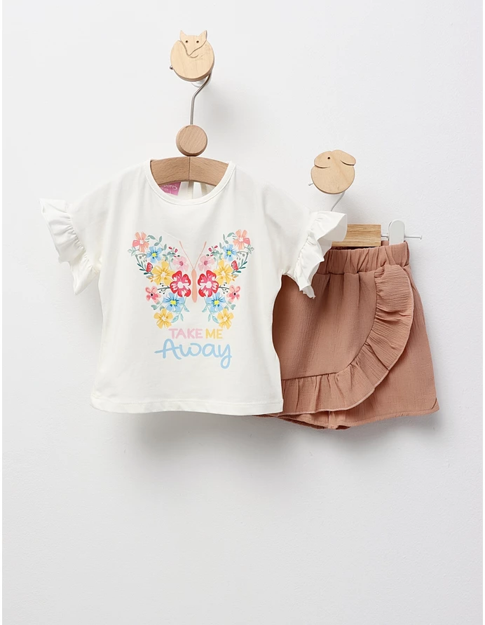 Costum de vară pentru fetițe, format dintr-un tricou cu mânecă scurtă și design evazat, cu deschidere în nasture în partea din spate, decorat cu fundiță și imprimeu cu floricele. Complează ținuta cu pantaloni scurți cu elastic în talie, realizați din material licra. Confecționat din 95% bumbac și 5% licra, acest set oferă confort, libertate de mișcare și un stil feminin, ideal pentru zilele calde, plimbări și evenimente speciale.