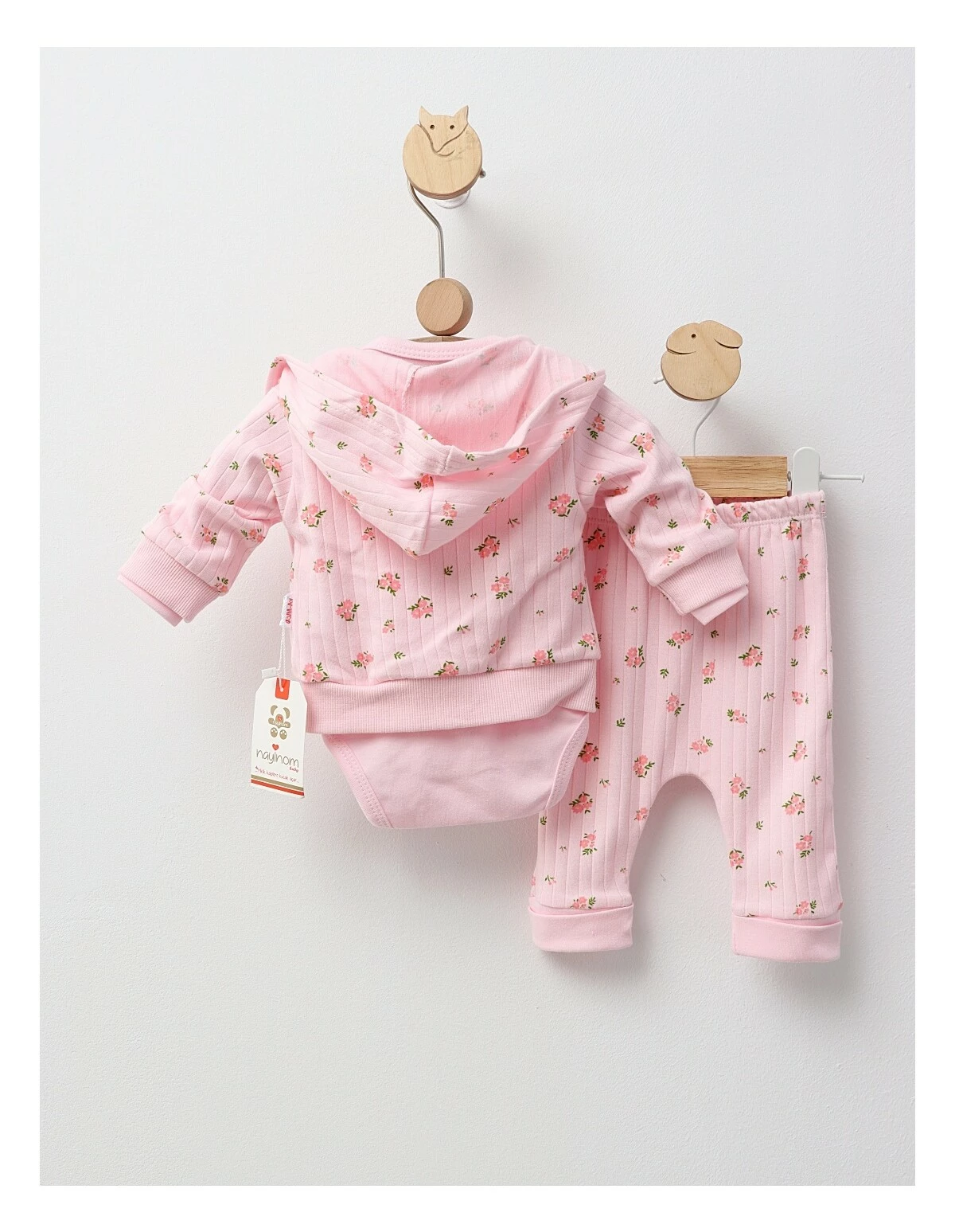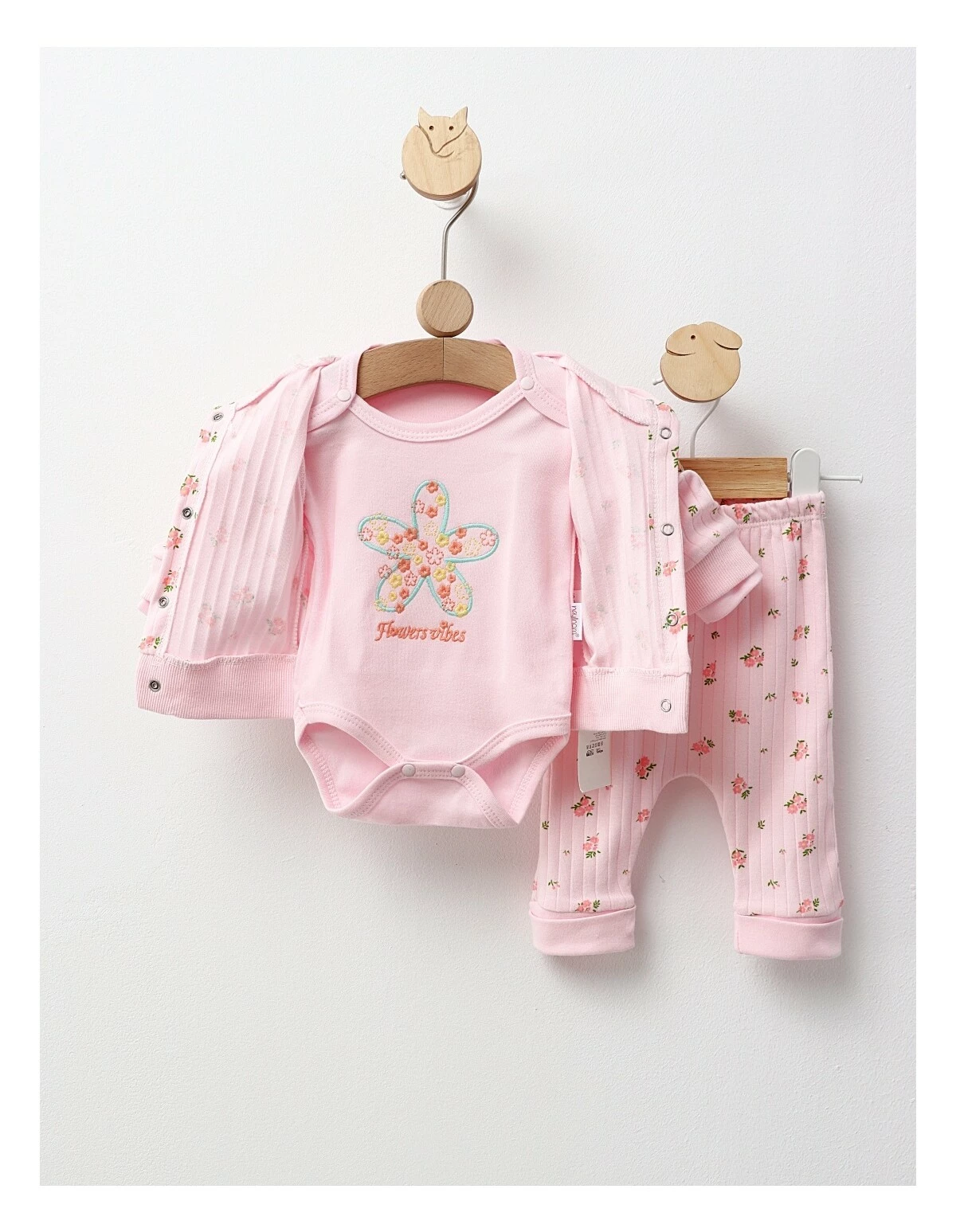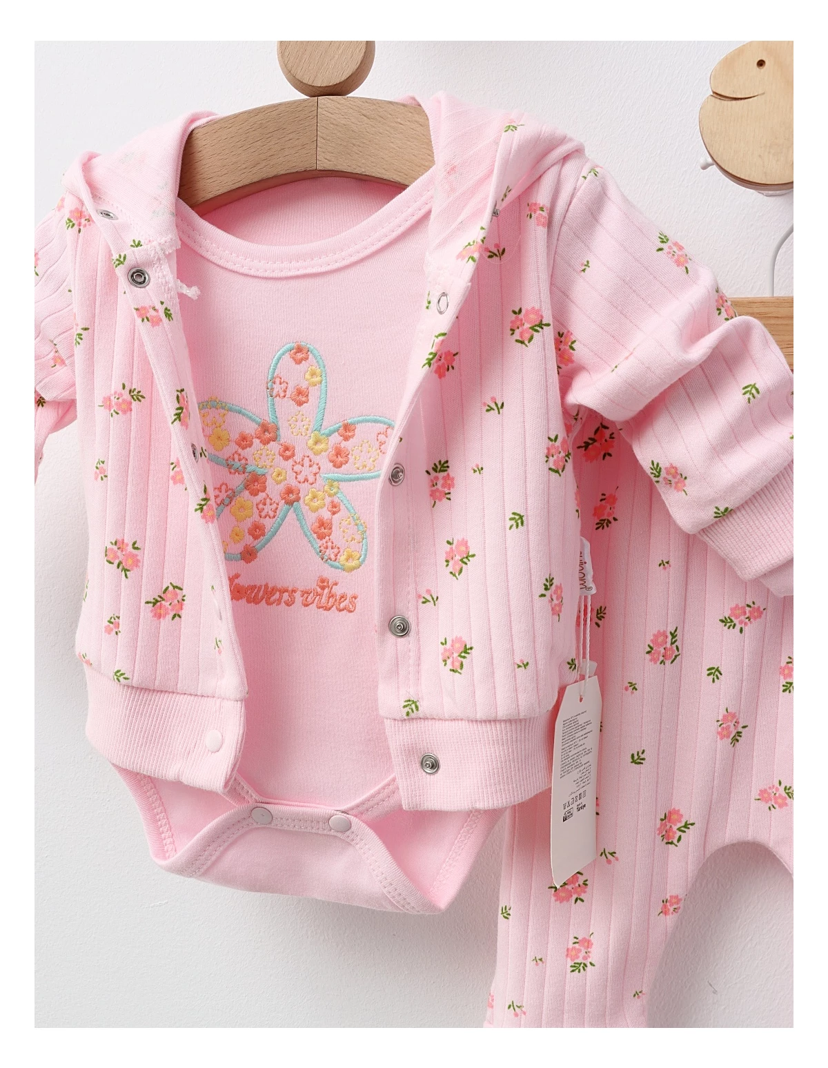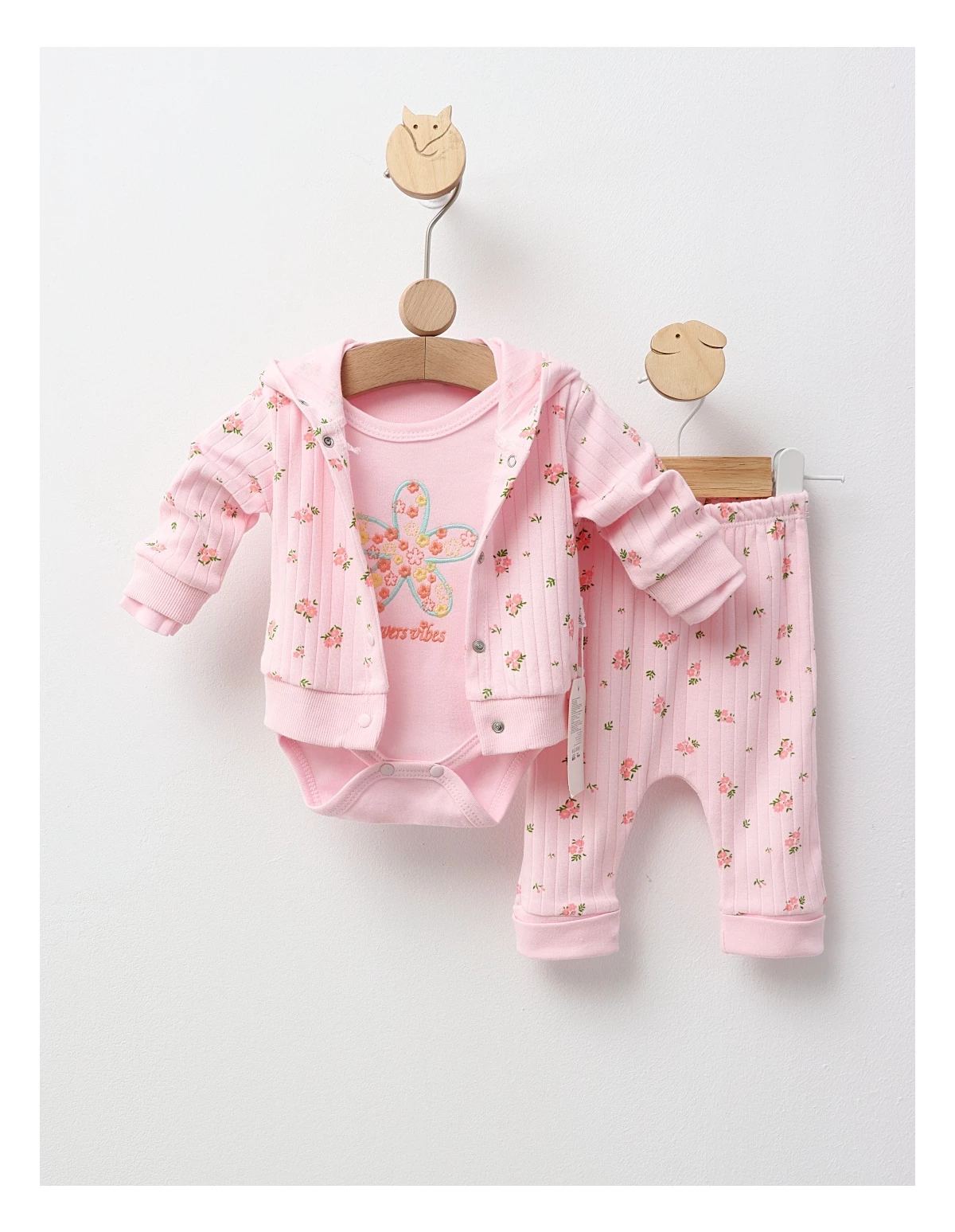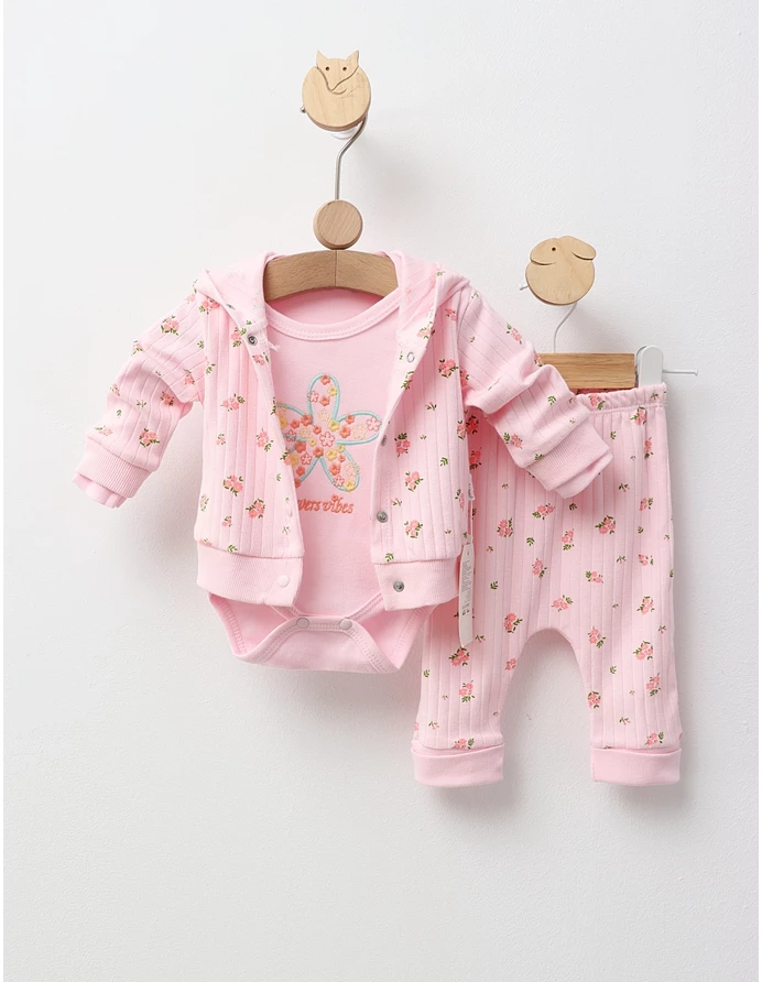 Costumul pentru fetițe include un hanorac cu glugă și deschidere în capse, decorat cu imprimeuri cu floricele, un body cu mânecă lungă și mesajul 'Flowers Vibes', și pantaloni cu elastic în talie. Fabricat din 100% bumbac, acest set asigură confort și stil, fiind perfect pentru zilele de joacă.