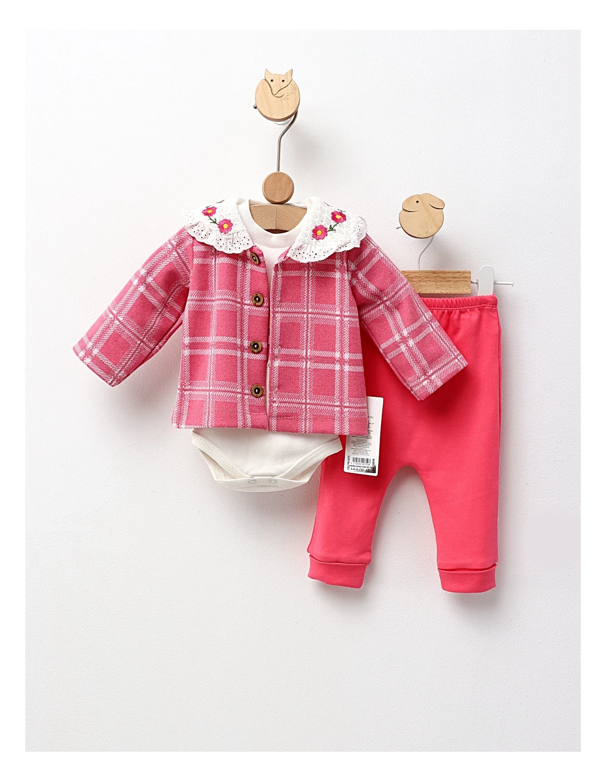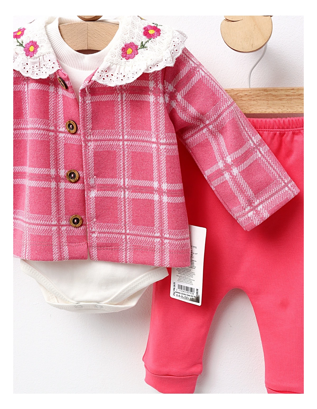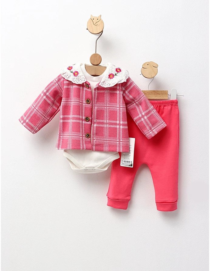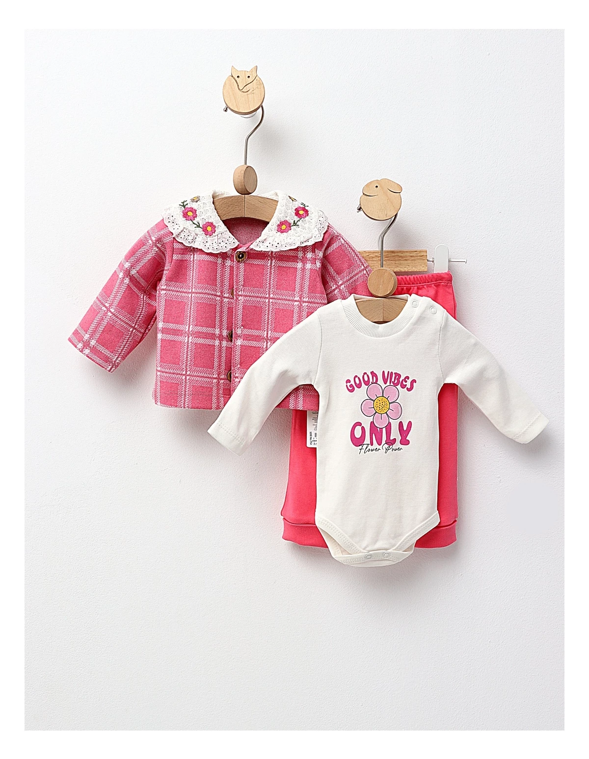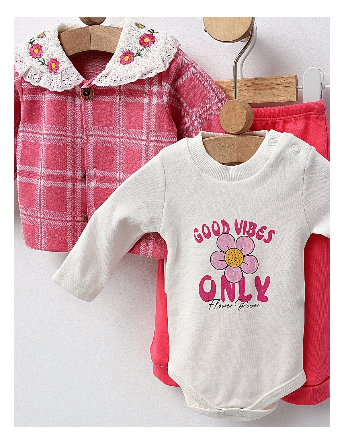 Set de 3 piese pentru bebeluțe, ideal pentru cele mai speciale momente. Include o bluză cu deschidere în nasturi, cu guler brodat și detalii floricele, confecționată din material cu sclipici pentru un aspect festiv, un body cu deschidere în capse și imprimeu cu mesajul "Good Vibes Only", și pantaloni cu elastic în talie, din 80% bumbac și 20% poliester. Acest set aduce confort, eleganță și un stil adorabil pentru micuța ta.