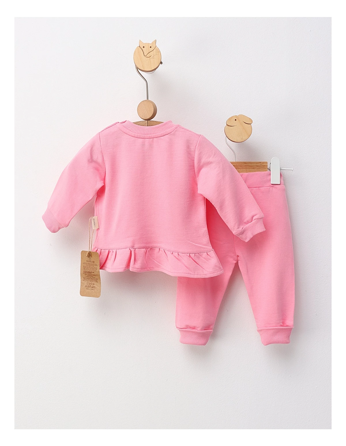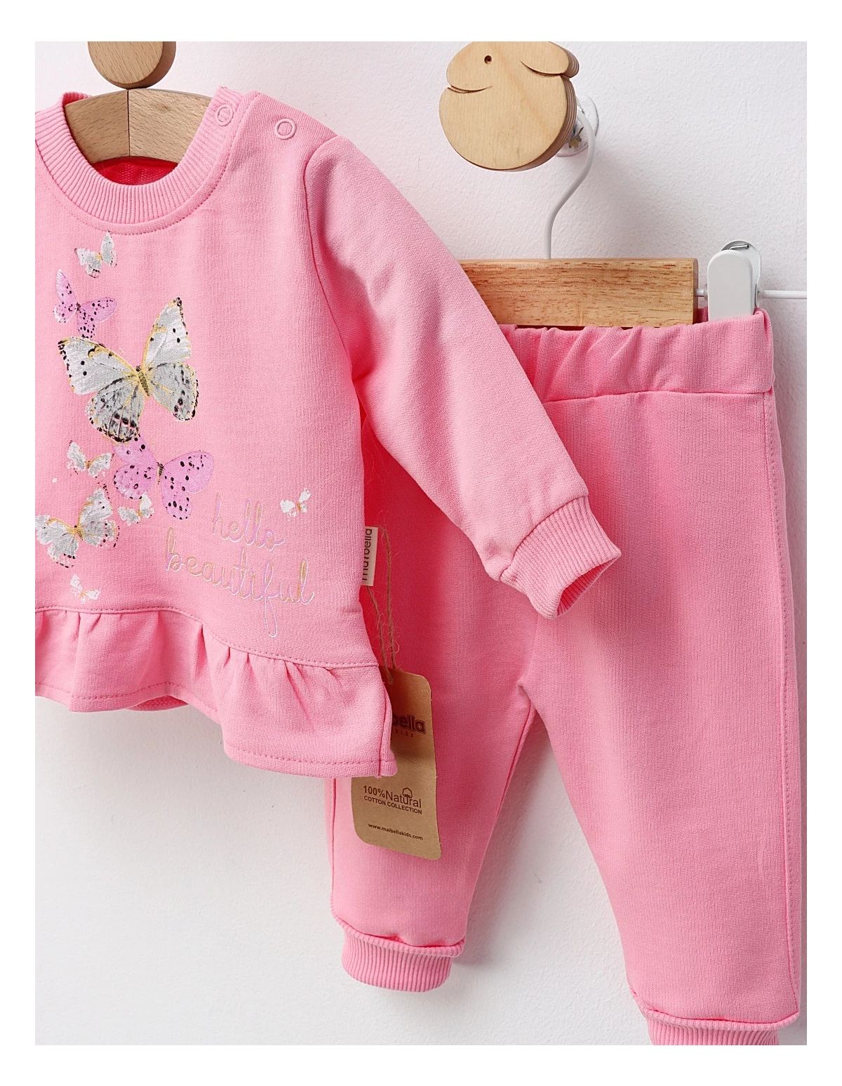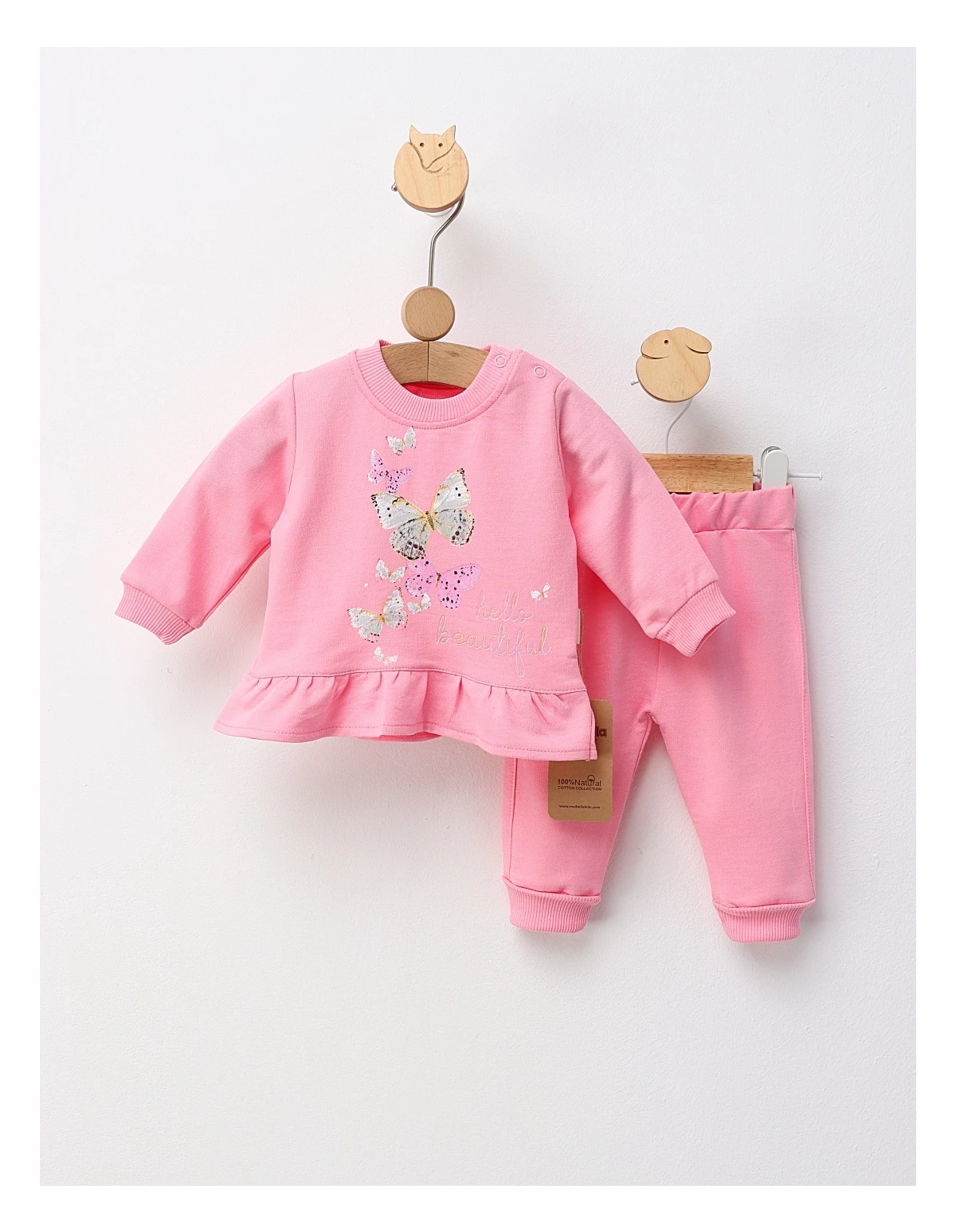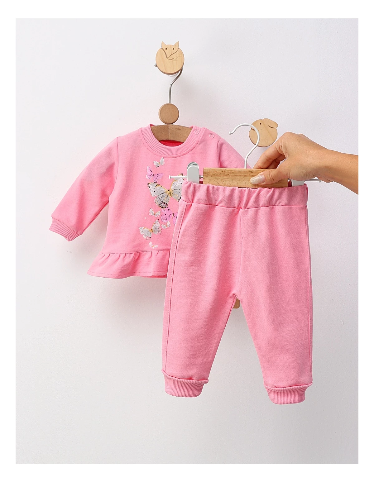 Costum pentru fetițe, format dintr-o bluză evazata și deschidere în capse pe umăr, decorată cu imprimeu cu fluturasi. Completați ținuta cu pantaloni cu elastic în talie. Confecționat din 100% bumbac, acest set oferă confort, libertate de mișcare și un stil adorabil, ideal pentru zilele active sau plimbări în sezonul cald.