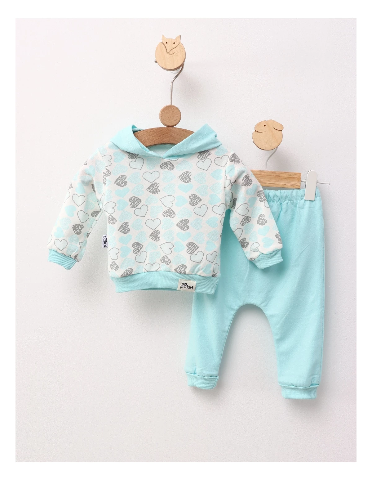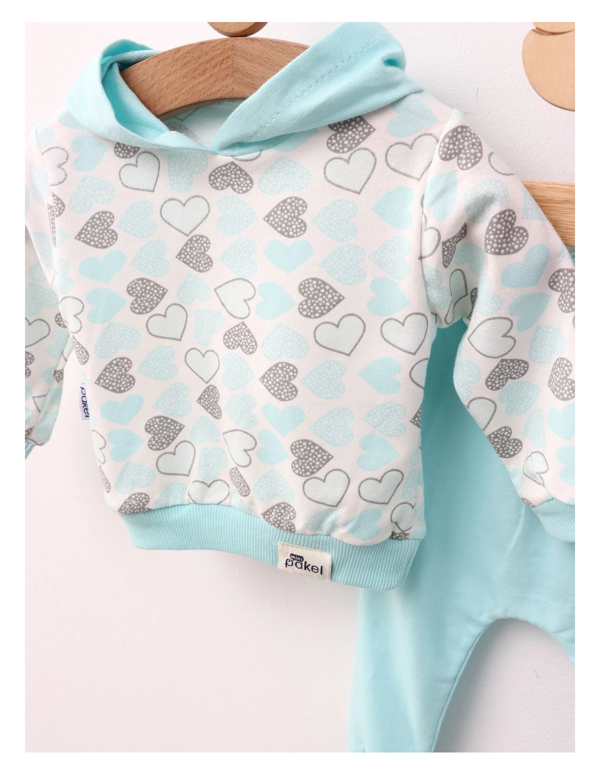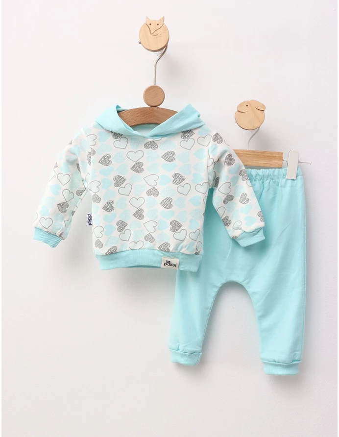 Costumul pentru fetițe include un hanorac cu glugă și pantaloni. Amândouă decorate cu imprimeuri cu inimioare sclipitoare. Fabricat din 100% bumbac, acest set oferă confort și blândețe.