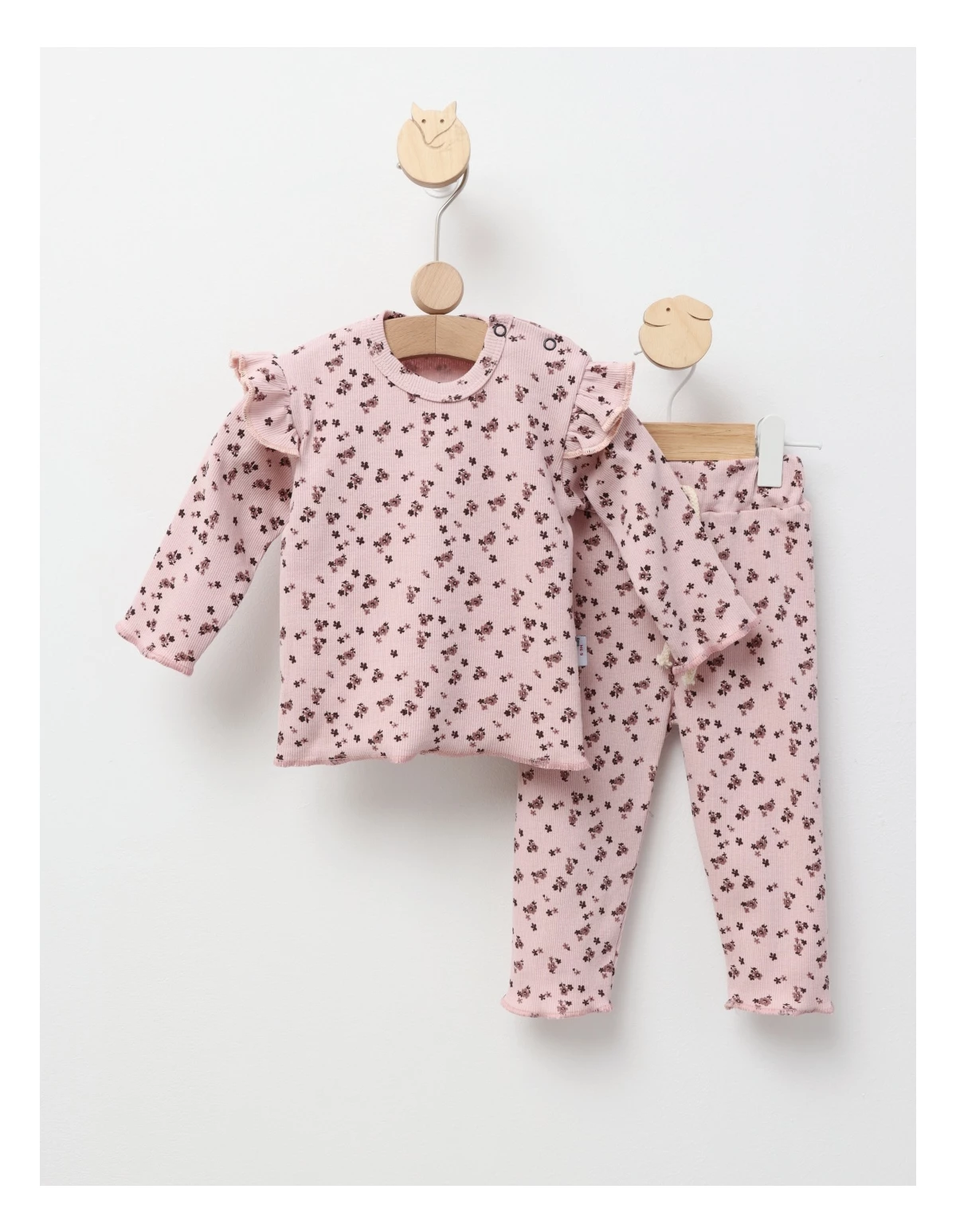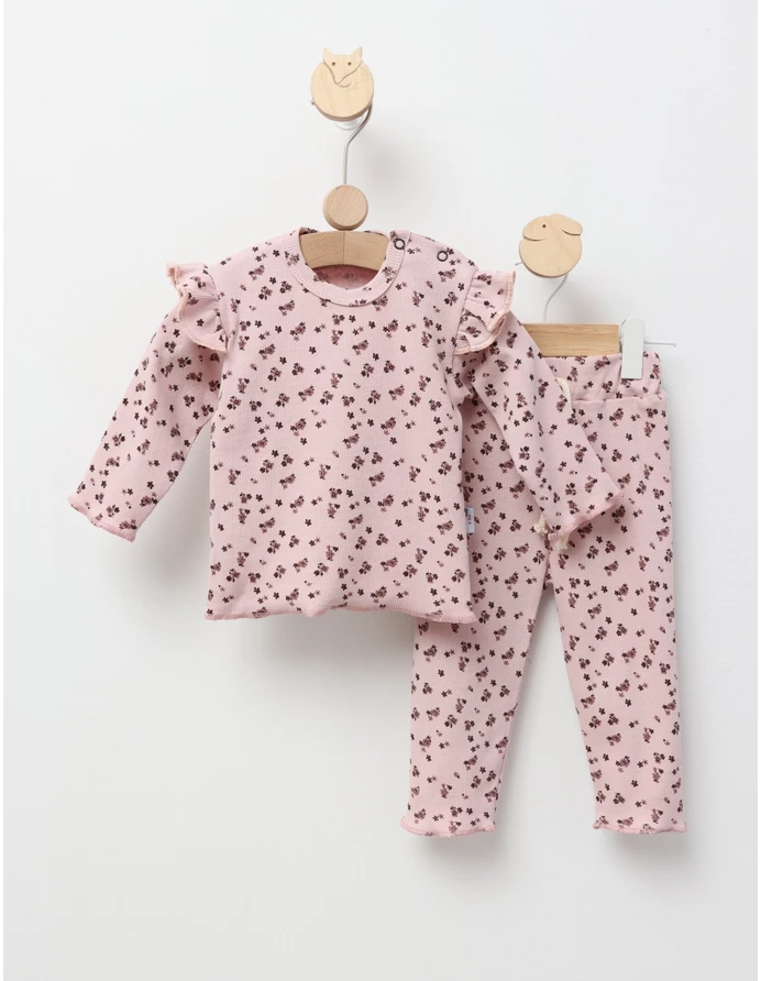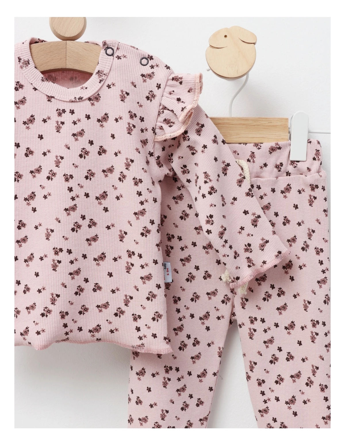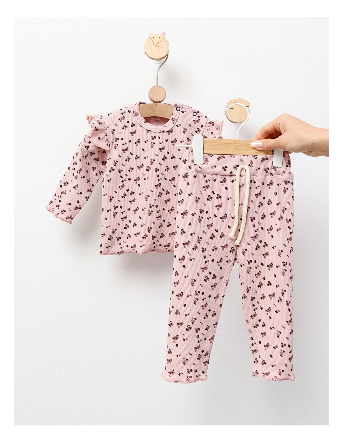 Costumul pentru fetițe este un set drăguț format dintr-o bluză cu volănașe pe umeri și deschidere în capse pe umăr, decorată cu un imprimeu floral adorabil. Acesta este completat de pantaloni cu elastic în talie pentru o potrivire confortabilă. Fabricat din 100% bumbac, acest set asigură confort și blândețe pentru pielea delicată a fetițelor.