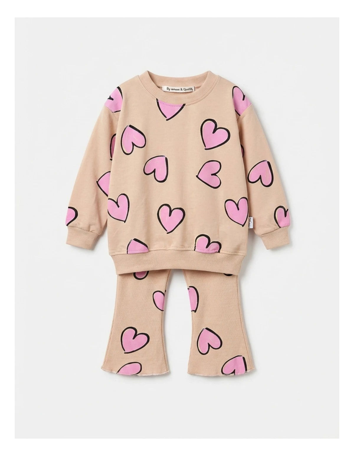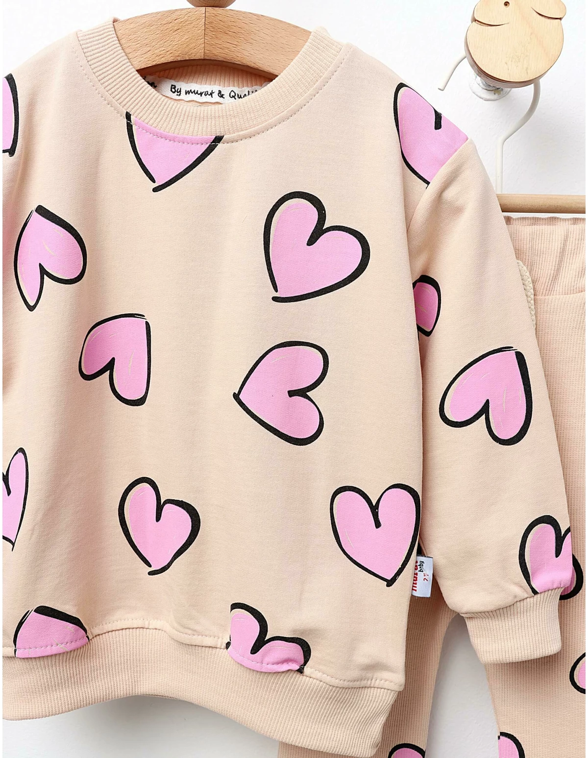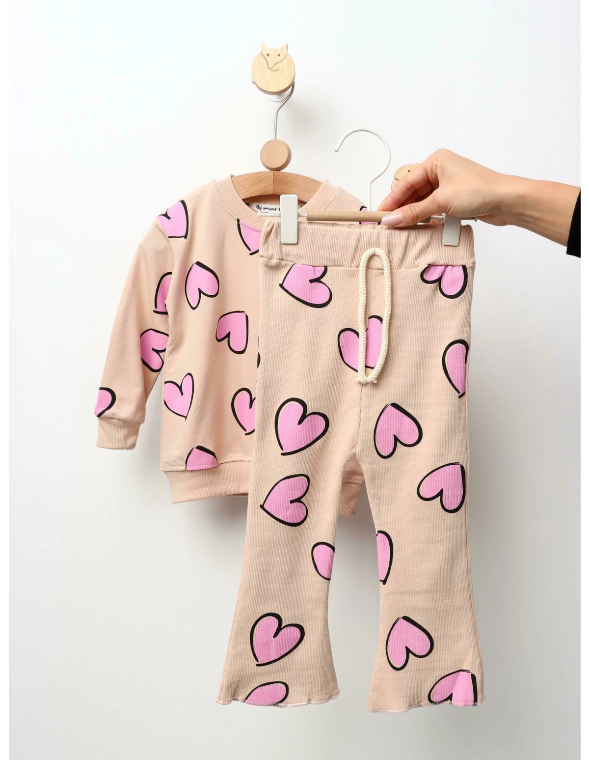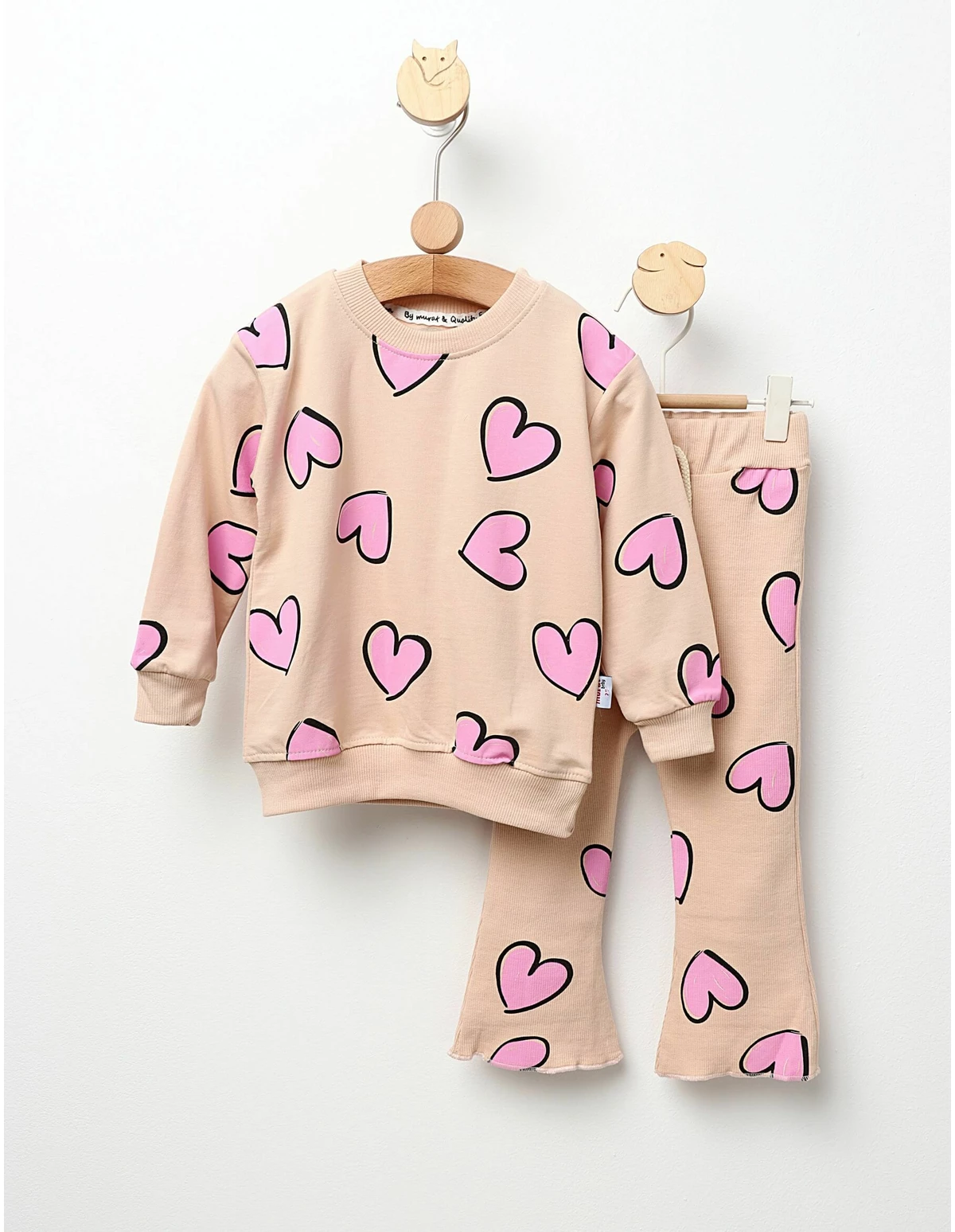 Costumaș pentru fetițe, adorabil și confortabil, ideal pentru orice ocazie. Acest set include o bluză decorată cu imprimeuri cu inimioare și pantalonași stil colanți, cu elastic în talie și evazați în partea de jos. Fabricat din 100% bumbac, costumul asigură o purtare lejeră și plăcută. Perfect pentru joacă sau evenimente speciale, acest costum adaugă un strop de răsfăț în garderoba fetiței tale. Disponibil în diverse dimensiuni, este alegerea ideală pentru micile fashioniste.