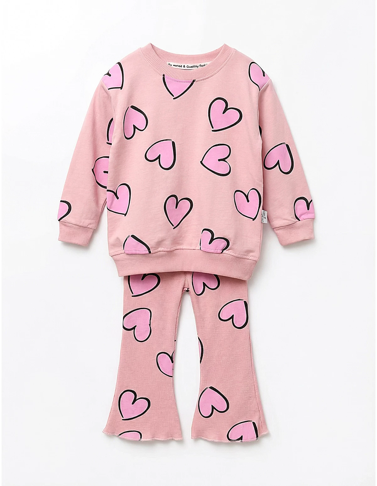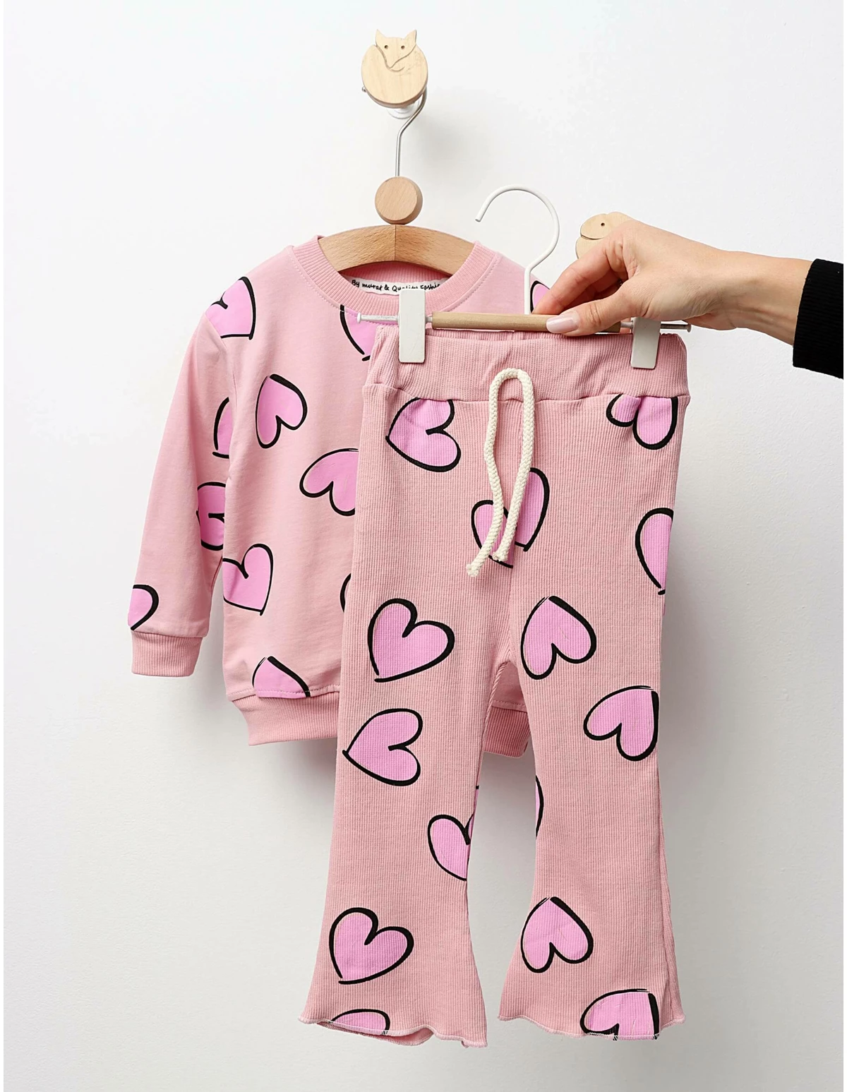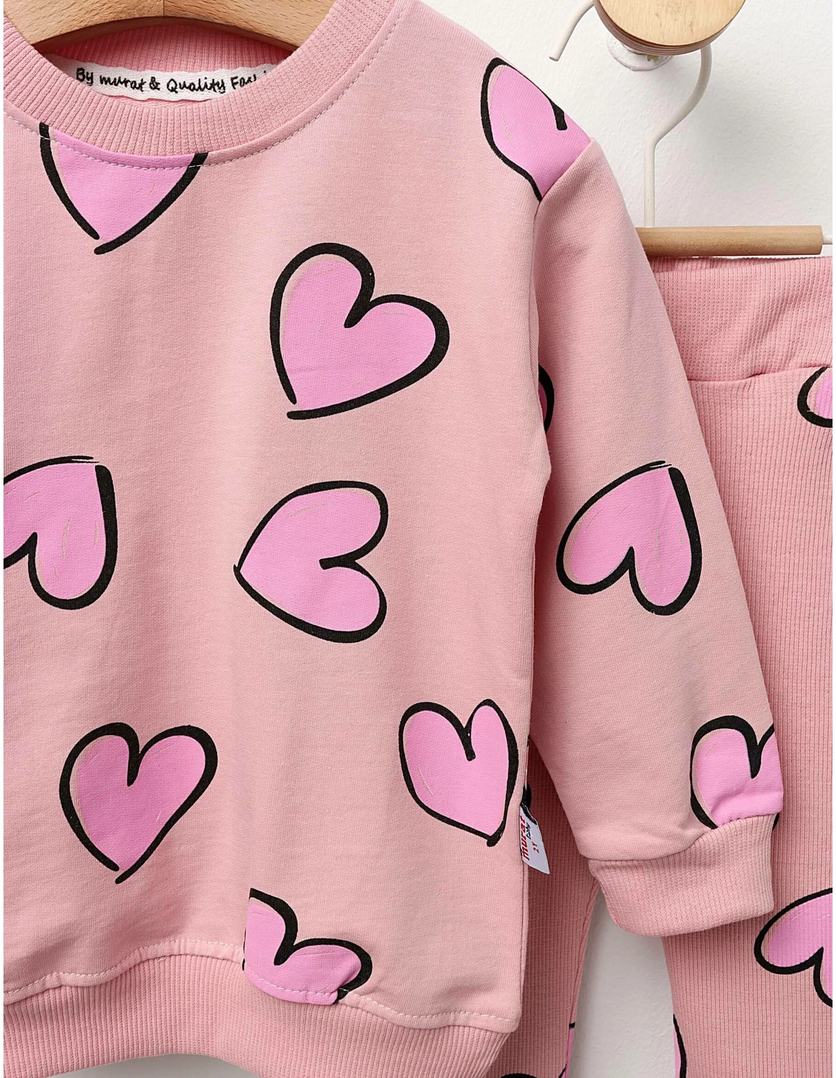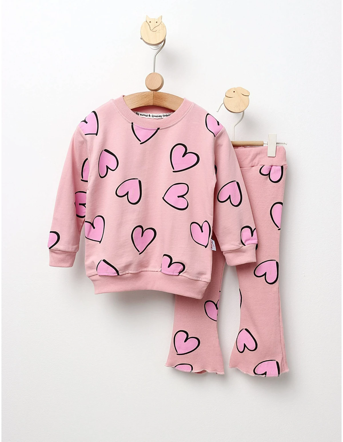 Costumaș pentru fetițe, adorabil și confortabil, ideal pentru orice ocazie. Acest set include o bluză decorată cu imprimeuri cu inimioare și pantalonași stil colanți, cu elastic în talie și evazați în partea de jos. Fabricat din 100% bumbac, costumul asigură o purtare lejeră și plăcută. Perfect pentru joacă sau evenimente speciale, acest costum adaugă un strop de răsfăț în garderoba fetiței tale. Disponibil în diverse dimensiuni, este alegerea ideală pentru micile fashioniste.