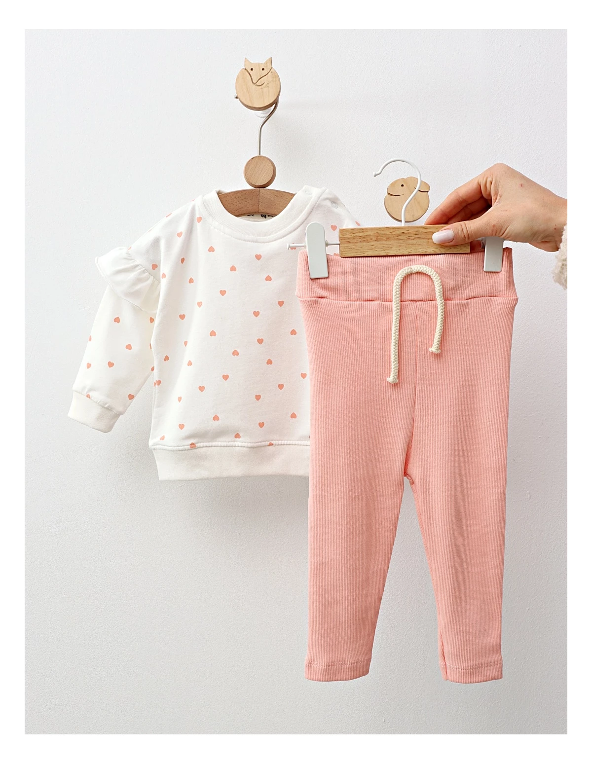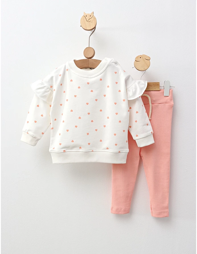 Costumul pentru fetițe este un set adorabil și confortabil, perfect pentru micile domnișoare care iubesc să se joace cu stil. Acesta include o bluză cu deschidere în capse pe umăr, care facilitează îmbrăcarea rapidă și ușoară. Bluzita este decorată cu imprimeuri drăguțe cu inimioare, adăugând o notă de veselie și romantism. Pantalonașii au un design stil colant și sunt dotați cu elastic în talie, asigurând o potrivire confortabilă și flexibilitate pentru toate activitățile de zi cu zi. Fabricat din material de calitate premium 100% bumbac, acest costumas este blând cu pielea delicată a fetițelor, oferind o senzație plăcută și respirabilitate optimă. Ideal pentru joacă, excursii sau momente speciale, acest set devine rapid un favorit în garderoba fetiței tale.