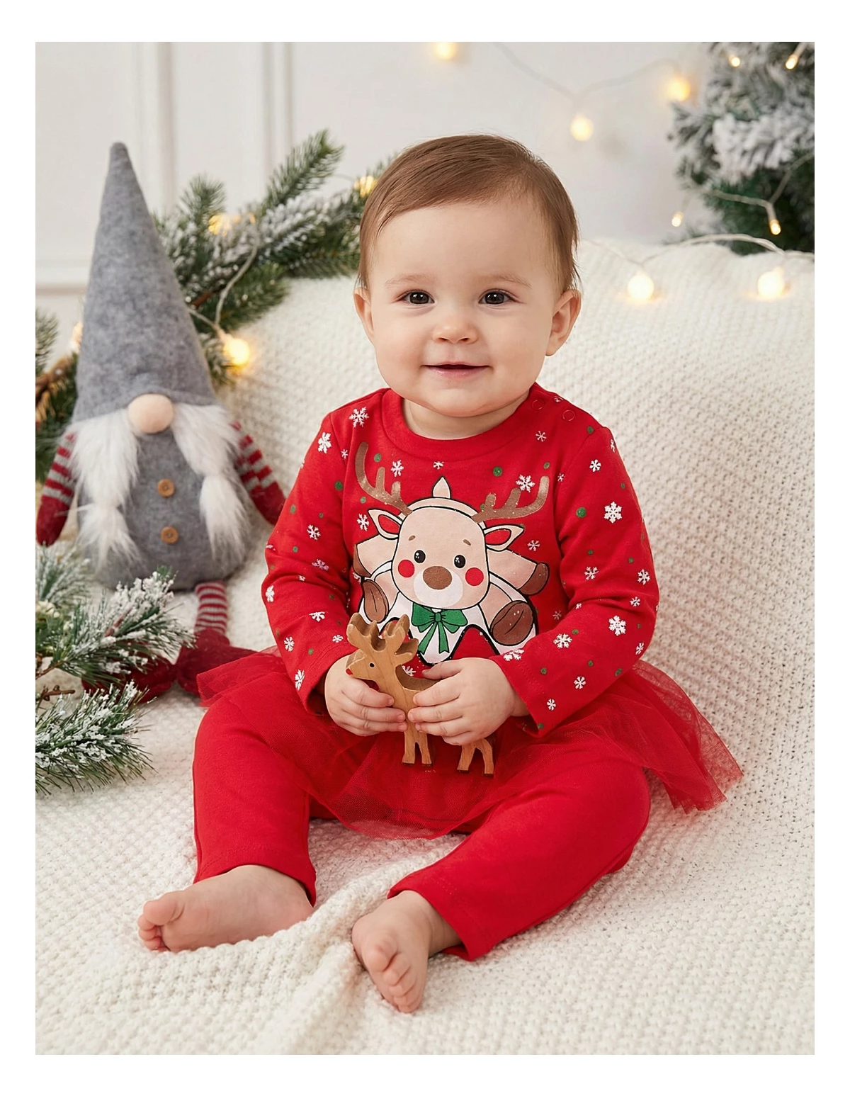 Costumaș festiv de Crăciun pentru fetițe, perfect pentru a adăuga magie sărbătorilor! Acest set adorabil include un body cu deschidere în capse, decorat cu un imprimeu jucăuș de ren cu cornite strălucitoare, împreună cu pantalonși confortabili, prevăzuți cu elastic în talie. Confecționat din 100% bumbac, acest costumaș asigură confortul optim în zilele reci, fiind ideal pentru petreceri, sesiuni foto sau zile de joacă festive.