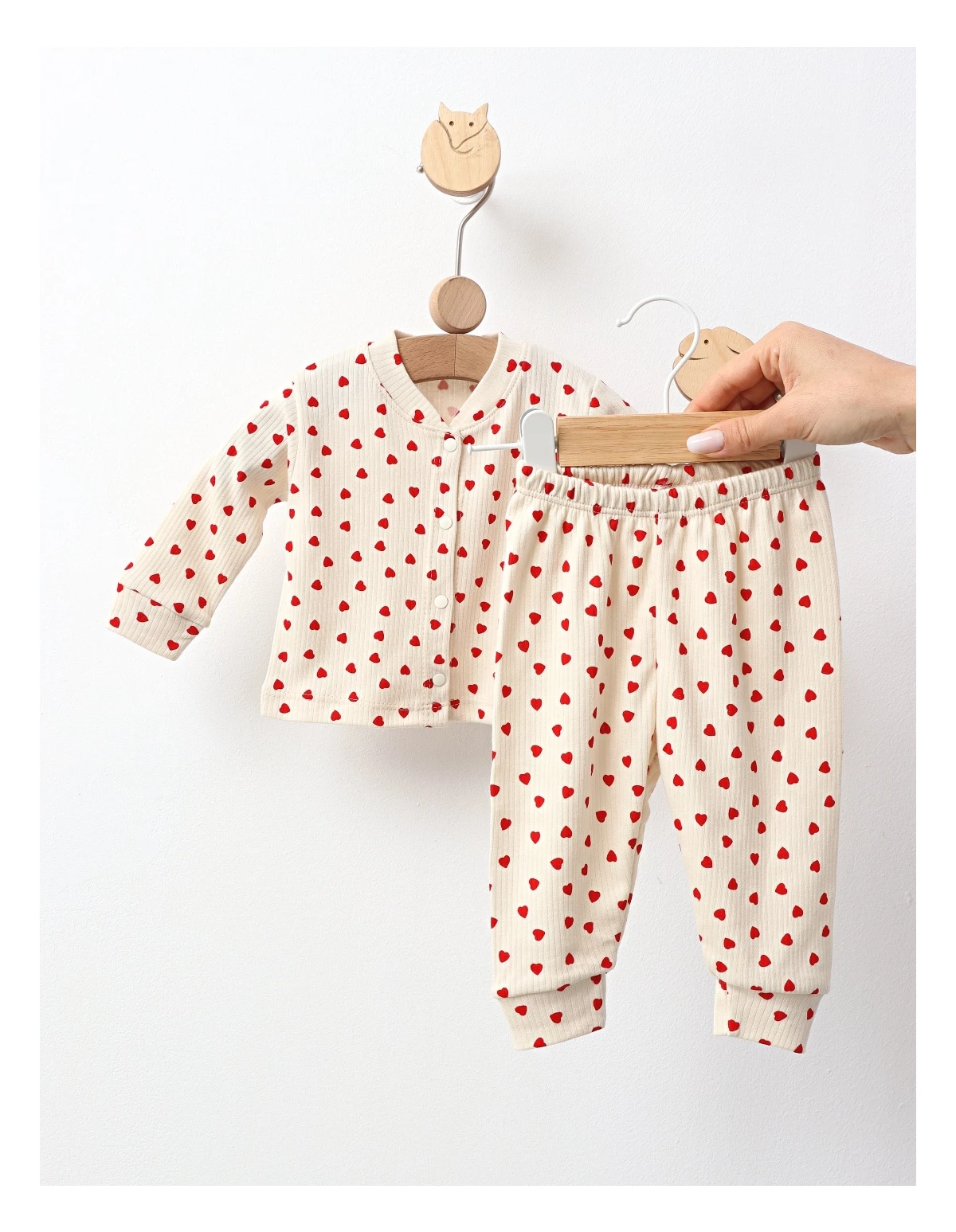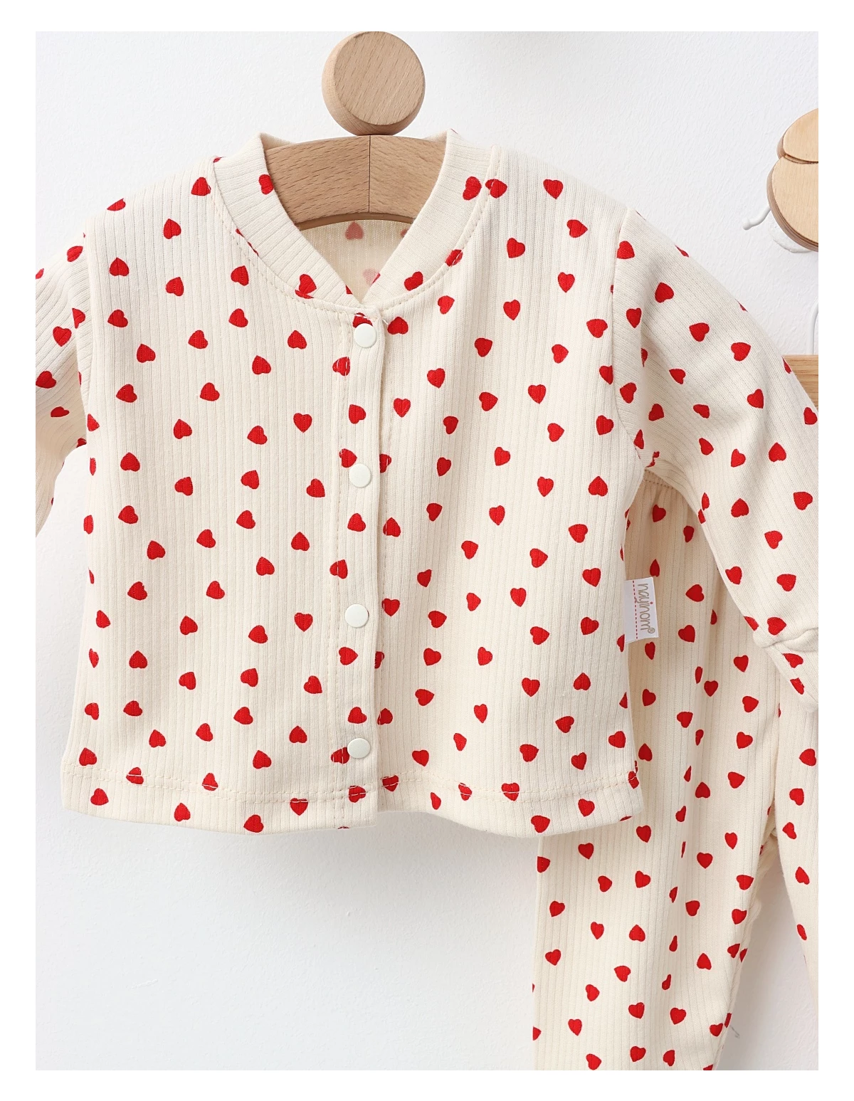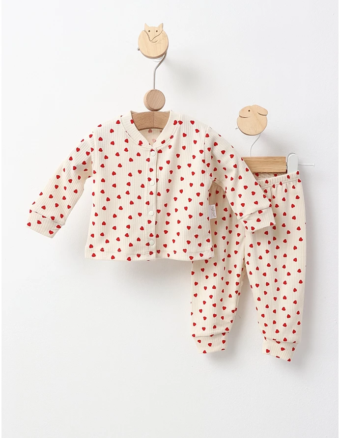 Pijama pentru bebeluși formată dintr-o bluză cu deschidere în capse și pantaloni, decorată cu imprimeuri cu inimioare adorabile. Fabricată din 100% bumbac, această pijama asigură confort și blândețe pentru pielea delicată a micuțului tău, fiind perfectă pentru somn liniștit.