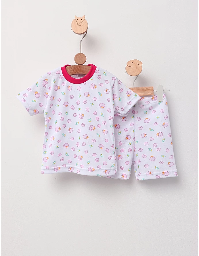 Această pijamă pentru copii este perfectă pentru nopțile de vară sau pentru relaxare în timpul zilei. Setul este format dintr-o bluziță cu mânecă scurtă și pantalonași scurți, ambele cu elastic în talie pentru confort maxim. Fabricată din 100% bumbac, pijama este moale, respirabilă și confortabilă, asigurându-le copiilor un somn odihnitor și plăcut. Imprimeurile colorate adaugă o notă veselă și distractivă, făcând ora de culcare mai atractivă pentru cei mici. Ideală pentru a ține copiii răcoroși și confortabili pe tot parcursul nopții, această pijamă combină funcționalitatea cu un design atractiv.