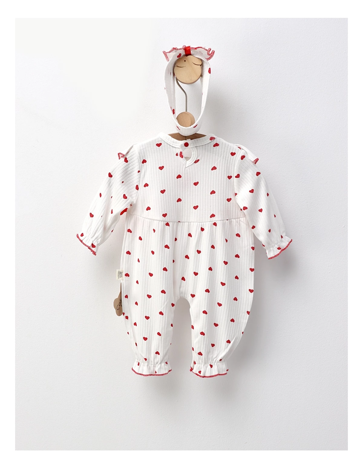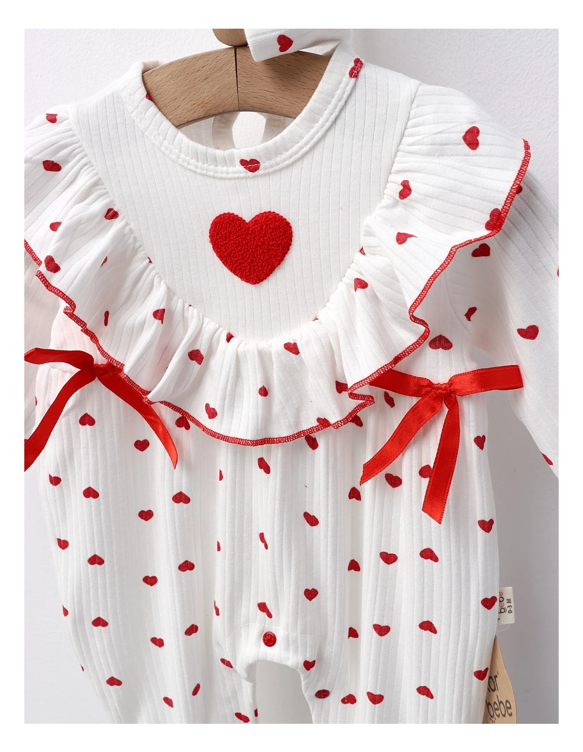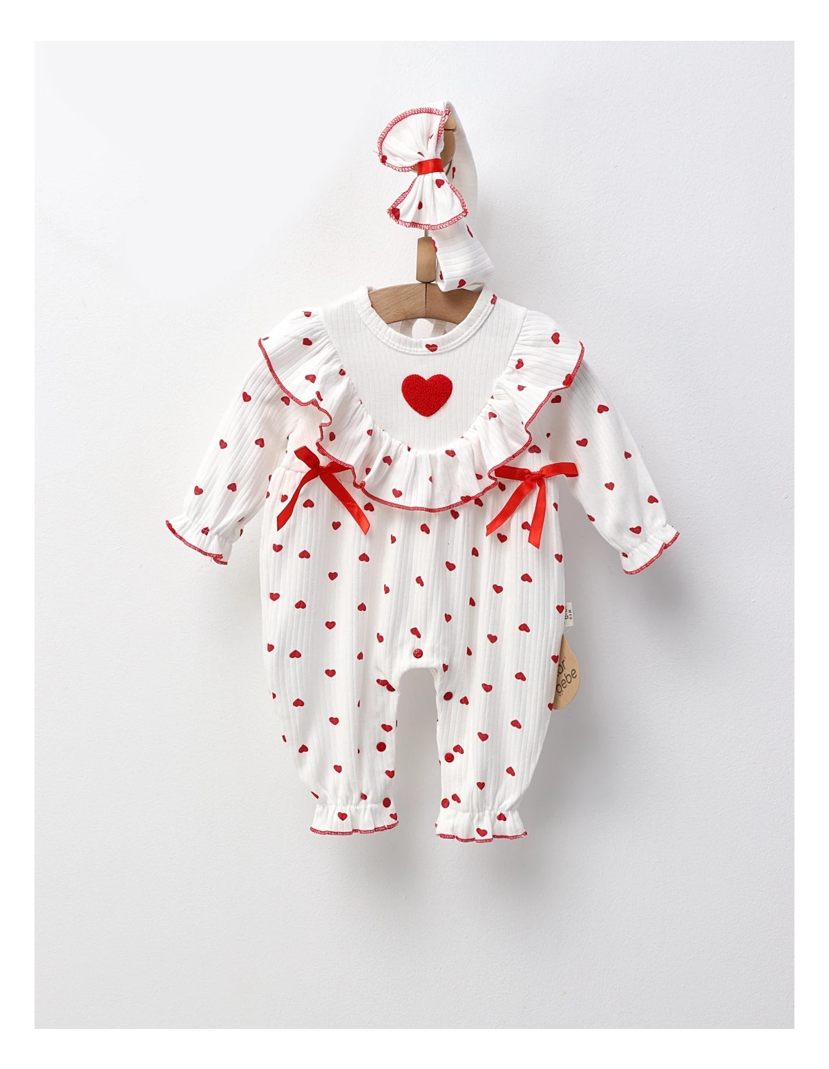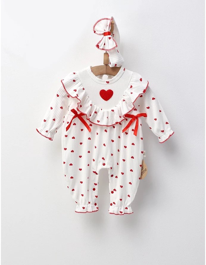Salopetă pentru fetițe cu benie, dotată cu deschidere în capse pentru schimbări ușoare, și decorată cu fundițe și imprimeu cu inimioare. Confecționată din 100% bumbac, asigură confort și delicatete pentru pielea sensibilă, fiind ideală pentru zilele speciale sau pentru momente de relaxare ale micuței tale.