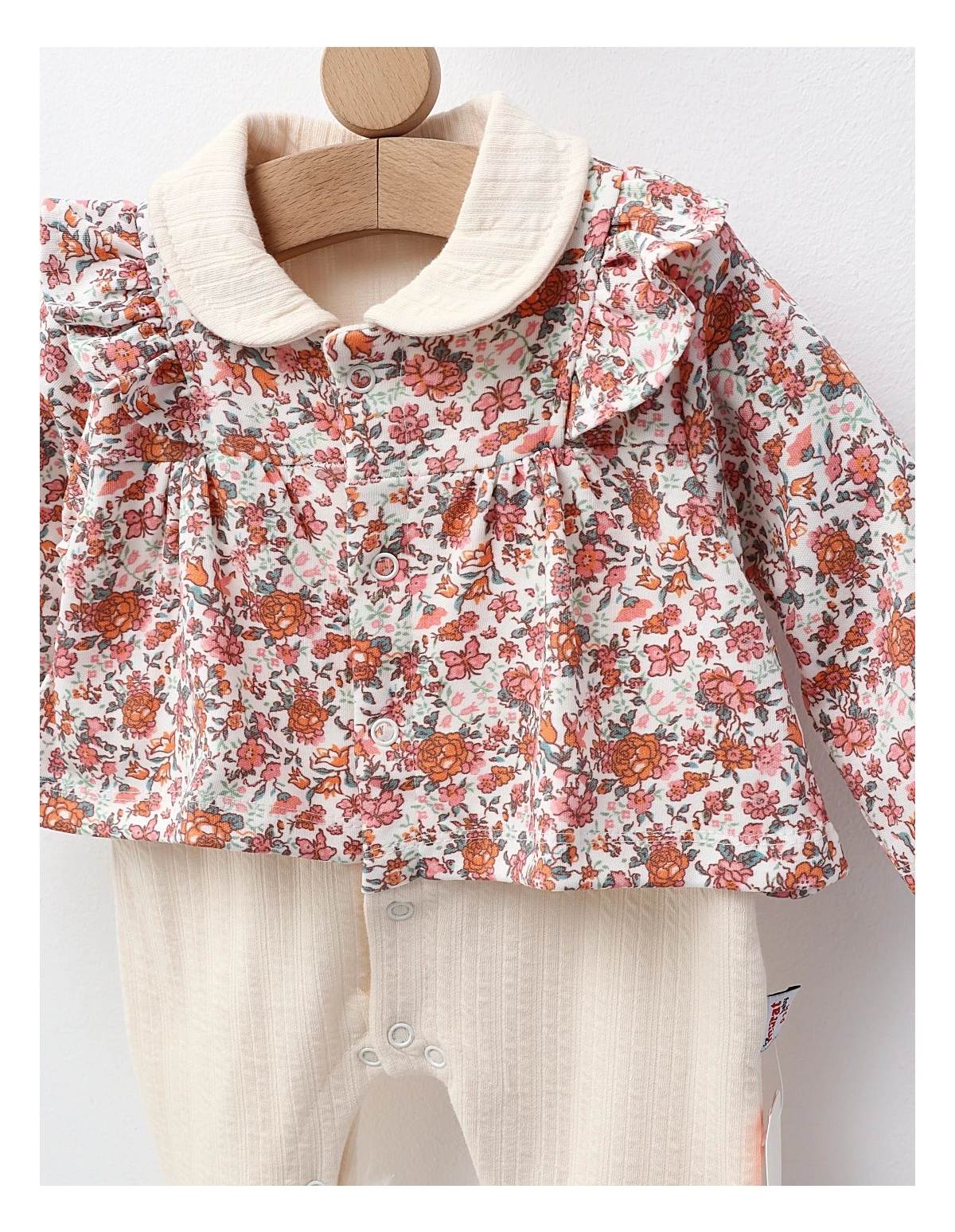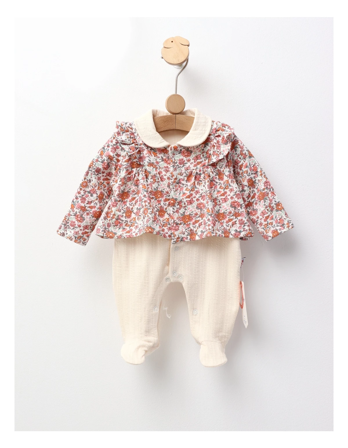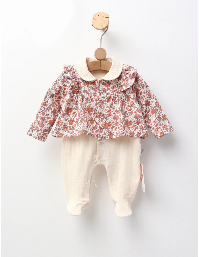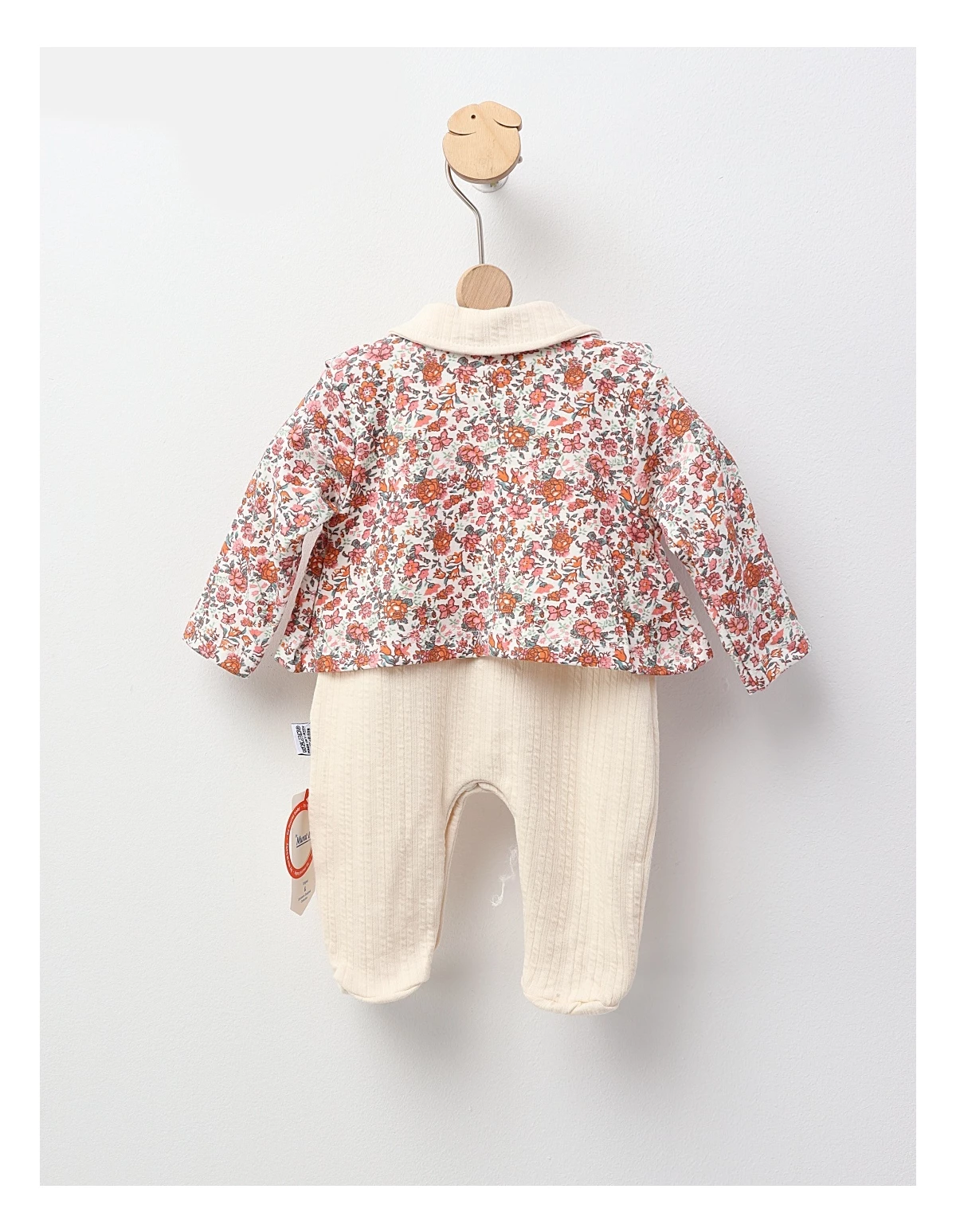 Salopetă pentru fetițe bebeluși, în stil jachetă, cu guler și deschidere în capse pentru schimbări facile. Decorată cu imprimeu cu floricele, și cu botosei integrați, confecționată din 100% bumbac, aceasta oferă confort, siguranță și un aspect adorabil pentru micuța ta. Ideal pentru zilele mai răcoroase sau sezonul de primăvară-vară, fiind perfectă pentru momente de relaxare sau plimbări.
