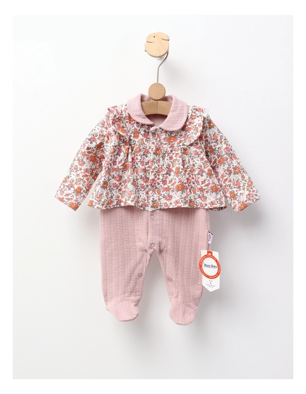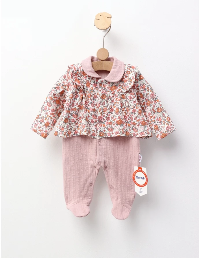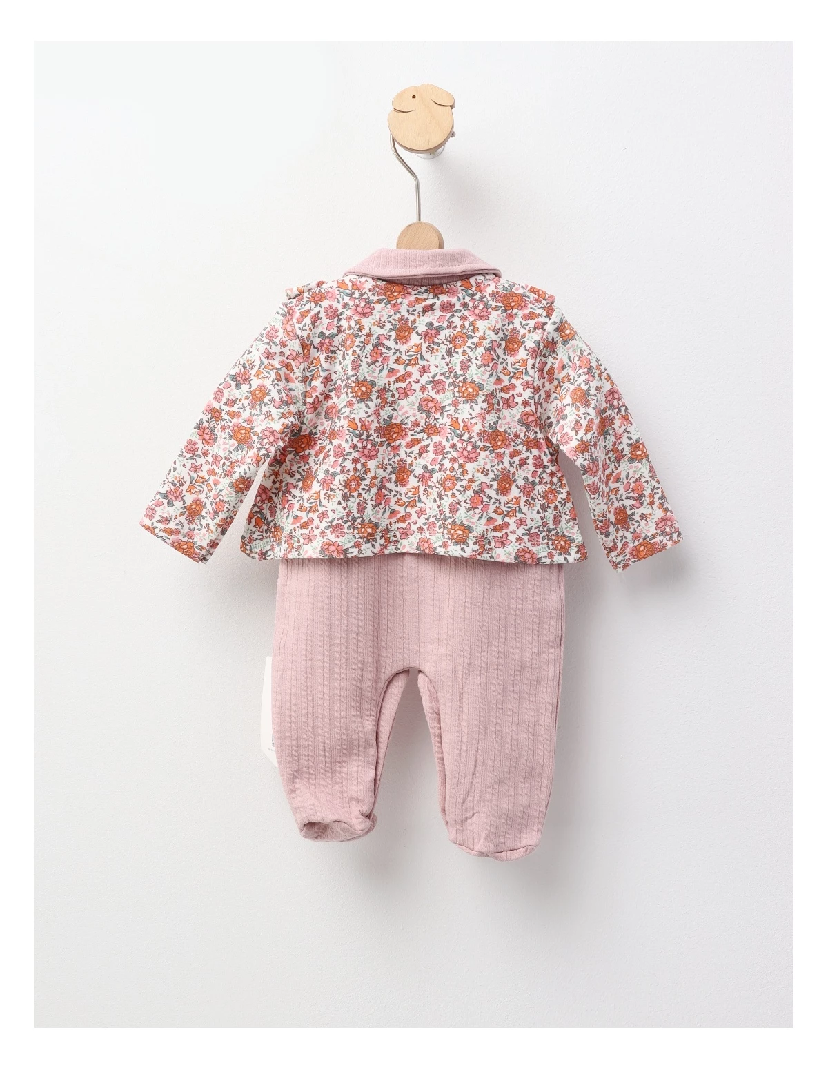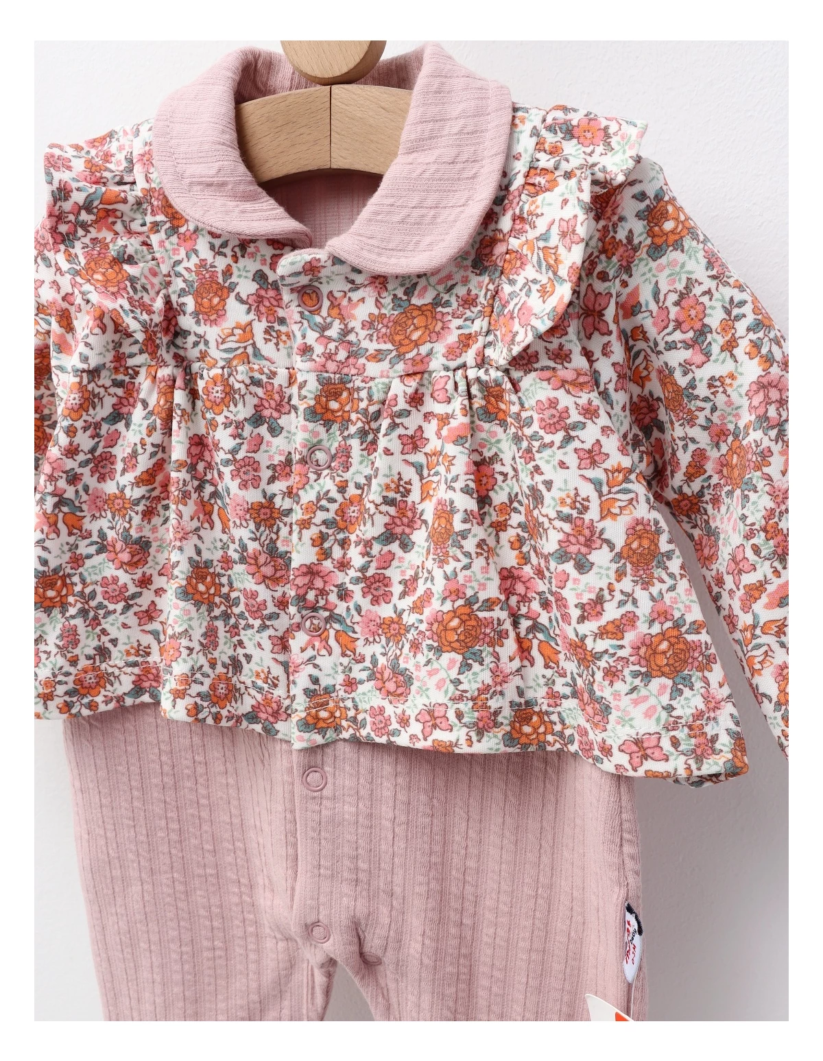 Salopetă pentru fetițe bebeluși, în stil jachetă, cu guler și deschidere în capse pentru schimbări facile. Decorată cu imprimeu cu floricele, și cu botosei integrați, confecționată din 100% bumbac, aceasta oferă confort, siguranță și un aspect adorabil pentru micuța ta. Ideal pentru zilele mai răcoroase sau sezonul de primăvară-vară, fiind perfectă pentru momente de relaxare sau plimbări.