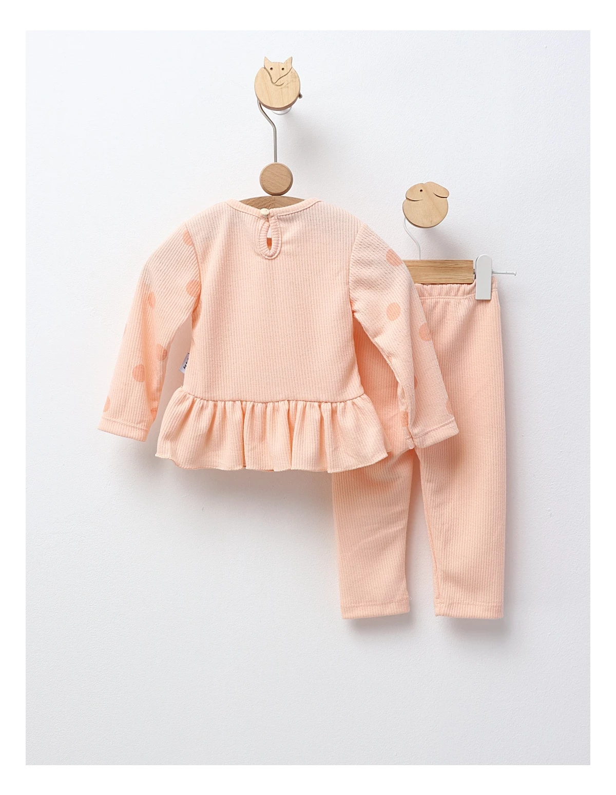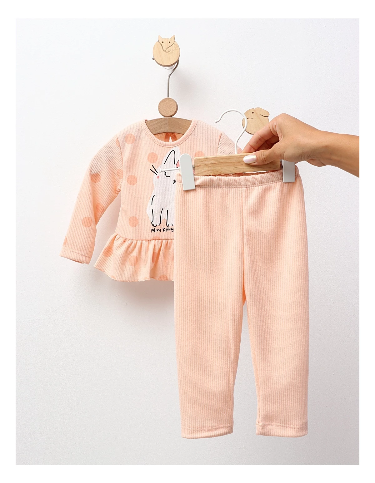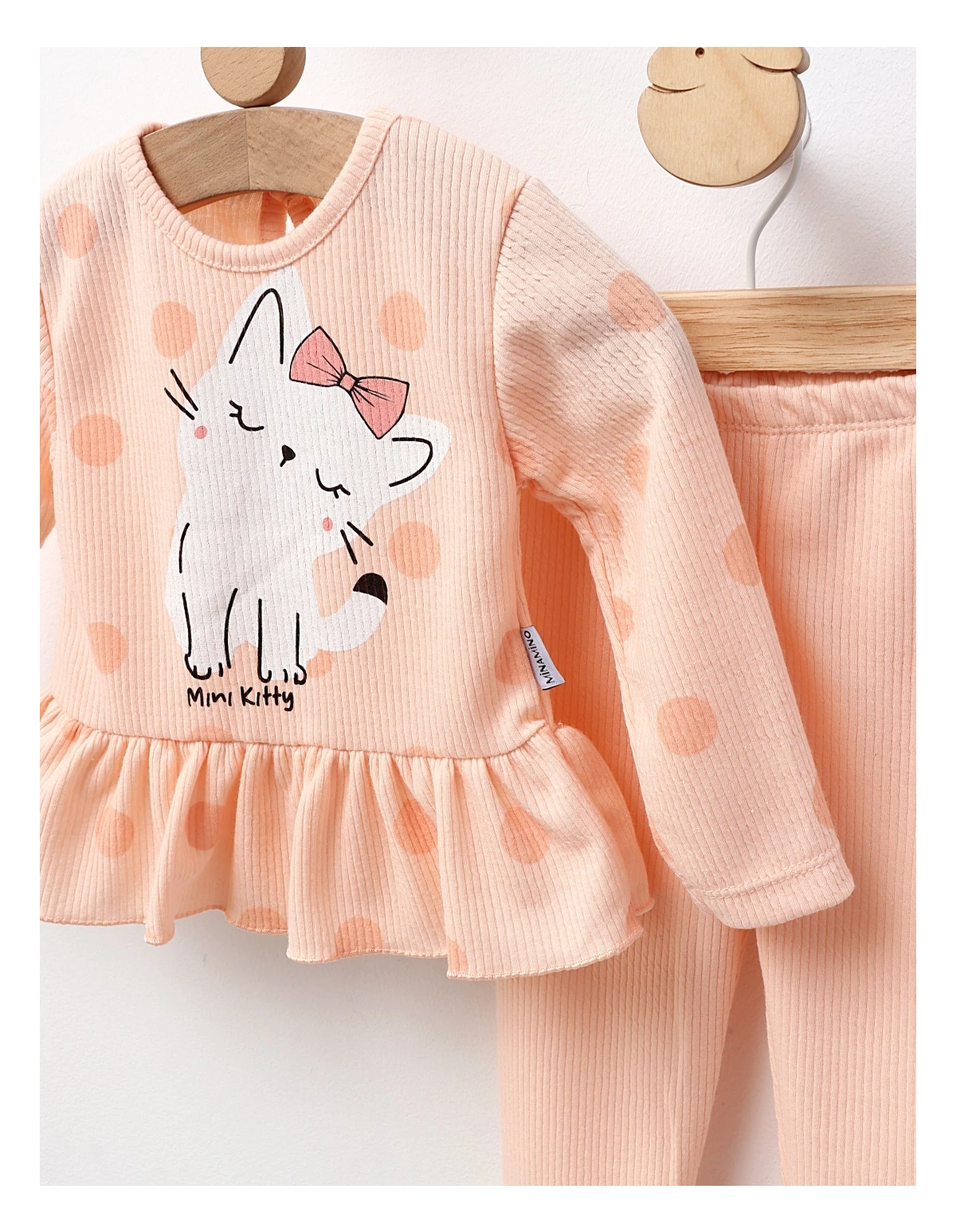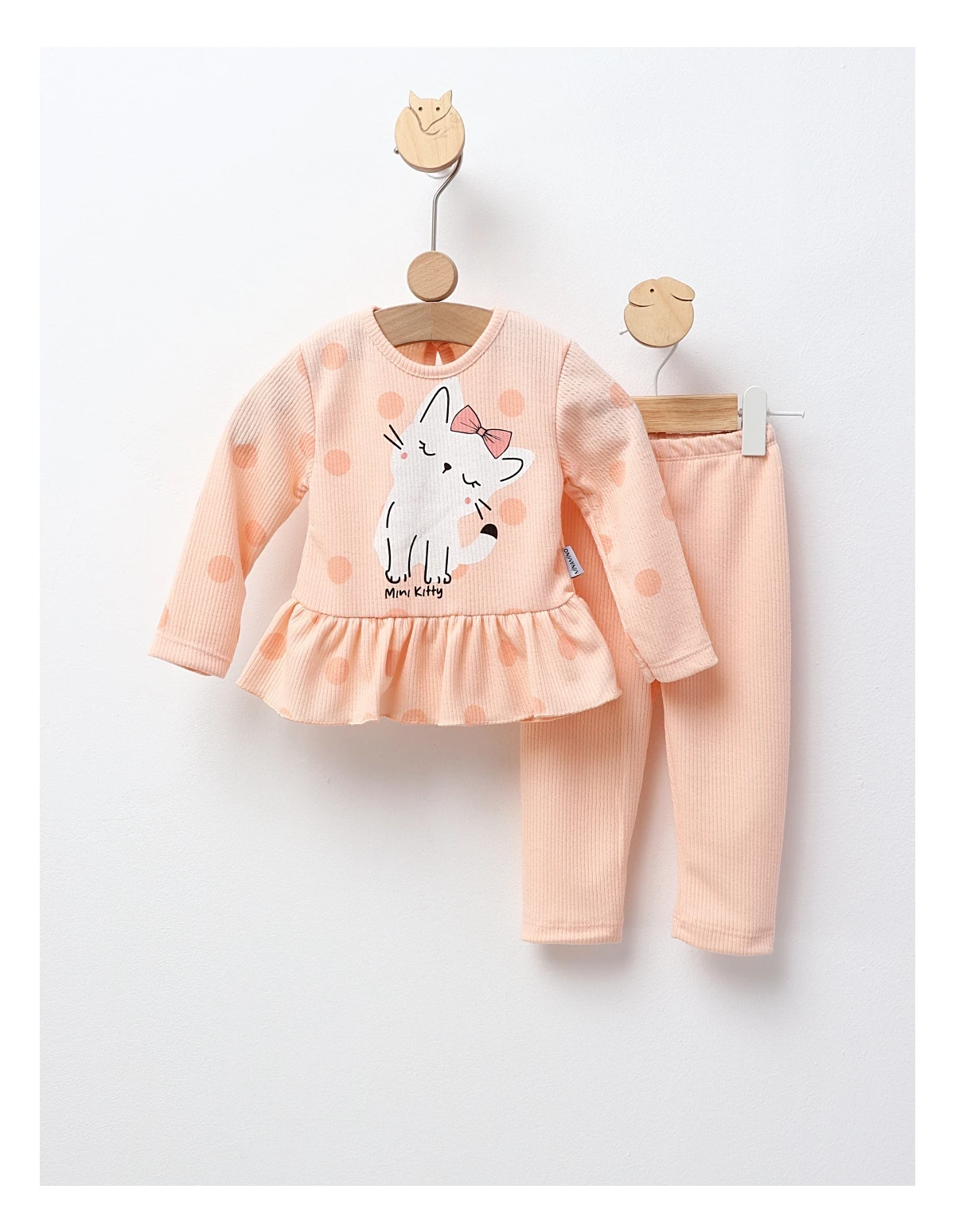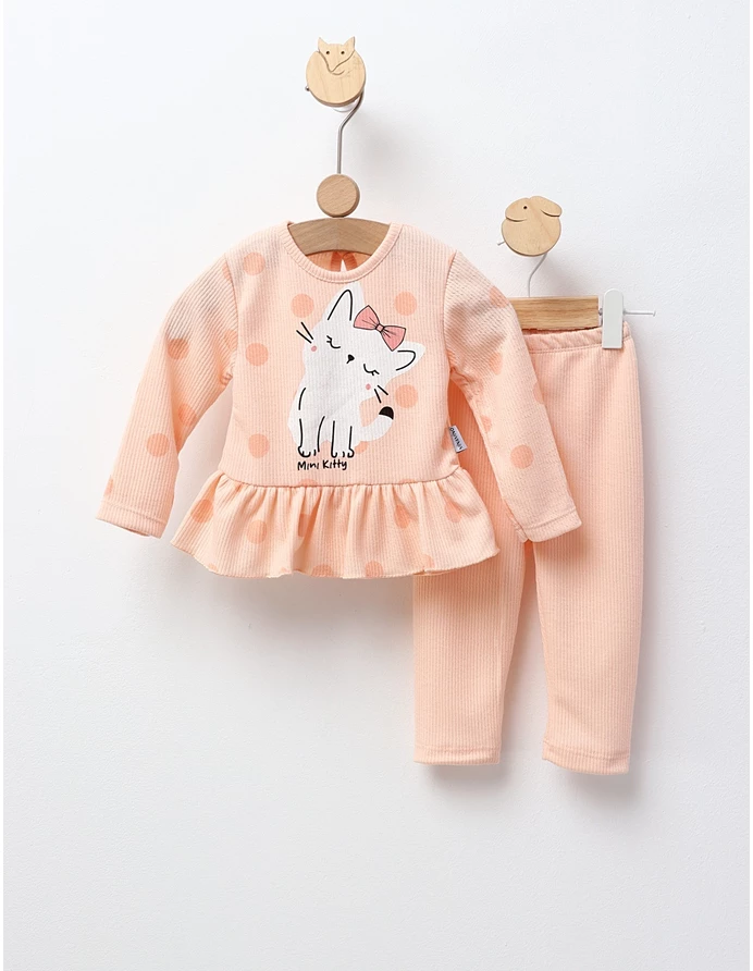 Set în două piese pentru fetițe, compus dintr-o bluză cu mânecă lungă, cu volan în talie și închidere cu nasturi la spate, și colanți. Bluză decorată cu imprimeu frontal cu pisicuță, oferind un aspect drăguț și jucăuș. Confecționat din 95% bumbac și 5% elastan, asigură confort, flexibilitate și durabilitate. Fabricat în Turcia, perfect pentru zilele de joacă sau activitățile zilnice ale micuței tale.