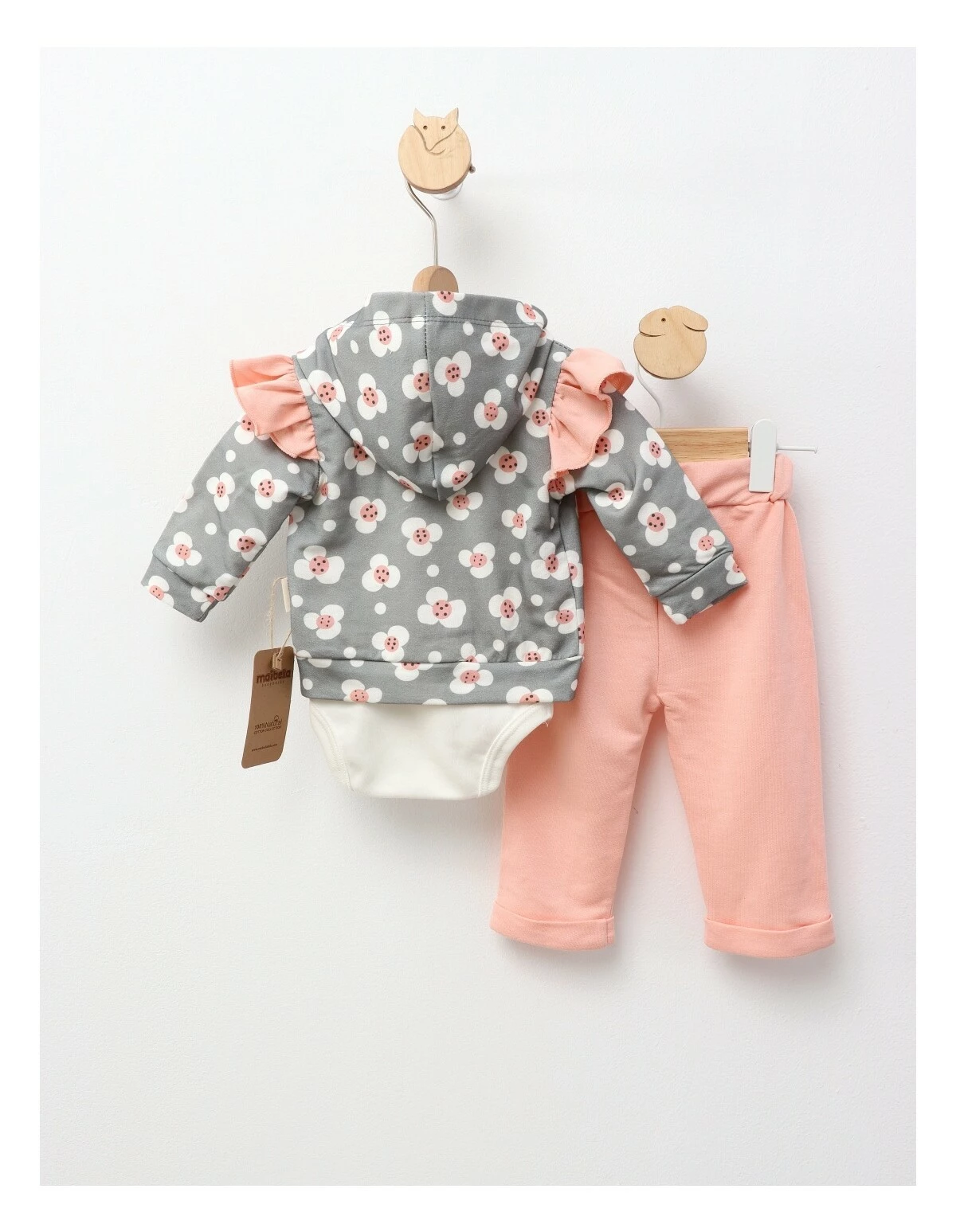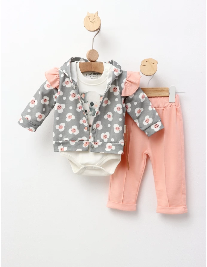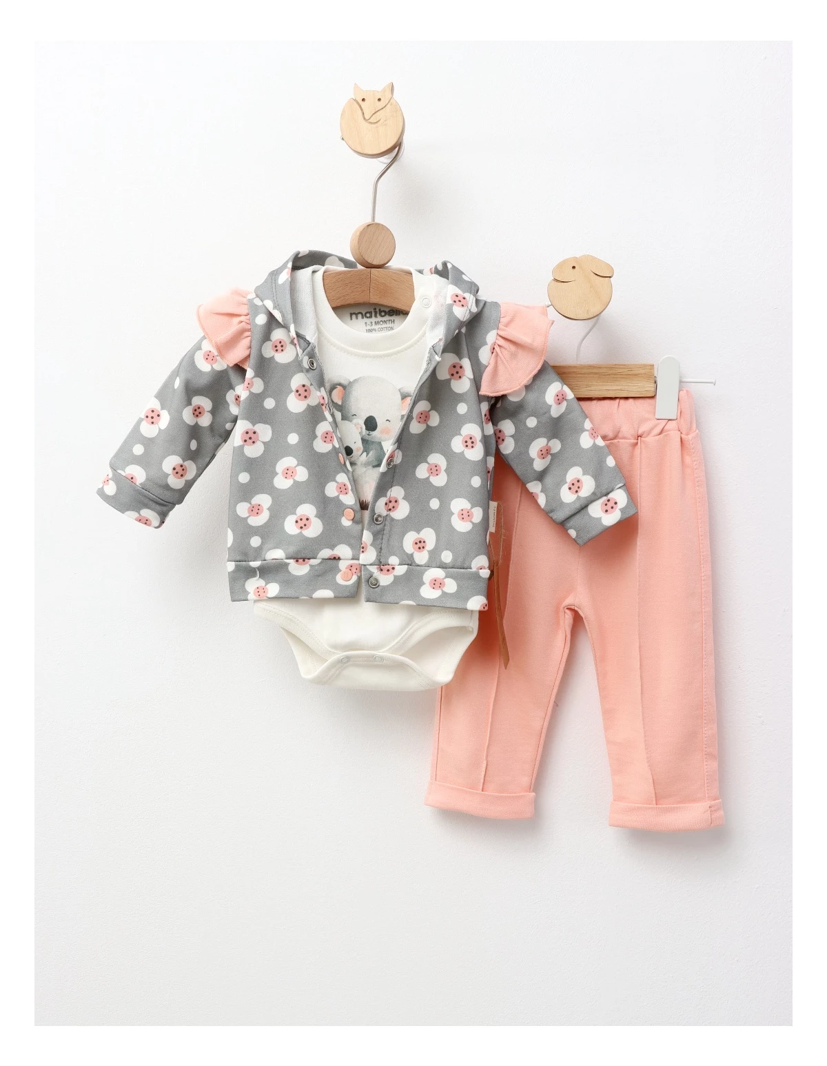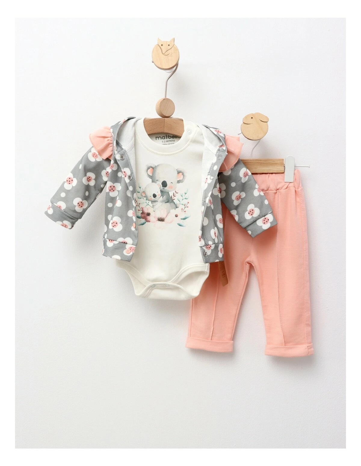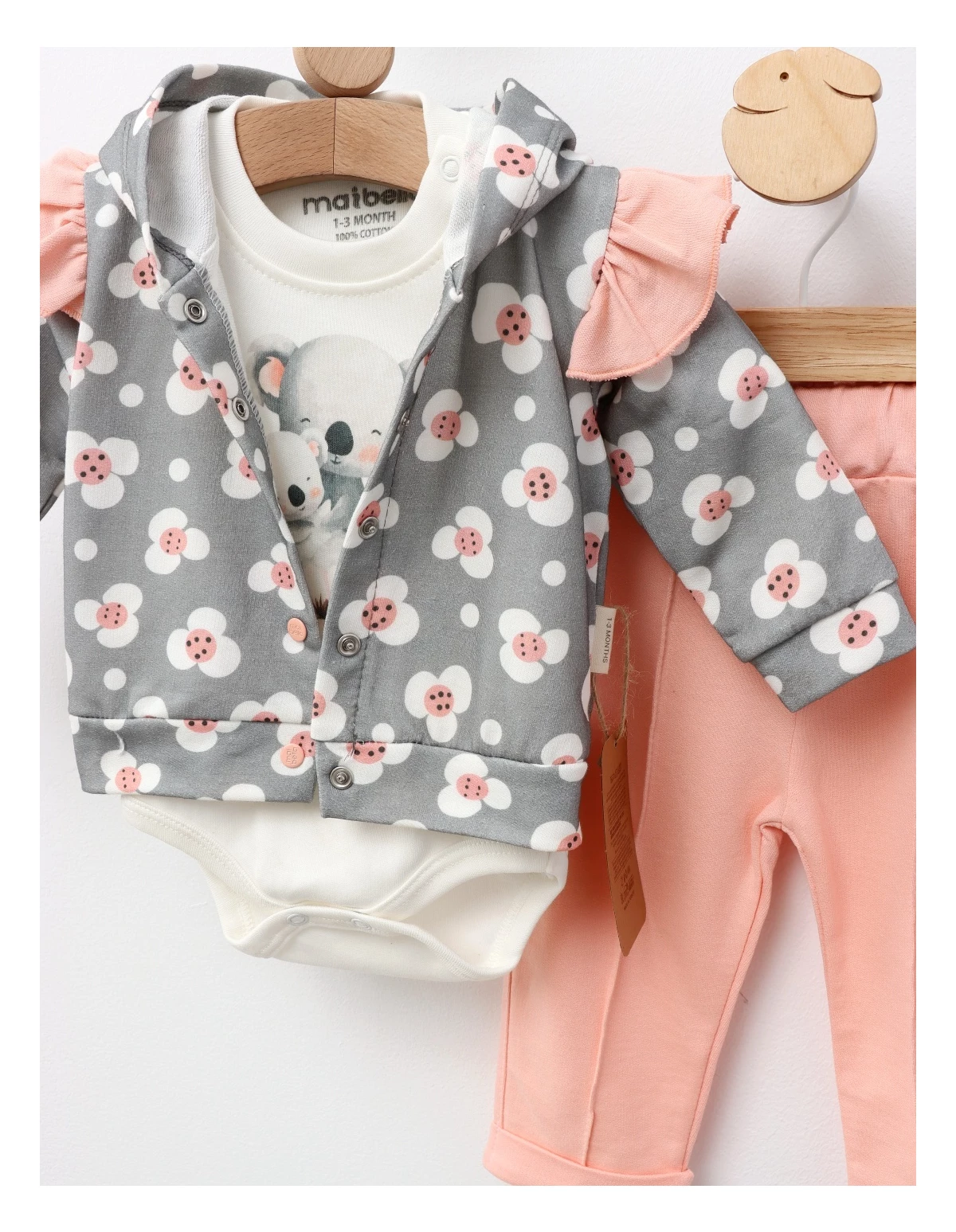 Setul de 3 piese pentru fetițe include un hanorac cu glugă și deschidere în capse, decorat cu imprimeuri cu floricele, un body cu imprimeul 'ursuleți koala' și pantaloni cu elastic în talie. Fabricat din 100% bumbac, acest set oferă confort și blândețe pentru pielea delicată a micuțelor, fiind ideal pentru zilele de joacă!
