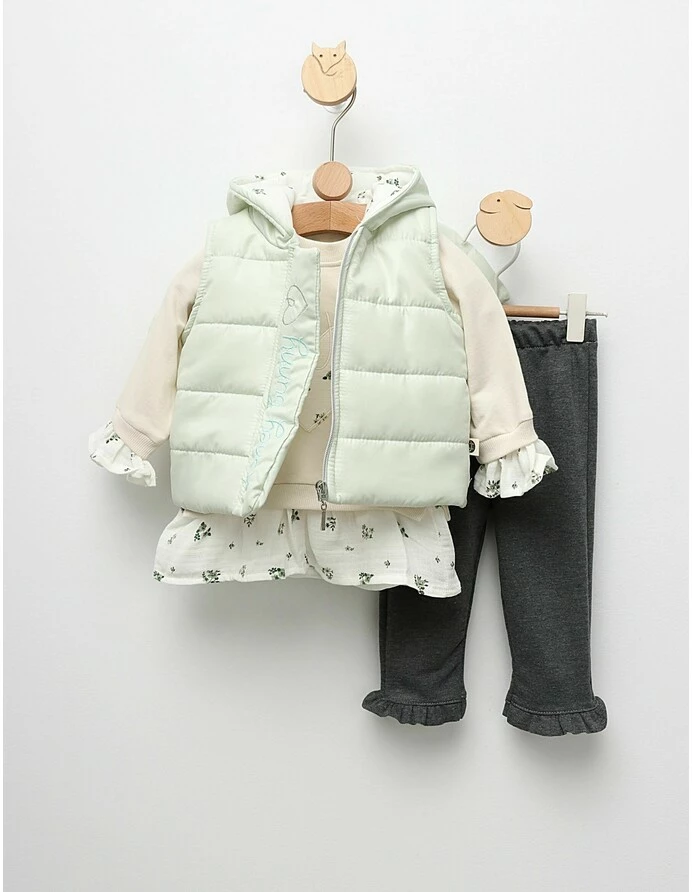 Îmbrăcați-vă fetița cu acest set adorabil de 3 piese, perfect pentru sezonul rece! Setul include o vestă de fas căptușită pe interior, dotată cu deschidere în fermoar și glugă, ideală pentru a menține căldura. Bluzita stil cămășuță are deschidere în capse și un imprimeu drăgălaș cu inimioare, aducând un strop de veselie ținutei. Pantalonașii sunt prevăzuți cu elastic în talie pentru o potrivire confortabilă. Fabricat din 100% bumbac, acest set asigură confortul și respirabilitatea necesare pielii sensibile a fetițelor. Ideal pentru joacă, plimbări sau zilele de școală, acest outfit va deveni rapid un favorit în garderoba ei!