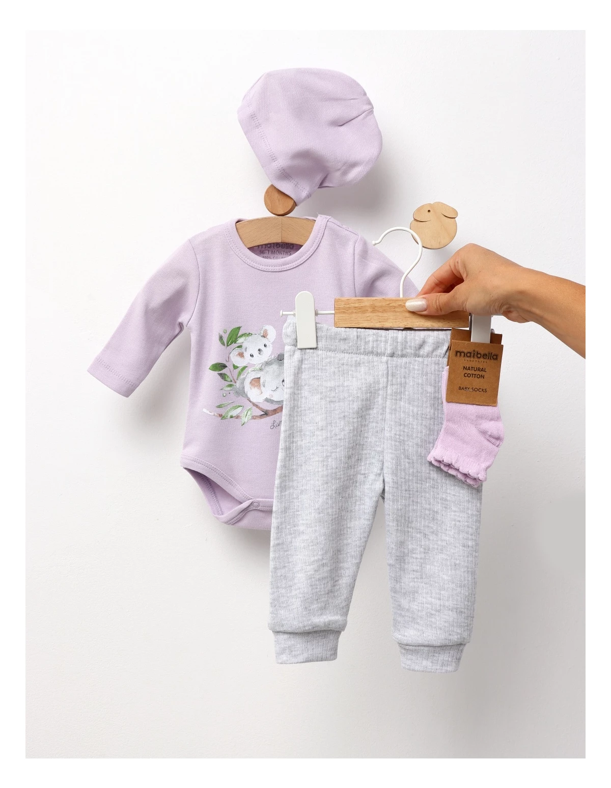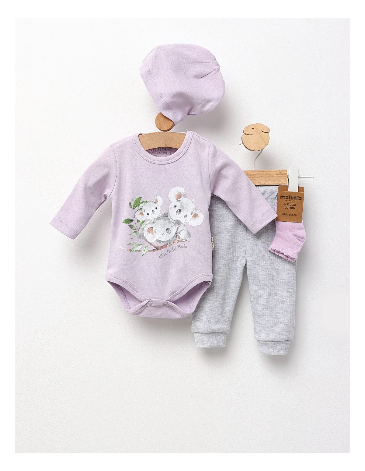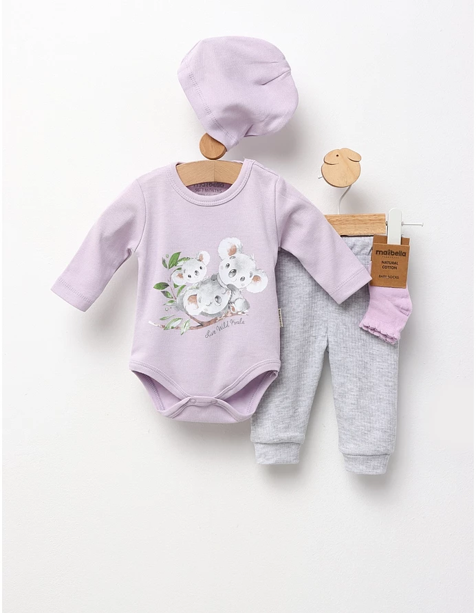 Set de 4 piese pentru bebeluși, ideal pentru cele mai speciale prime zile. Include un body cu deschidere în capse și imprimeu adorabil cu ursuleți koala, o căciuliță, șosete și pantaloni cu elastic în talie. Confecționat din 100% bumbac, acest set oferă confort, siguranță și un aspect drăgălaș, perfect pentru odihnă și joacă în sezonul rece sau pentru primele momente de conectare cu micuțul tău.