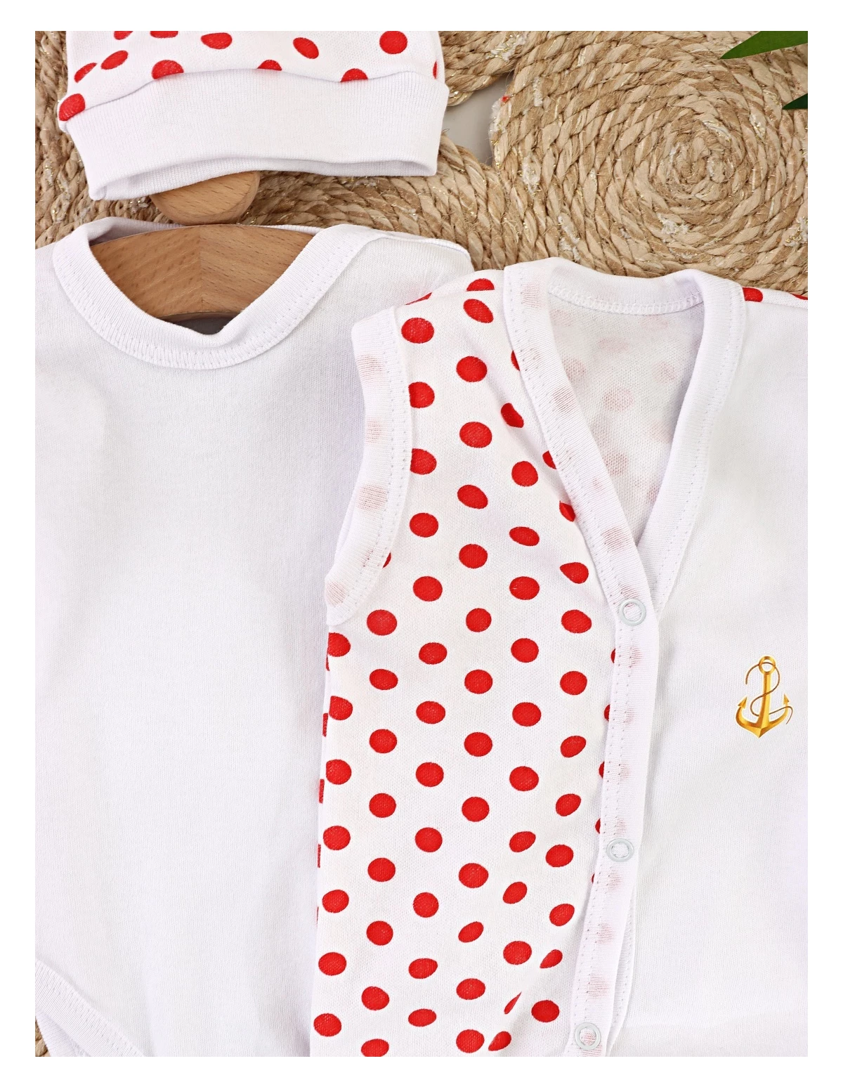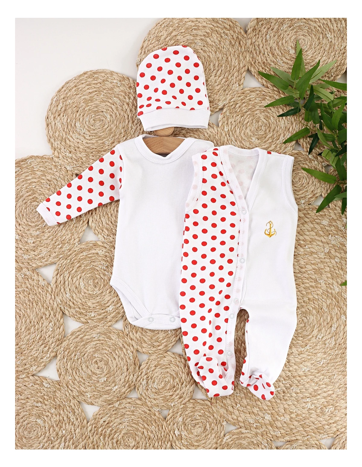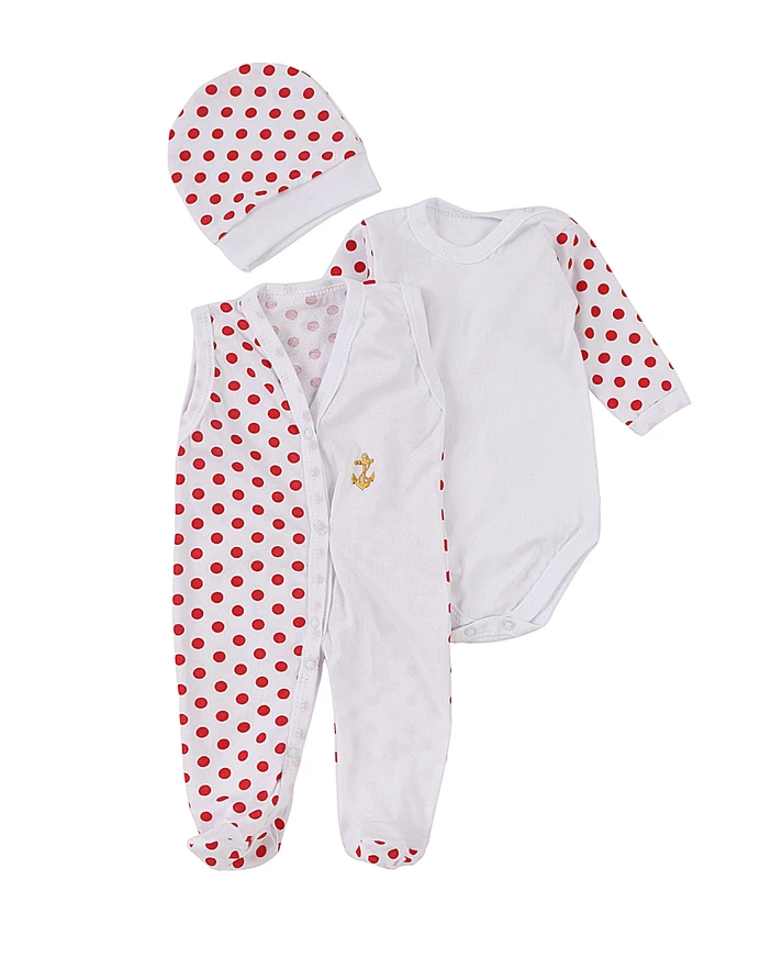 Acest Set pentru Bebeluși este un combo perfect de stil și funcționalitate, ideal pentru puiul tău. Setul include o salopetă fără mâneci cu deschidere în capse pe partea din față, un model cu botosei incorporați, un body cu mânecă lungă deschis în capsa pe umăr și între piciorușe și un fes. Salopeta și body-ul sunt albe cu buline roșii, iar salopeta prezintă un imprimeu pe o parte (modelele pot diferi față de cel din poză). Toate componentele sunt confecționate din 100% bumbac, oferind o senzație de moale și confortabilă pe pielea sensibilă a bebelușului. Produsul este fabricat în România, reflectând o calitate excelentă și o atenție deosebită la detalii.