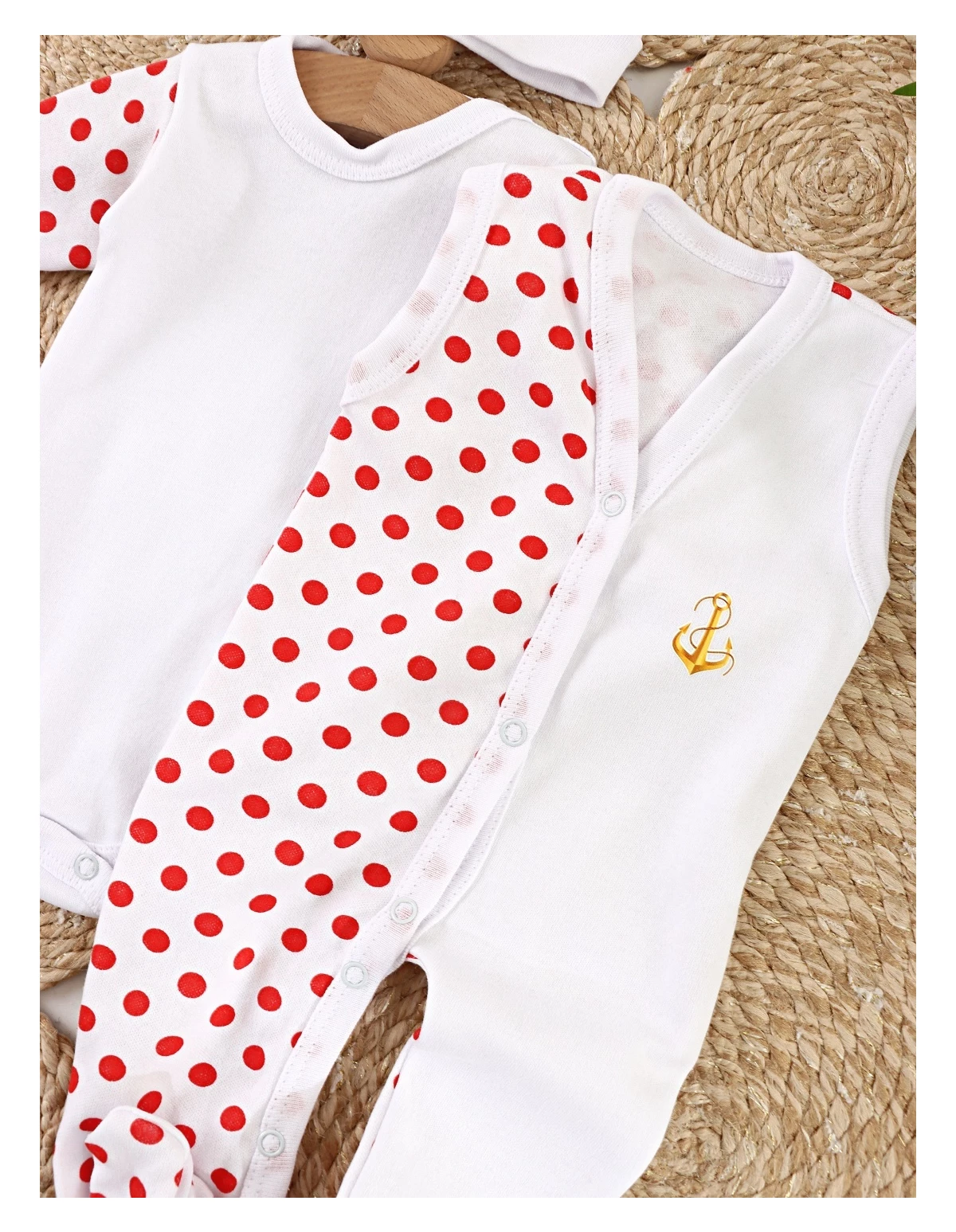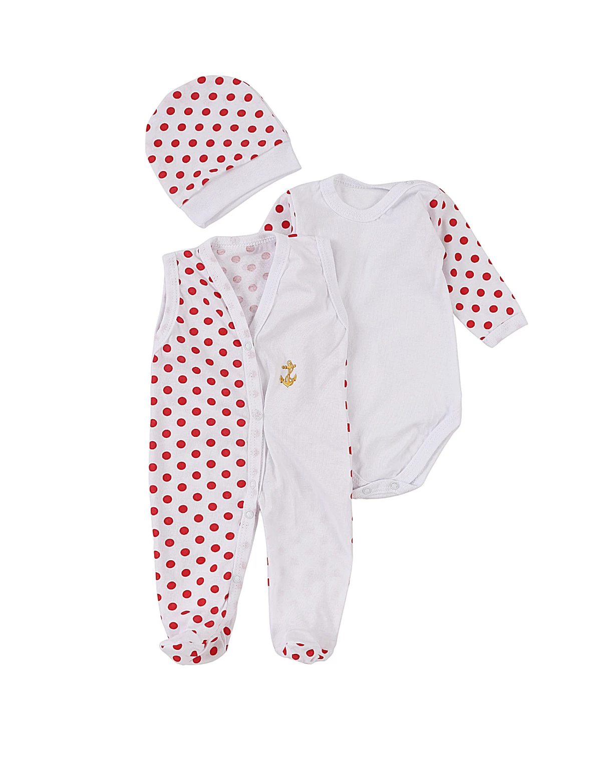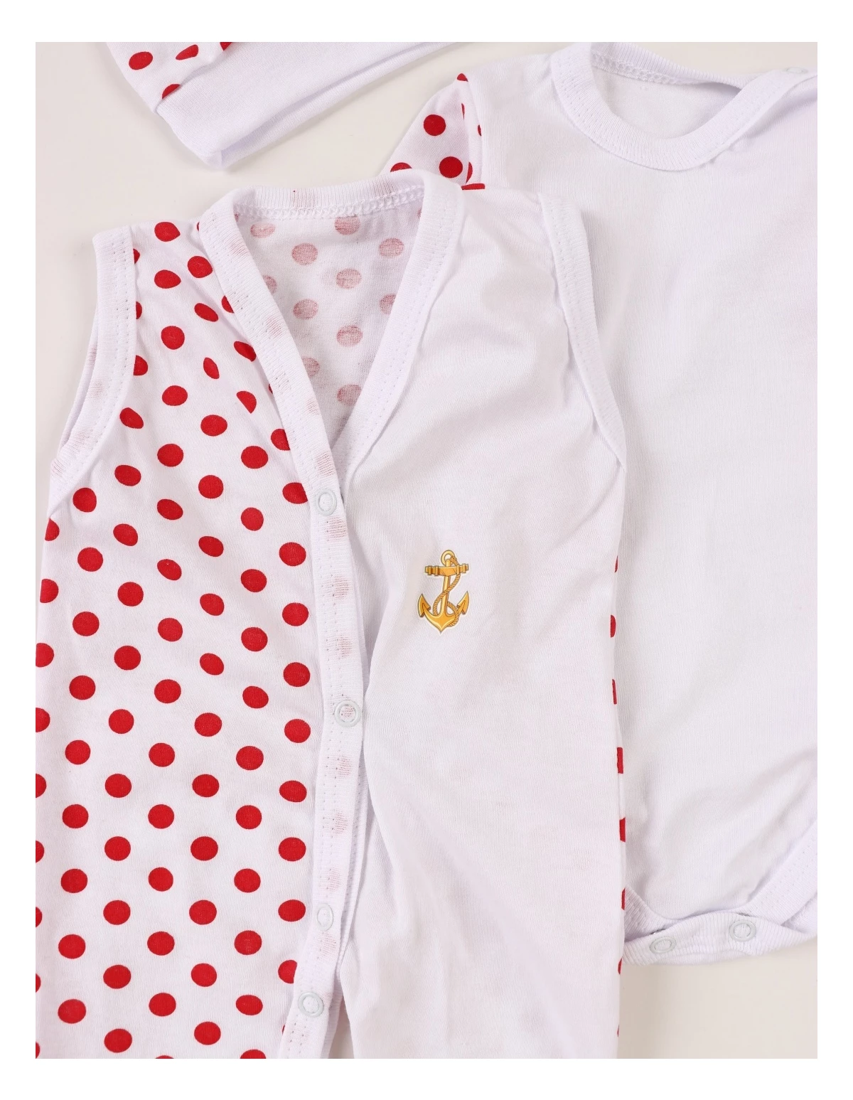 Acest Set pentru Bebeluși este un combo perfect de stil și funcționalitate, ideal pentru puiul tău. Setul include o salopetă fără mâneci cu deschidere în capse pe partea din față, un model cu botosei incorporați, un body cu mânecă lungă deschis în capsa pe umăr și între piciorușe și un fes. Salopeta și body-ul sunt albe cu buline roșii, iar salopeta prezintă un imprimeu pe o parte (modelele pot diferi față de cel din poză). Toate componentele sunt confecționate din 100% bumbac, oferind o senzație de moale și confortabilă pe pielea sensibilă a bebelușului. Produsul este fabricat în România, reflectând o calitate excelentă și o atenție deosebită la detalii.