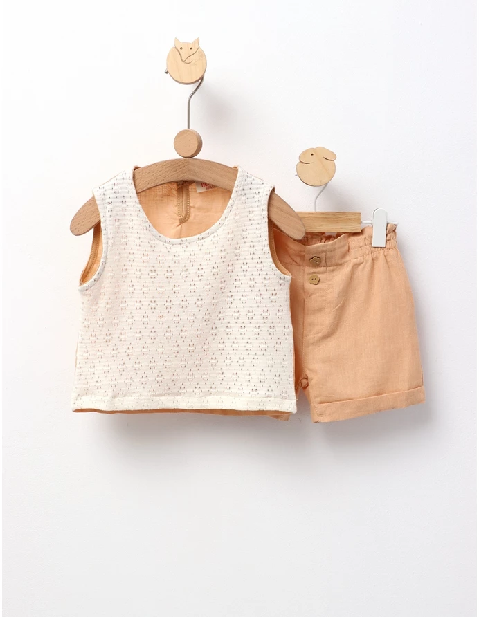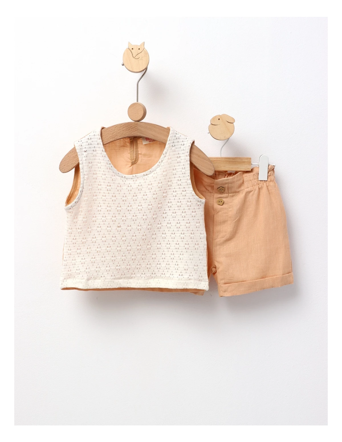 Setul de două piese pentru fetițe include o bluză crop top brodată în partea din spate și pantaloni scurți, fiind un costum lejer de vară. Fabricat din 100% bumbac, acest set asigură confort și prospetime pentru zilele calde, fiind ideal pentru evenimente, plimbări în aer liber sau activități de joacă în sezonul estival.