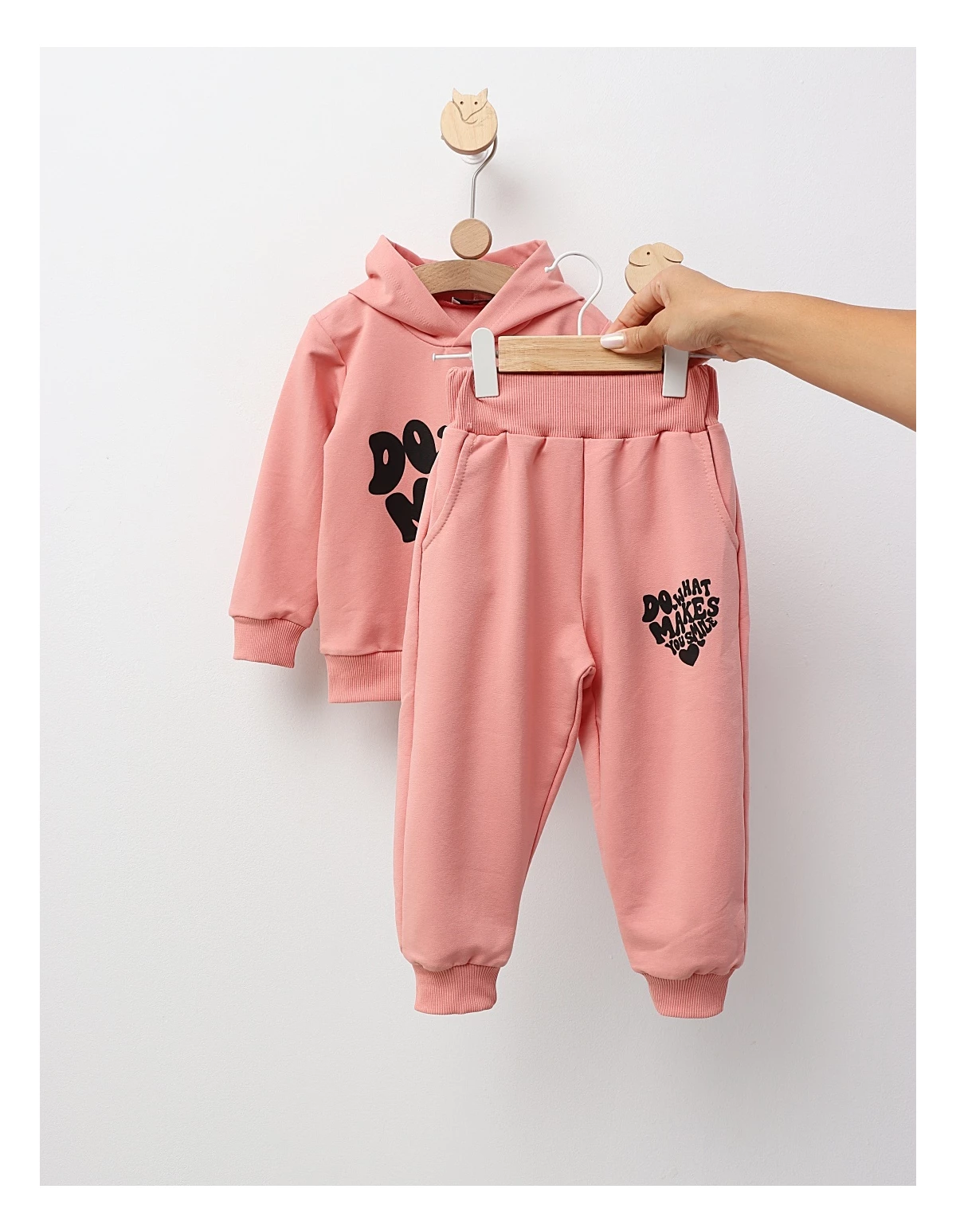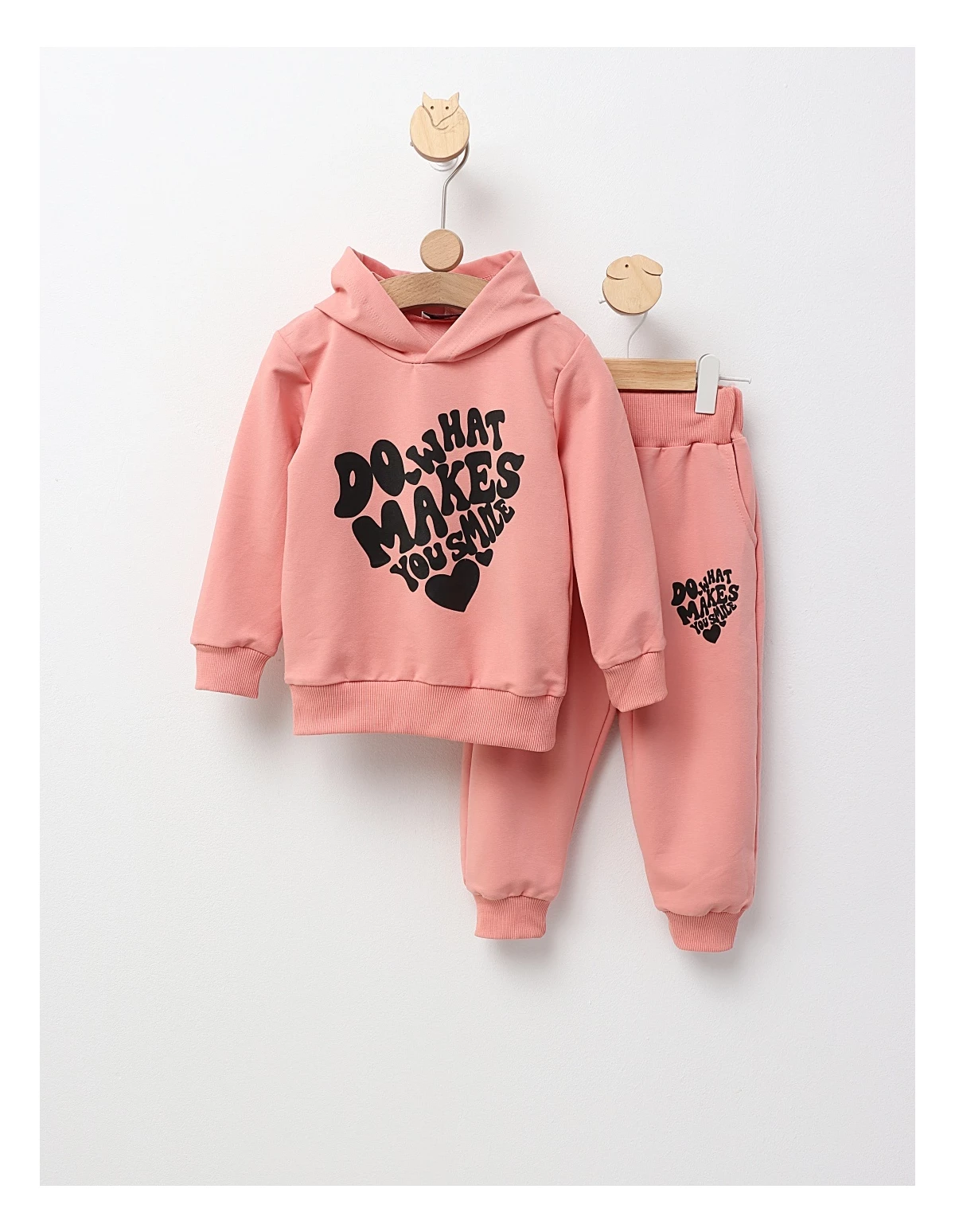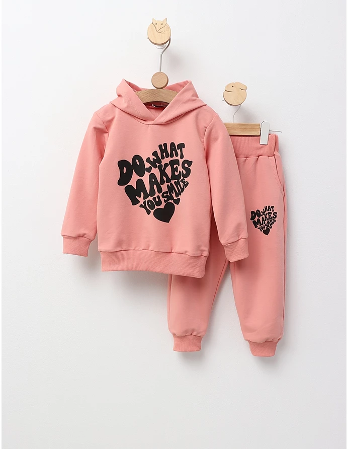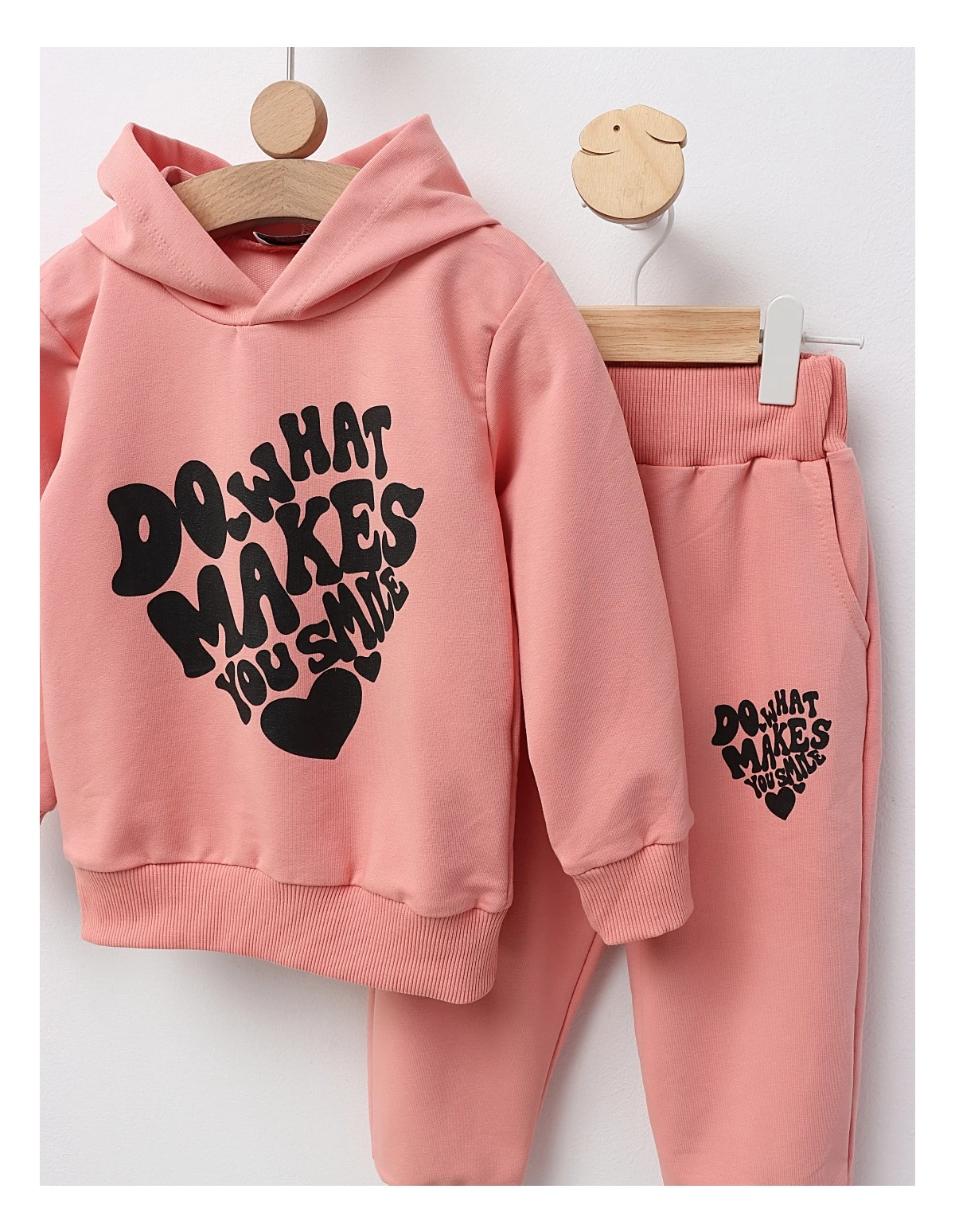 Trening pentru copii, format dintr-un hanorac cu glugă și imprimeu cu mesajul 'Do what makes you smile', și pantaloni cu elastic în talie și buzunare. Confecționat din 95% bumbac și 5% elastan, acest set oferă confort, lejeritate și un stil casual, perfect pentru activități în aer liber, joacă sau relaxare.