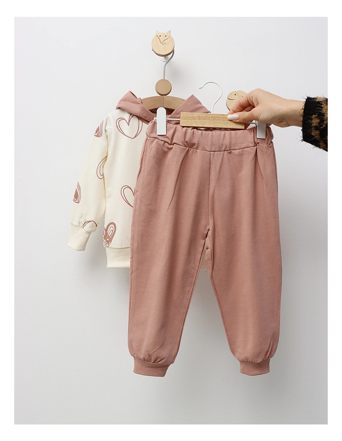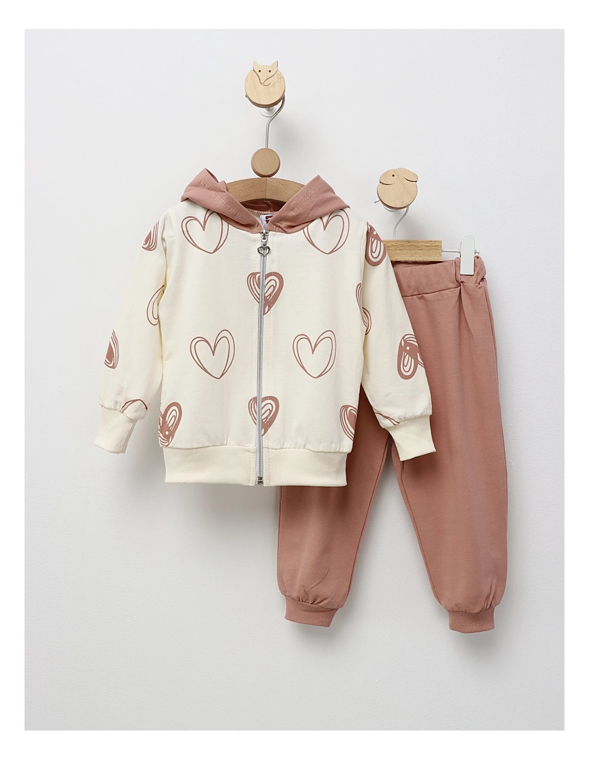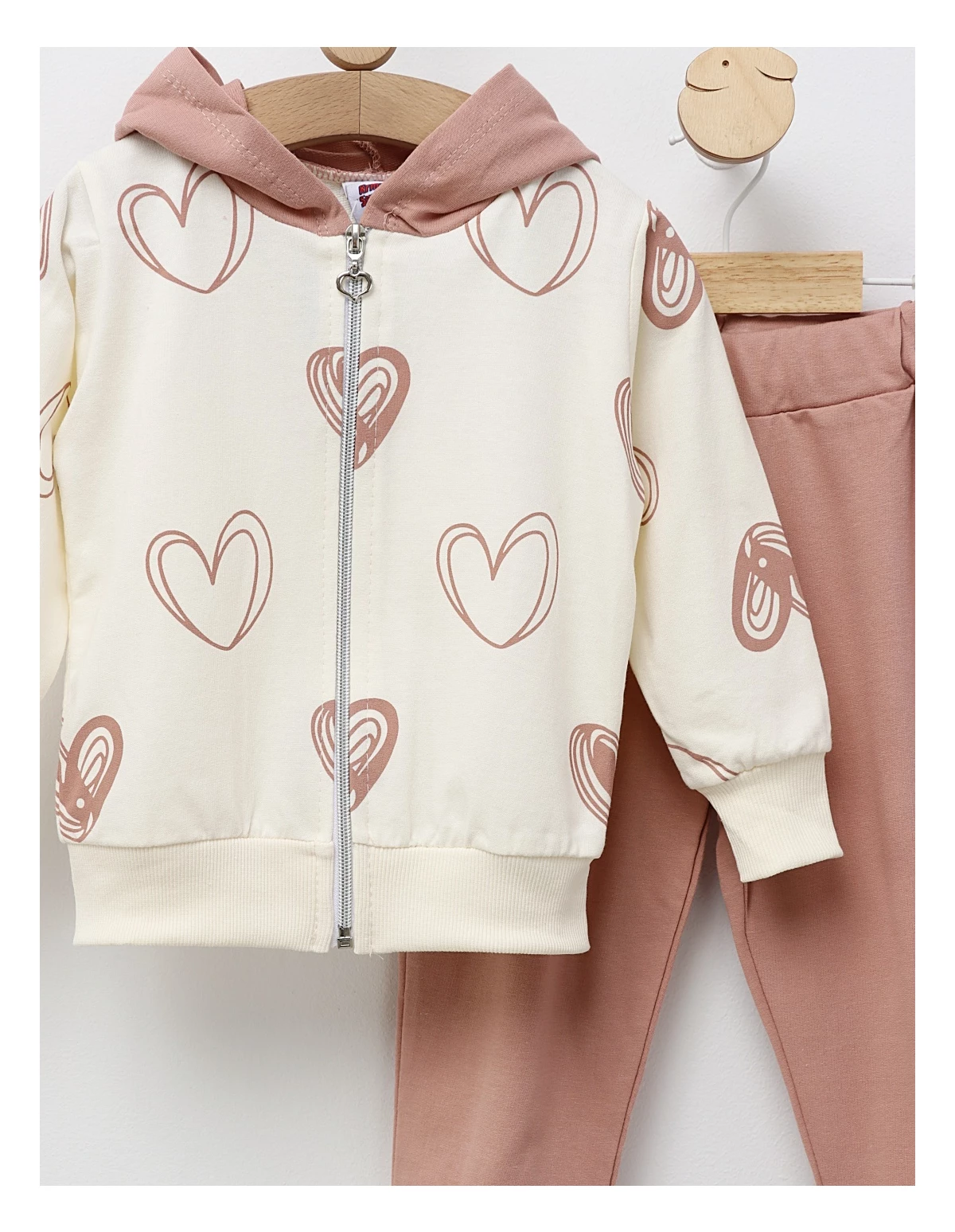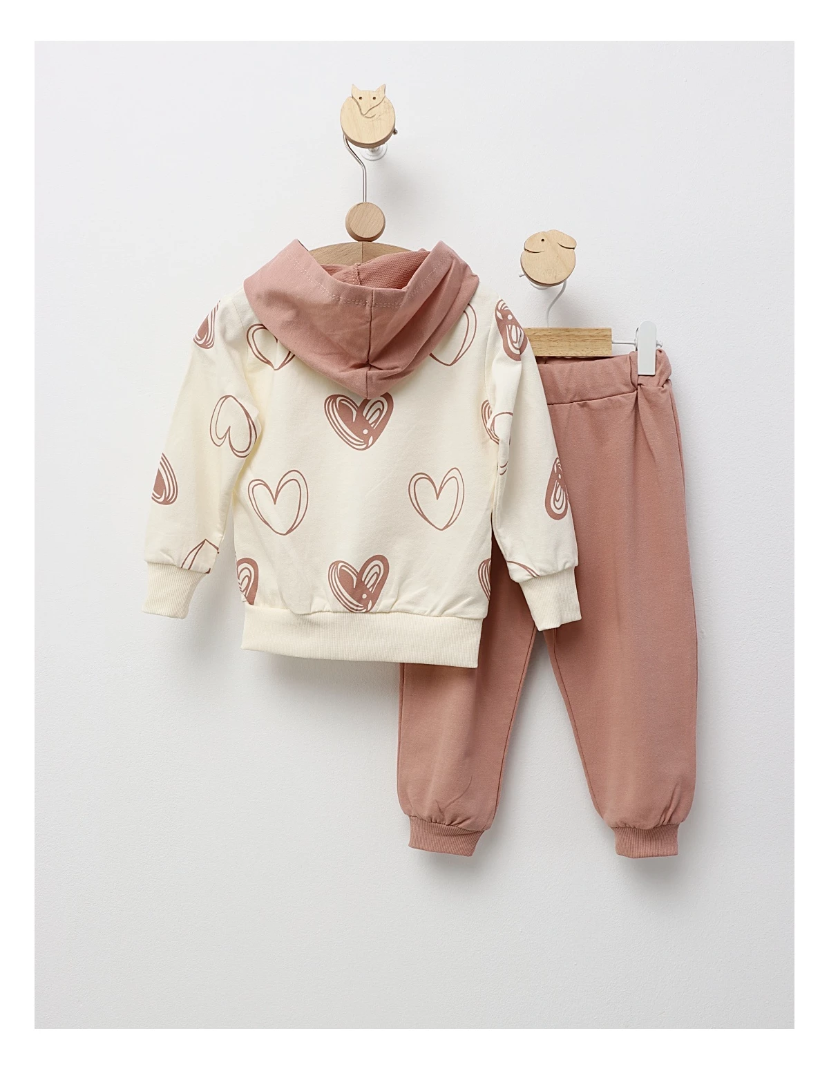 Îmbracă-ți fetița în confort și stil cu acest trening adorabil, perfect pentru zilele active! Setul este format dintr-un hanorac cu glugă, dotat cu deschidere în fermoar, împodobit cu un imprimeu jucăuș cu inimioare. Pantalonașii au elastic în talie, asigurând o potrivire confortabilă și lejeră. Fabricat din 100% bumbac de calitate, acest trening oferă o senzație moale pe piele și respirabilitate, fiind ideal pentru joacă, plimbări sau momente de relaxare acasă. Alege acest outfit chic pentru a adăuga un strop de veselie garderobei fetiței tale!