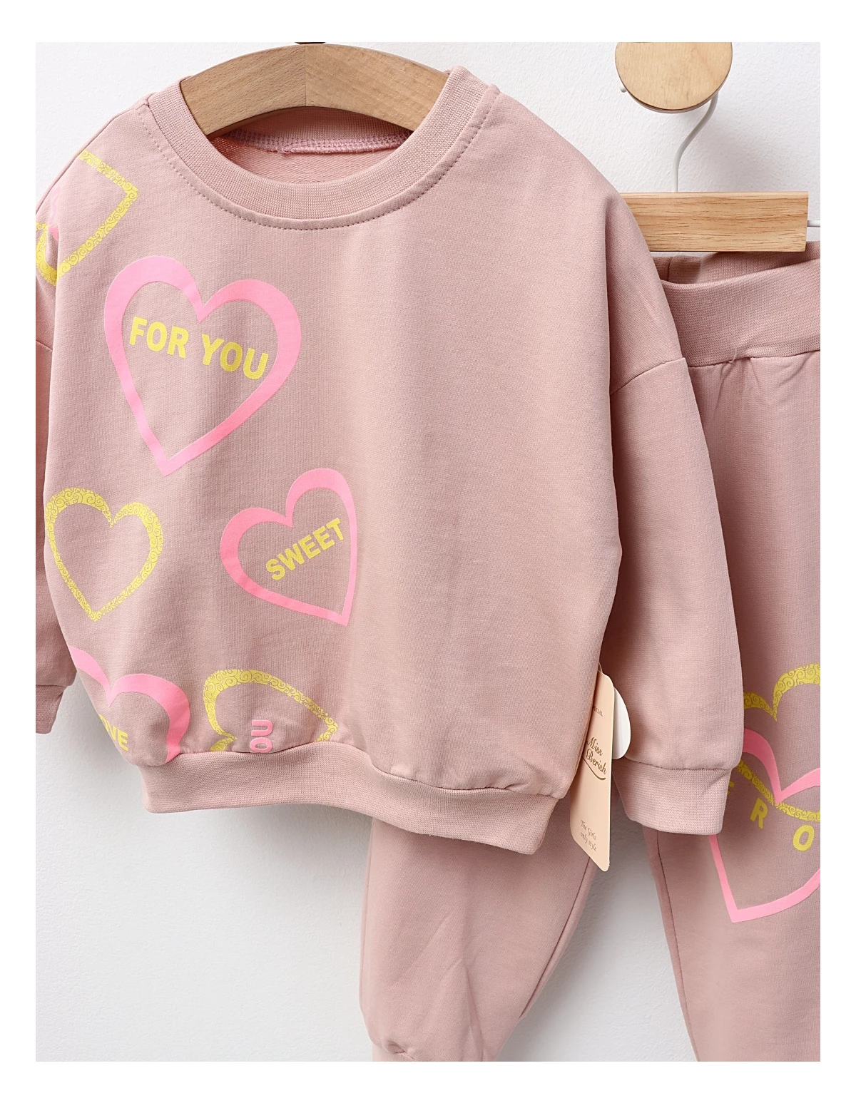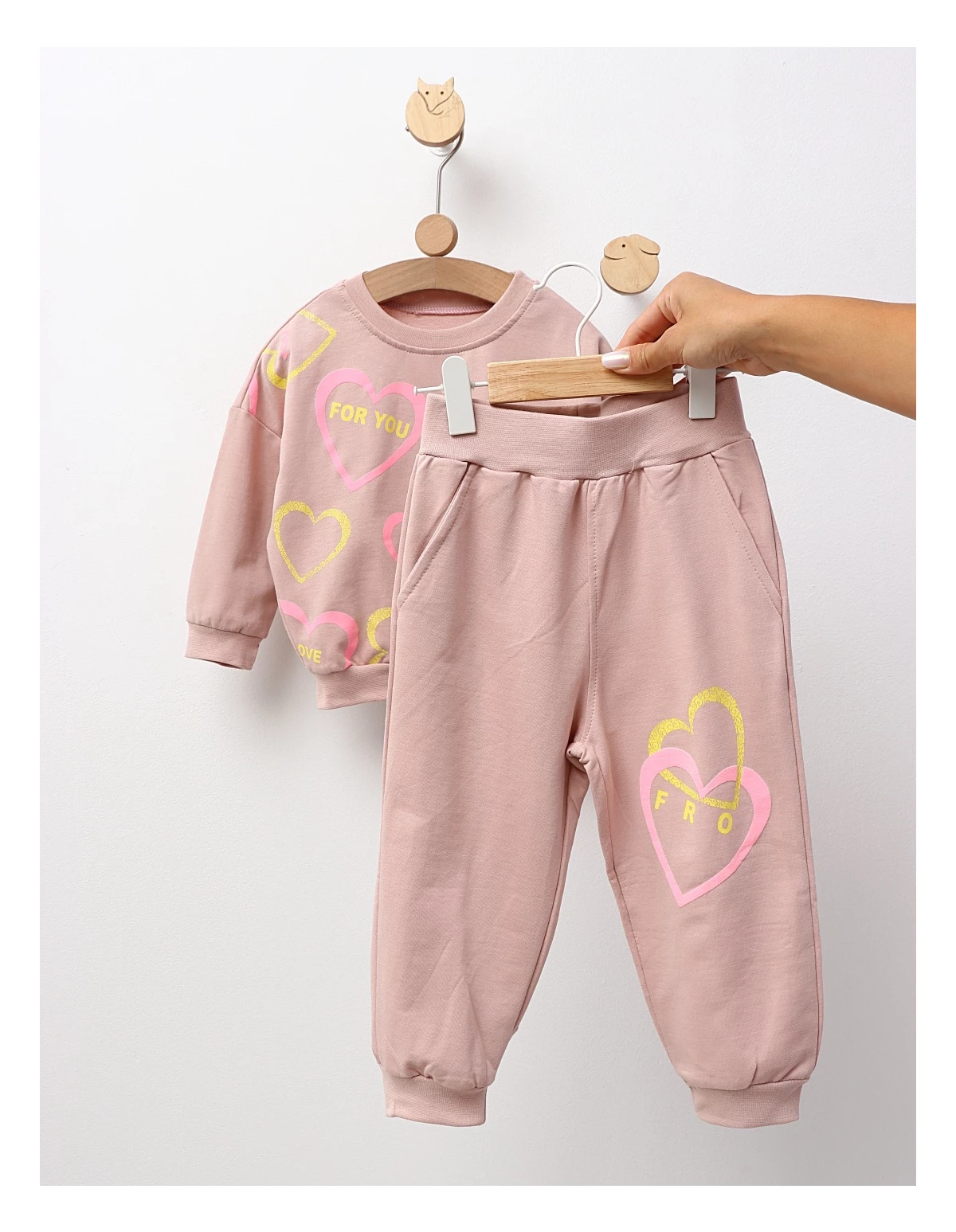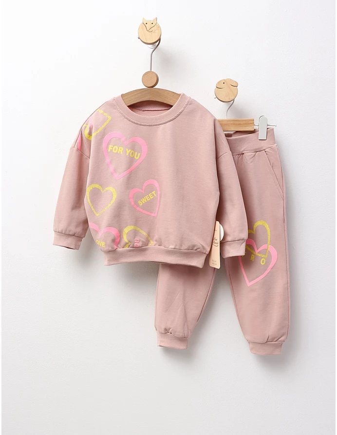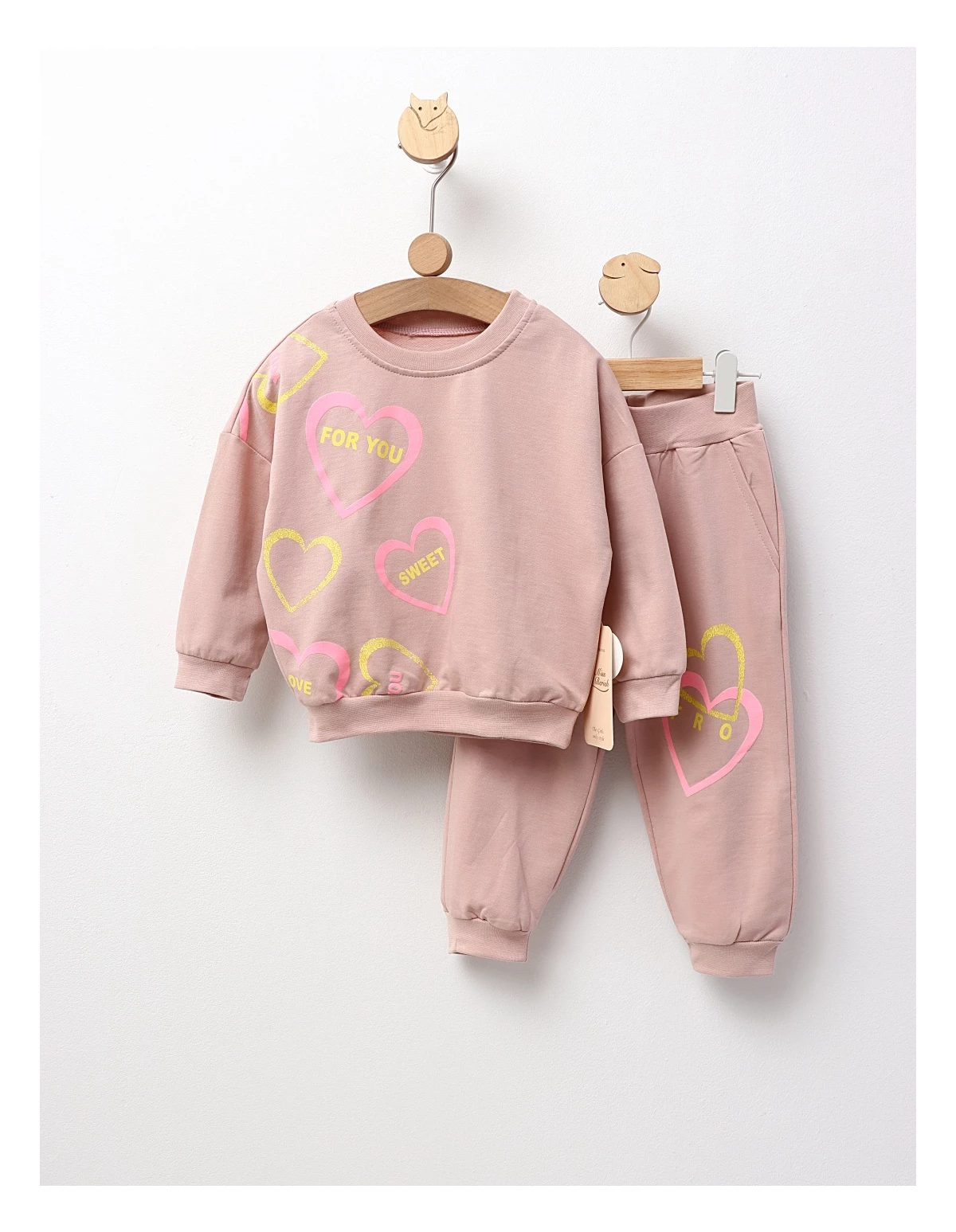 Set de trening pentru fetițe între 2 și 5 ani, format dintr-o bluză cu mânecă lungă, mansete și pantaloni cu elastic lat în talie pentru un confort sporit. Pantalonii au buzunare practică și elastic la nivelul gleznelor, oferind libertate de mișcare și un aspect vesel. Confecționat din 100% bumbac de calitate, acest trening asigură o purtare plăcută și durabilitate în timp. Fabricat în Turcia, perfect pentru activitățile zilnice și timpul liber.