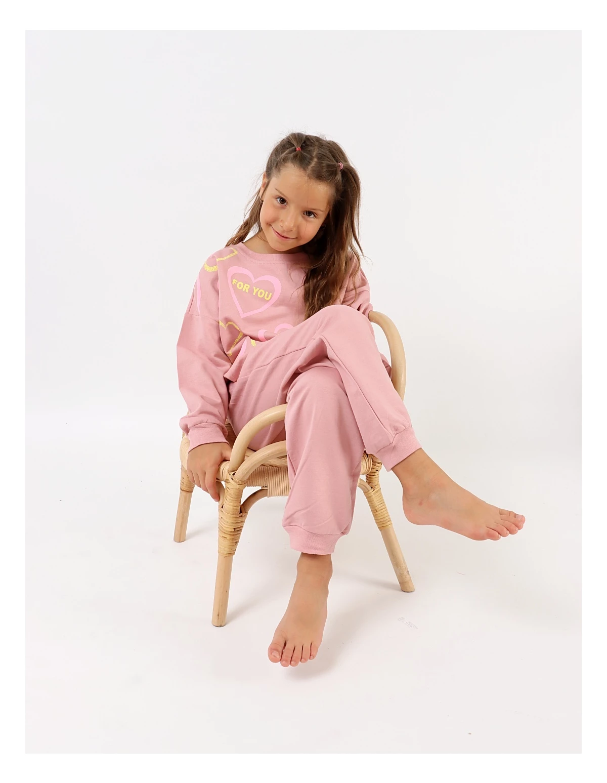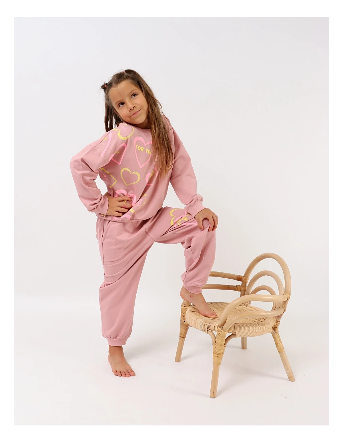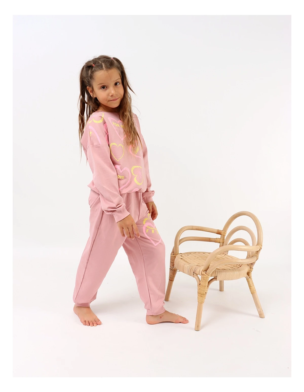 Set de trening pentru fetițe între 2 și 5 ani, format dintr-o bluză cu mânecă lungă, mansete și pantaloni cu elastic lat în talie pentru un confort sporit. Pantalonii au buzunare practică și elastic la nivelul gleznelor, oferind libertate de mișcare și un aspect vesel. Confecționat din 100% bumbac de calitate, acest trening asigură o purtare plăcută și durabilitate în timp. Fabricat în Turcia, perfect pentru activitățile zilnice și timpul liber.