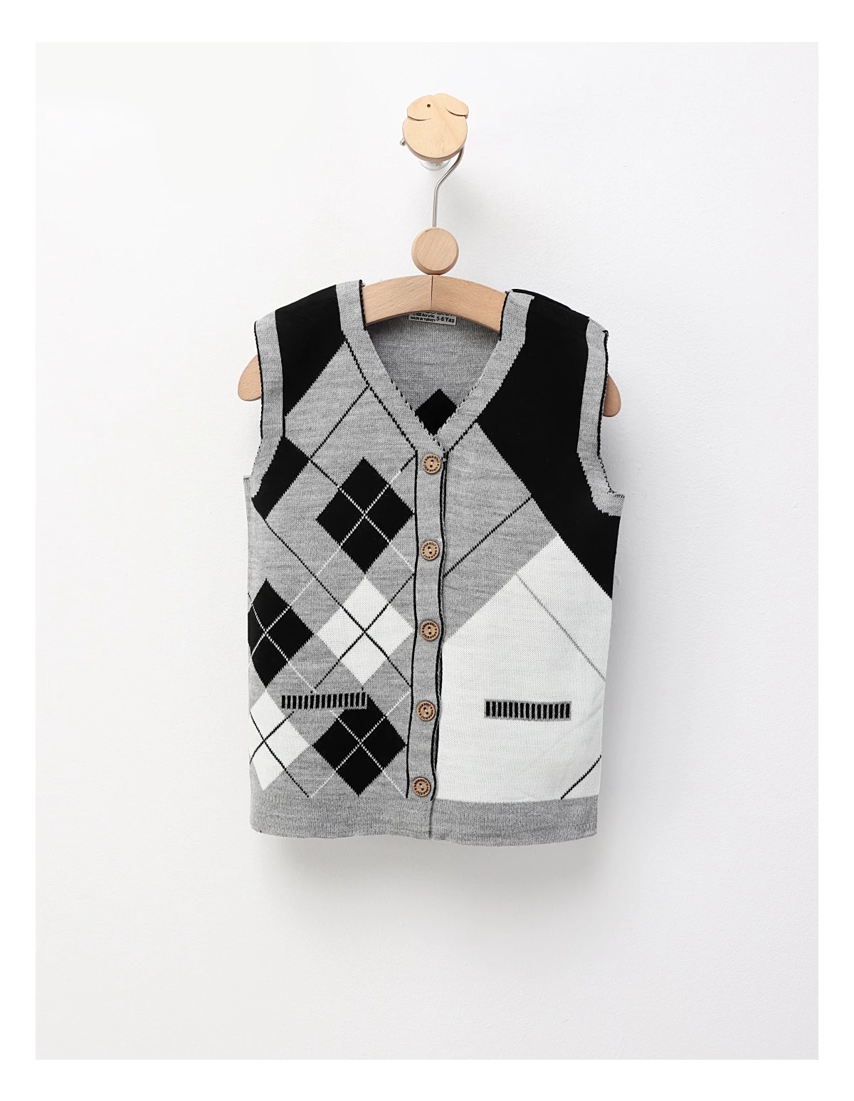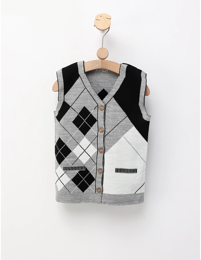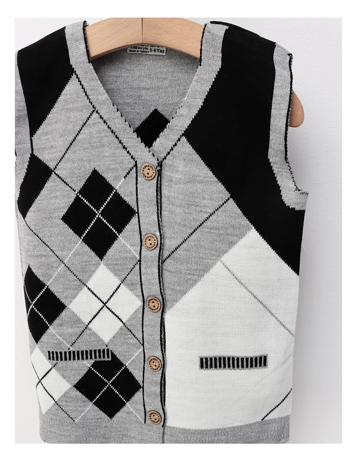 Vesta in carouri, deschidere in nasturi in partea din fata. Material 100% acrilic.