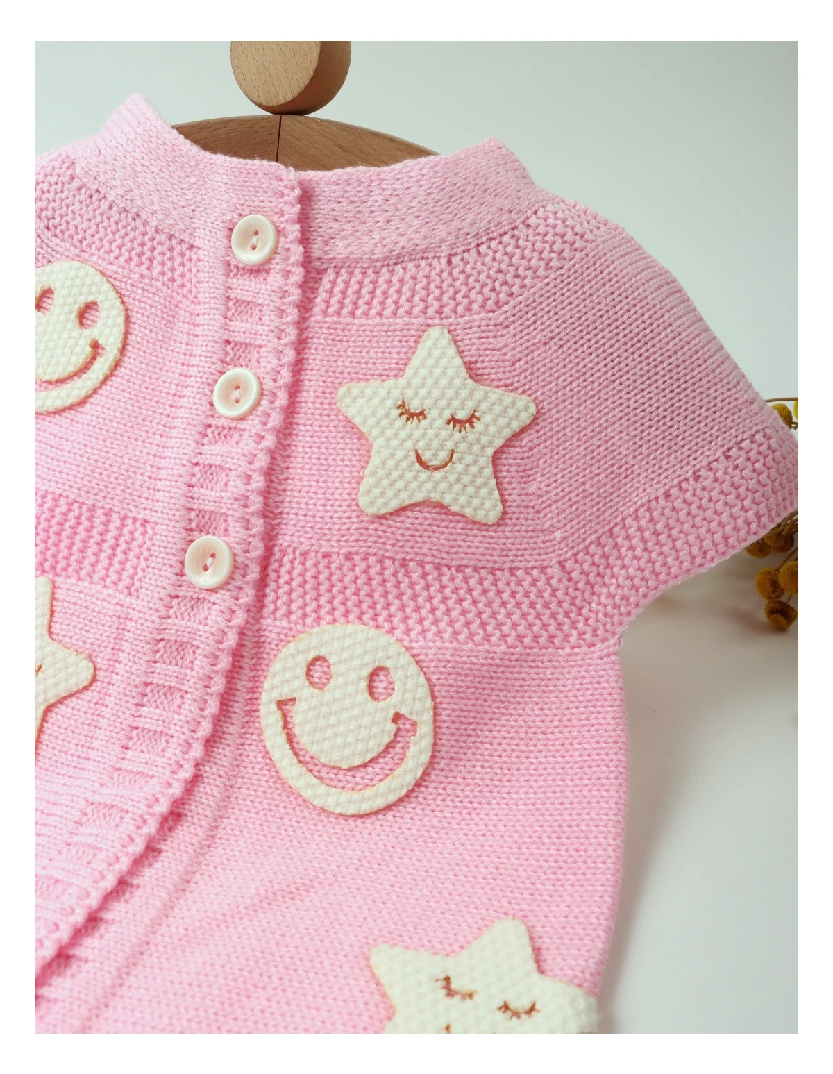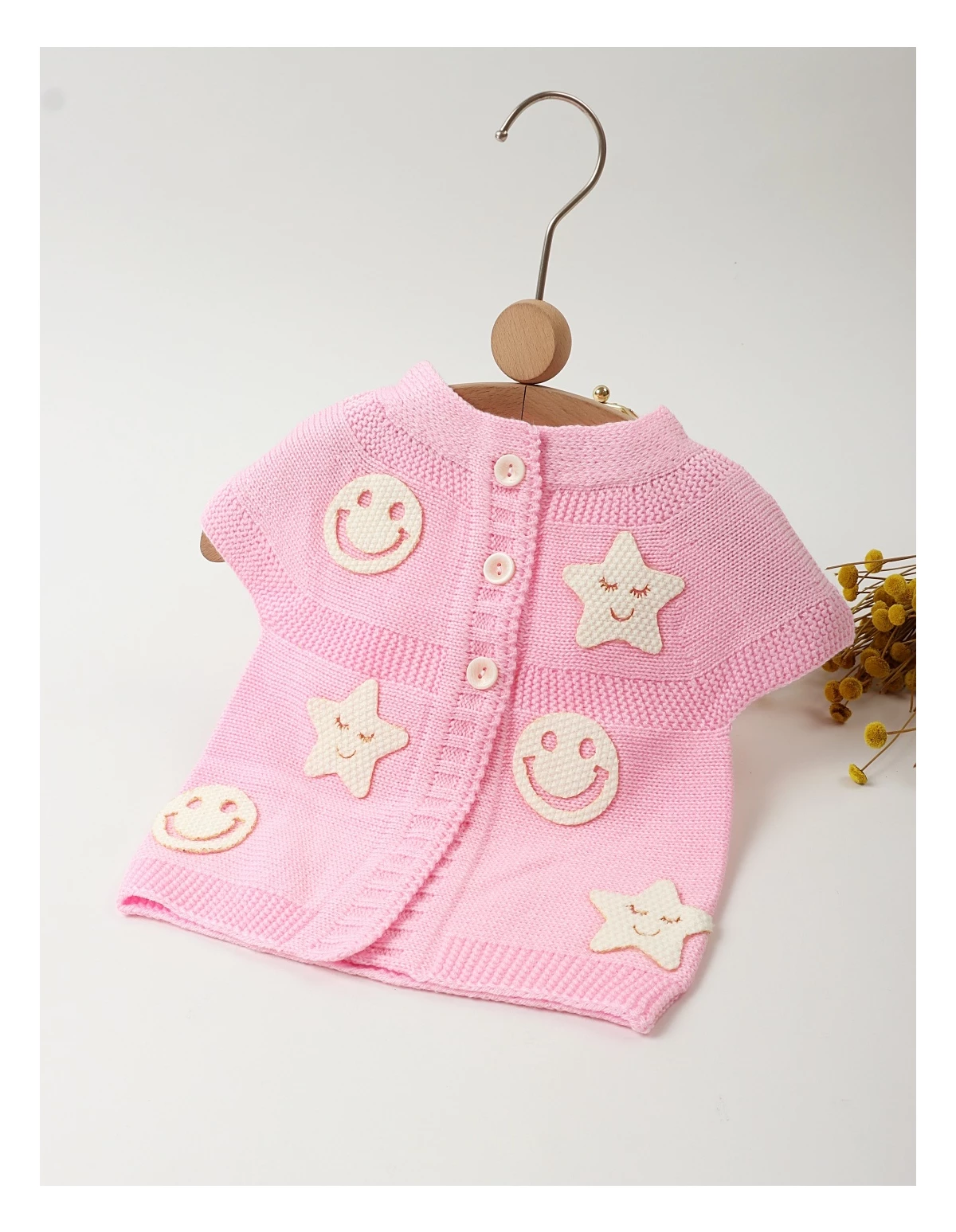 Vestă pentru fetite 100% acrilic - Deschidere în nasturi cu fete zambitoare si stelute atasate. O combinație de confort și stil într-o singură piesă! Material de înaltă calitate pentru ținute confortabile și stilate.