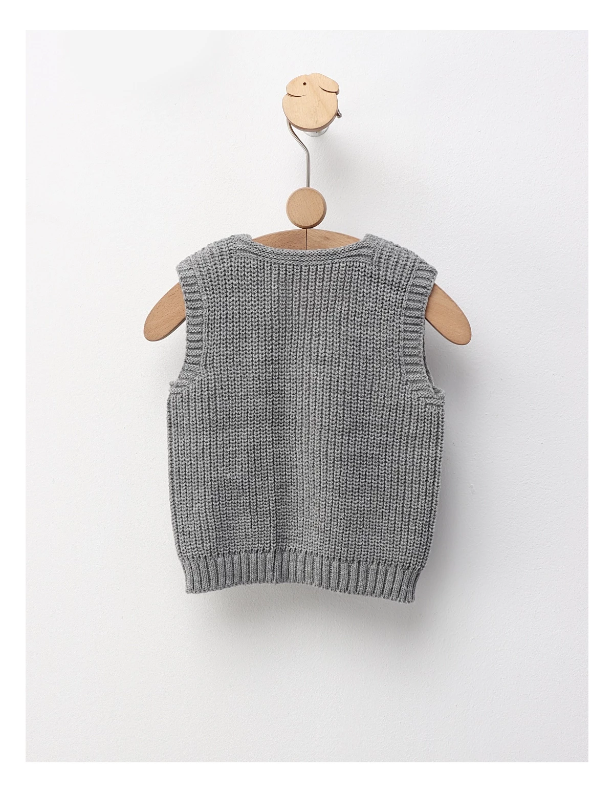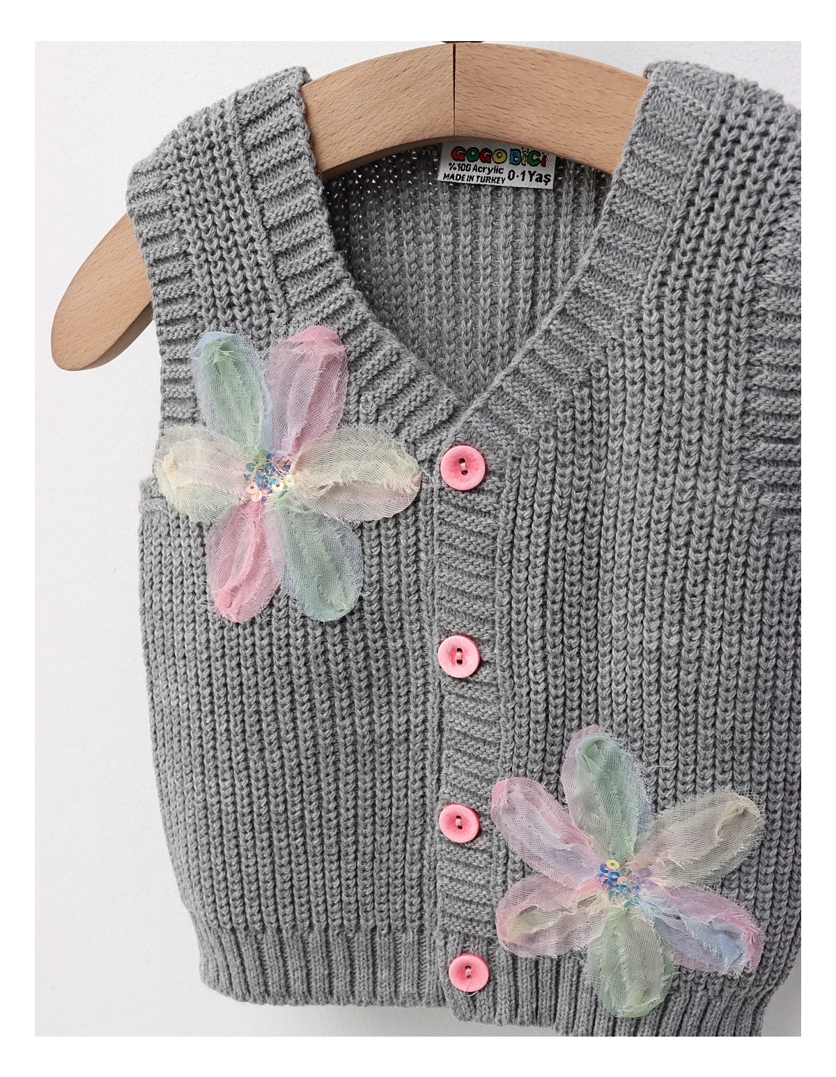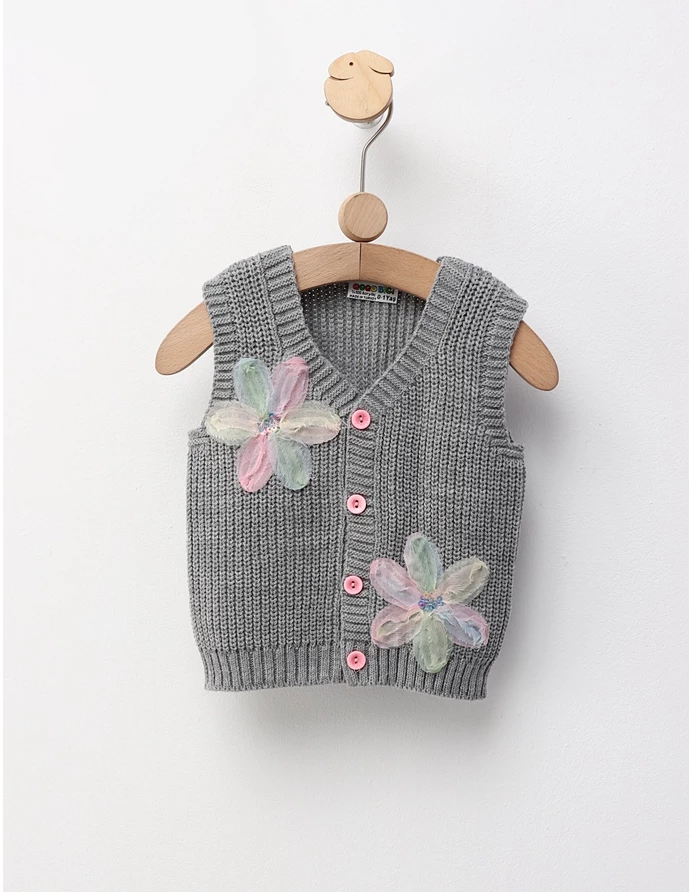 Vesta cu floricele atașate și deschidere în nasturi în partea din față, confecționată din material 100% acrilic. Perfectă pentru zilele răcoroase, oferă căldură, confort și un aspect feminin și delicat, fiind o alegere ideală pentru ținute de sezon.
