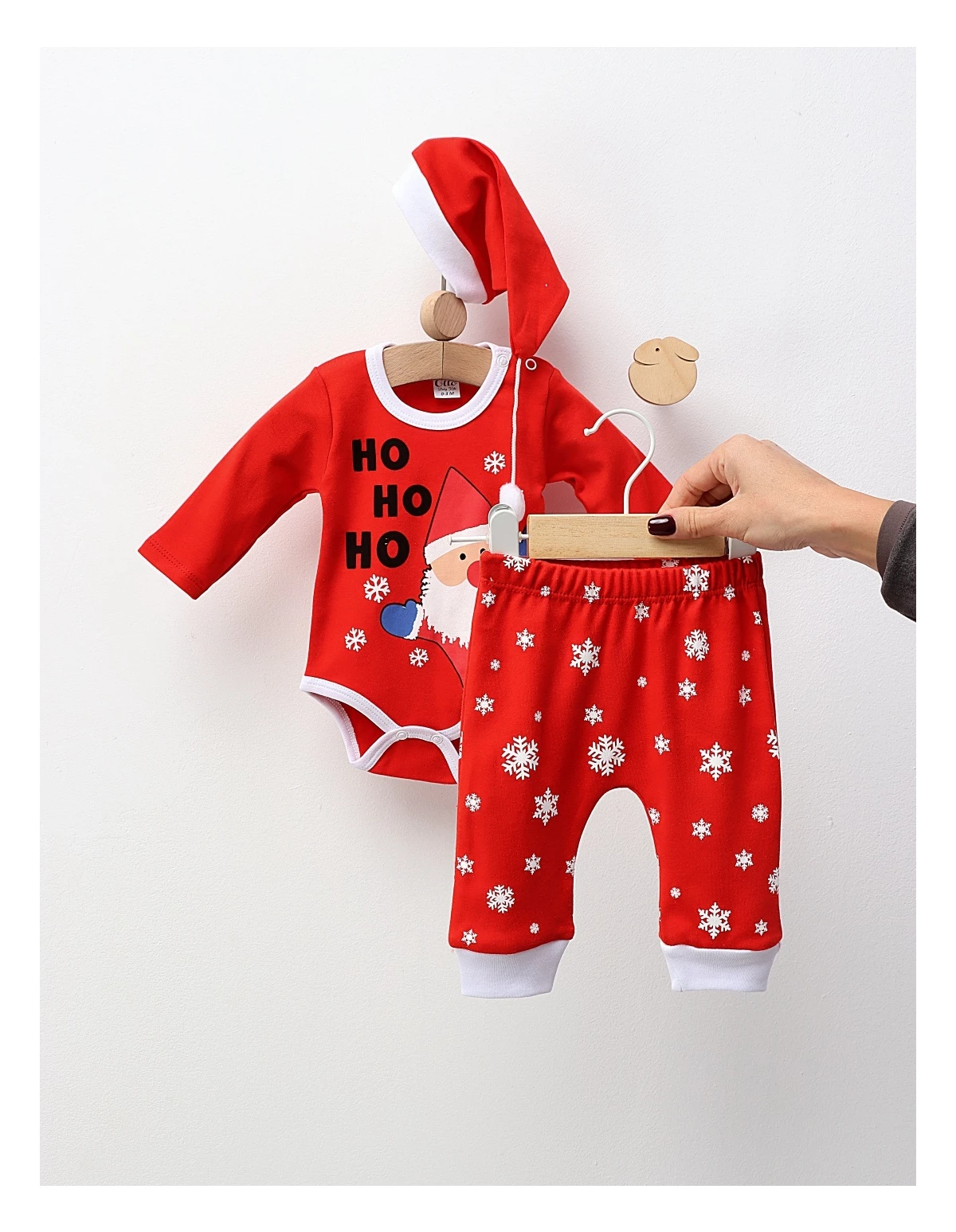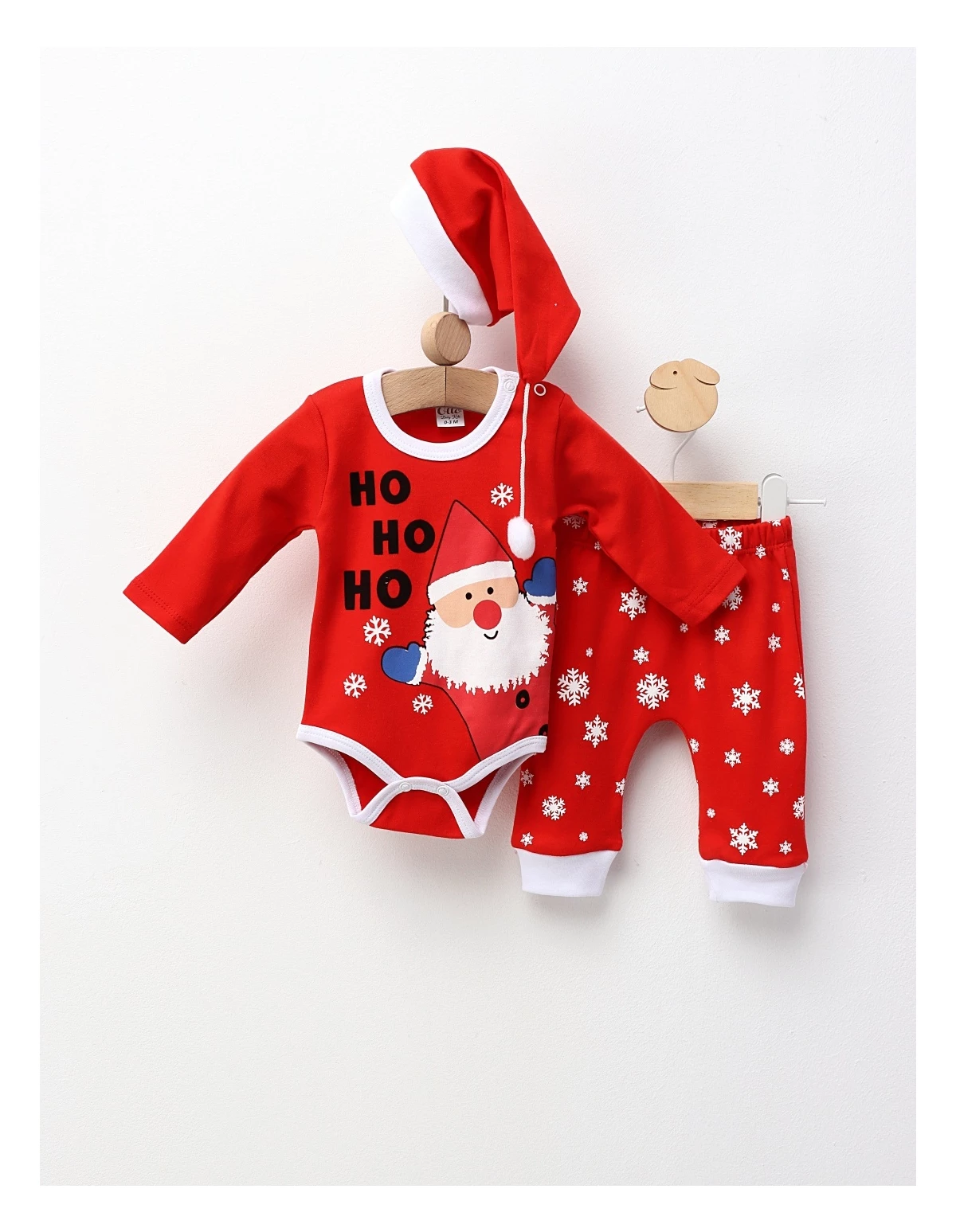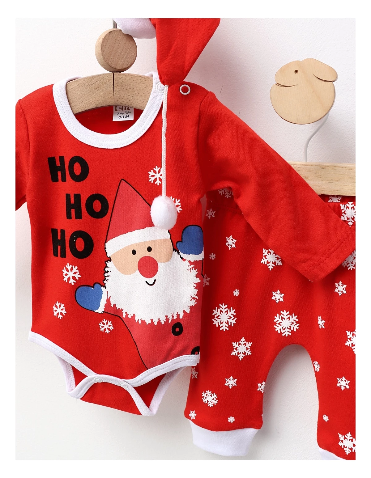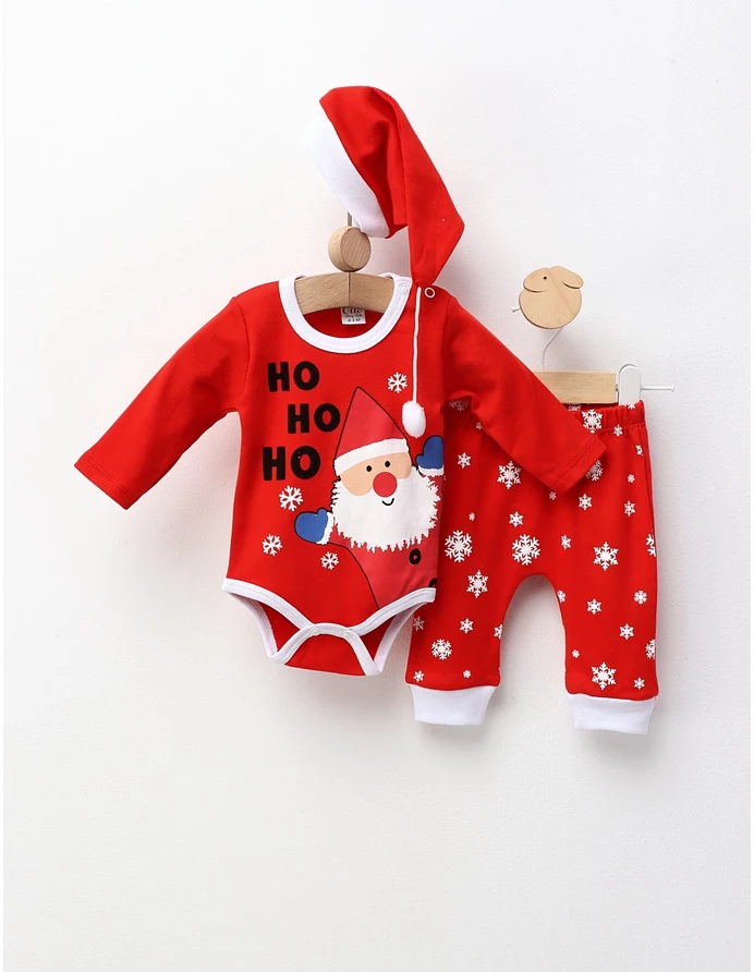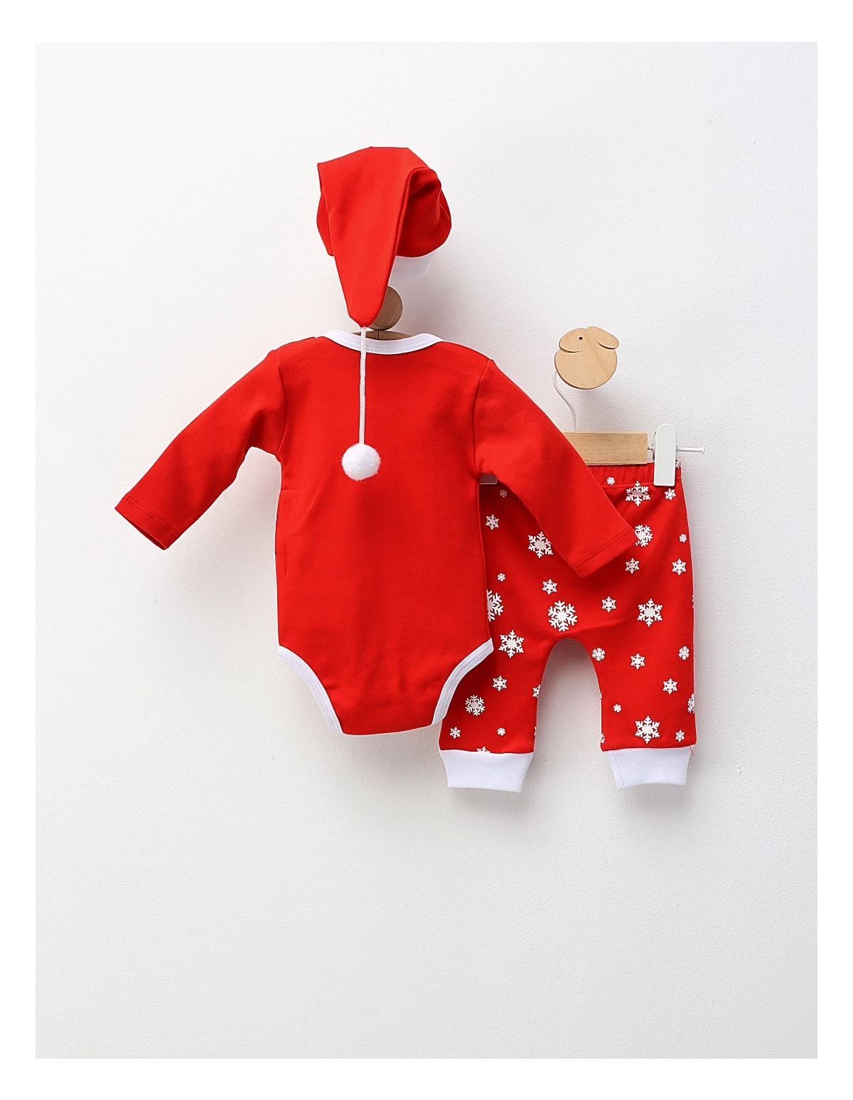 Compleu de Craciun format din body cu deschidere in capse pe umar, fes cu ciucure si pantaloni. Material 100% bumbac.
