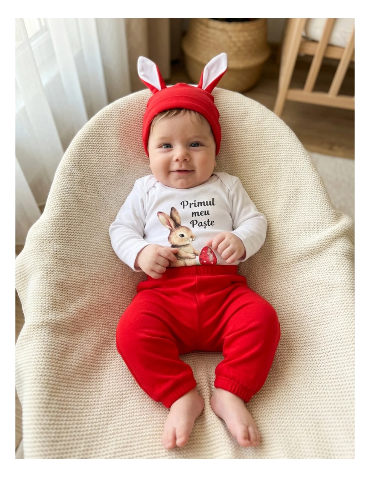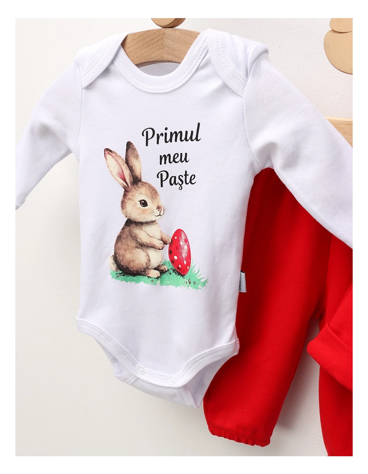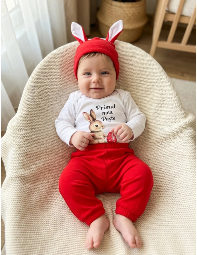 Îmbracă-ți bebelușul în acest set adorabil de 3 piese, special conceput pentru sărbătorile de Paște! Setul include un body cu mânecă lungă, dotat cu deschidere în capse, decorat cu un imprimeu vesel ce înfățișează un iepuraș și un ou, alături de textul "Primul meu Paște". Căciulița cu urechișe completează perfect look-ul festiv, adăugând un strop de distracție. Pantalonașii au elastic în talie, asigurând o potrivire confortabilă pentru micuț. Fabricat din 100% bumbac de calitate superioară, acest set este disponibil în mărimi de la 0-12 luni, fiind ideal pentru a sărbători prima sărbătoare de Paște alături de cei dragi!