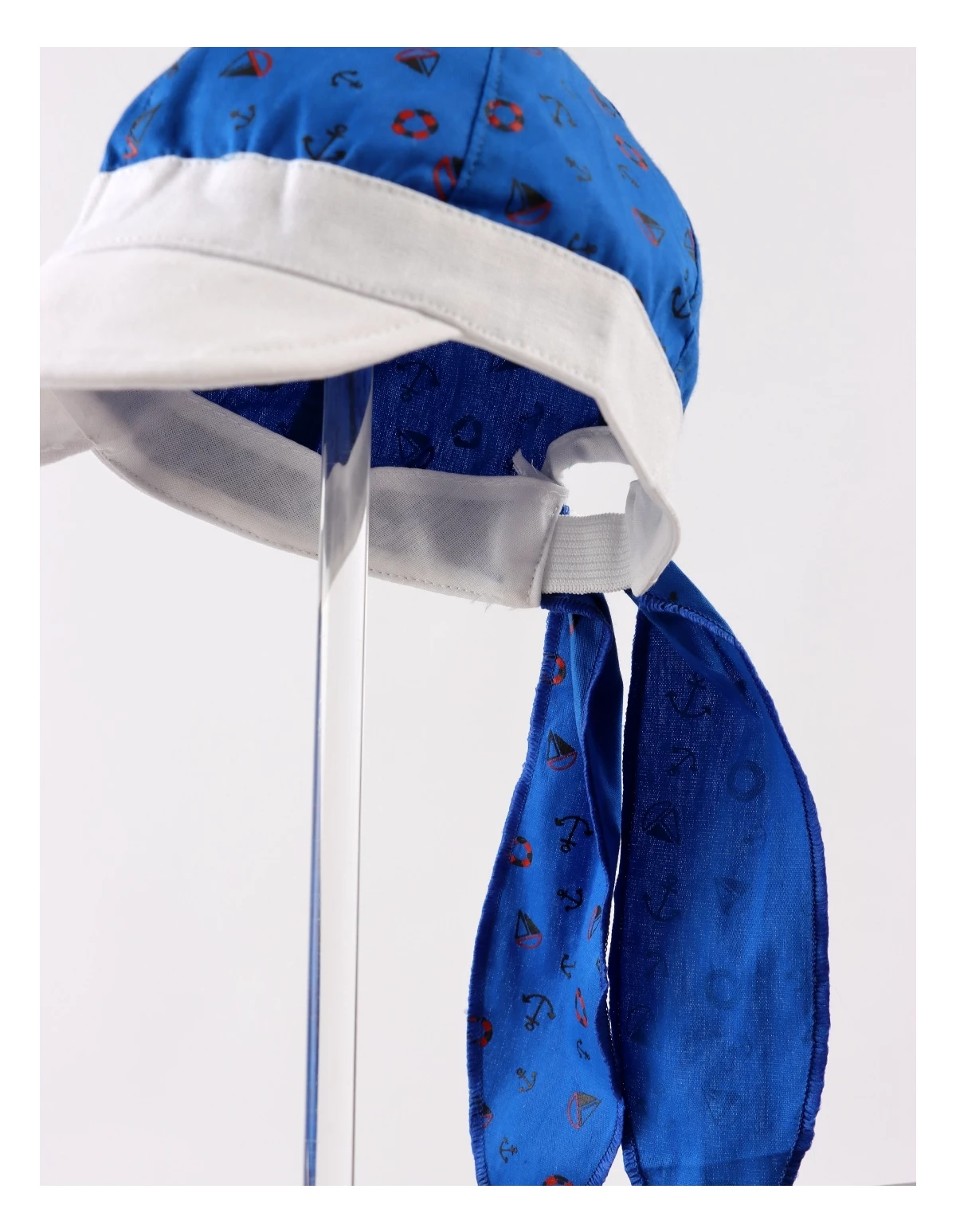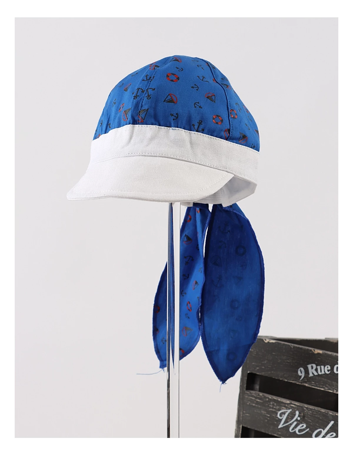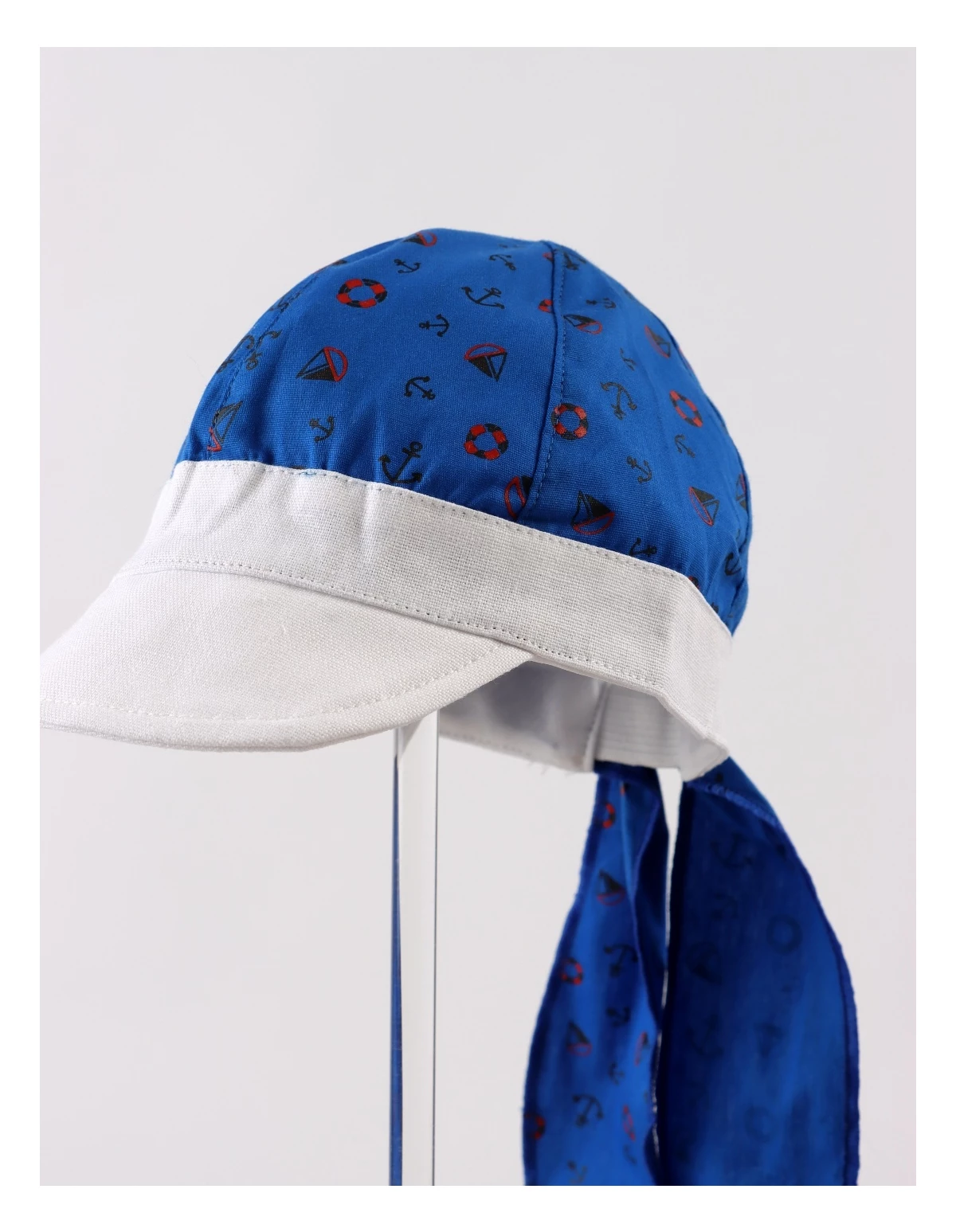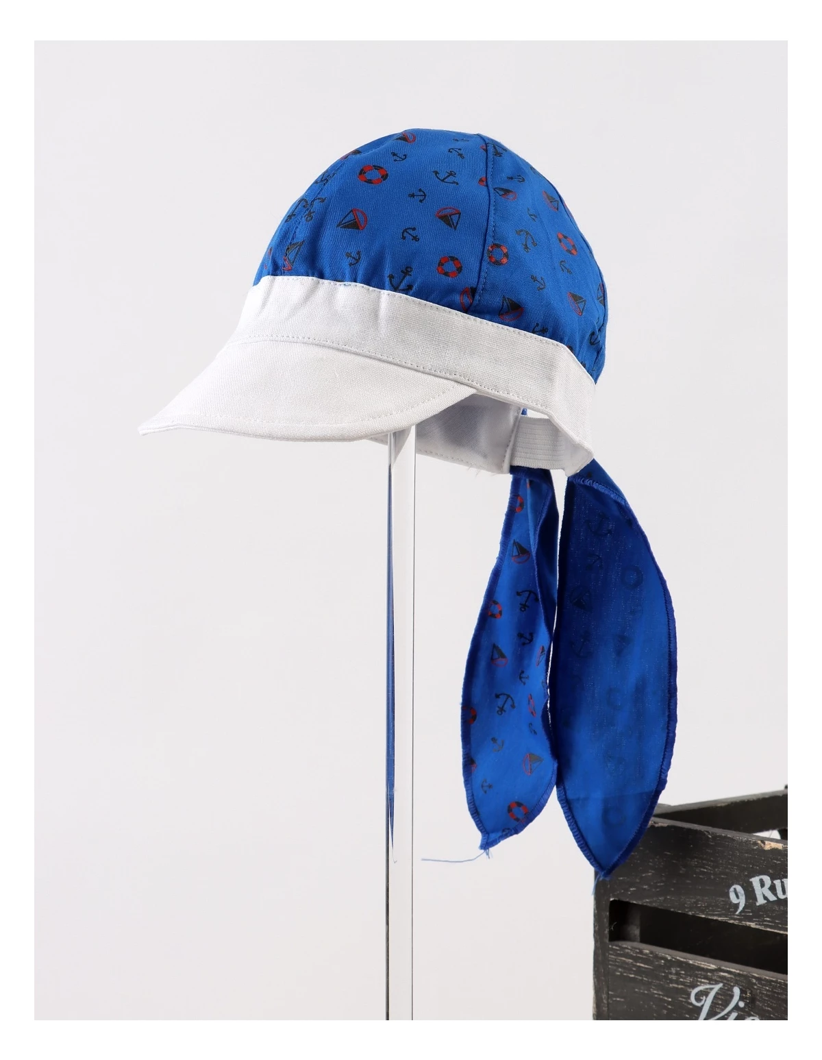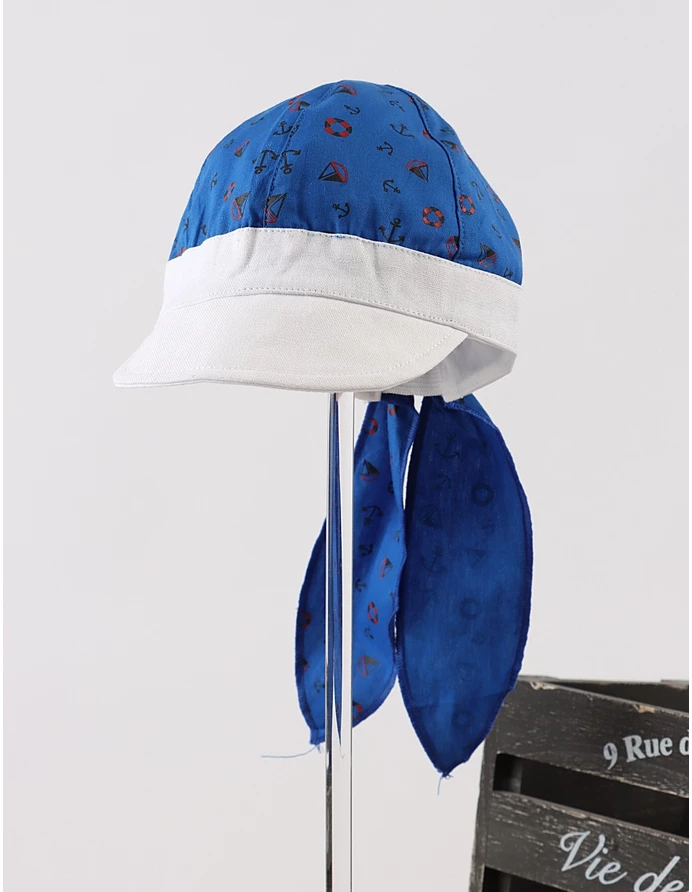 Șapca tip bandană reglabilă la spate, decorată cu imprimeuri cu ancore și bărcuțe, este perfectă pentru a proteja băiețelul de razele soarelui în zilele petrecute la plajă sau în parc. Fabricată din 95% bumbac și 5% poliester, oferă confort și respirabilitate, fiind o alegere ideală pentru zilele călduroase și pline de aventură.