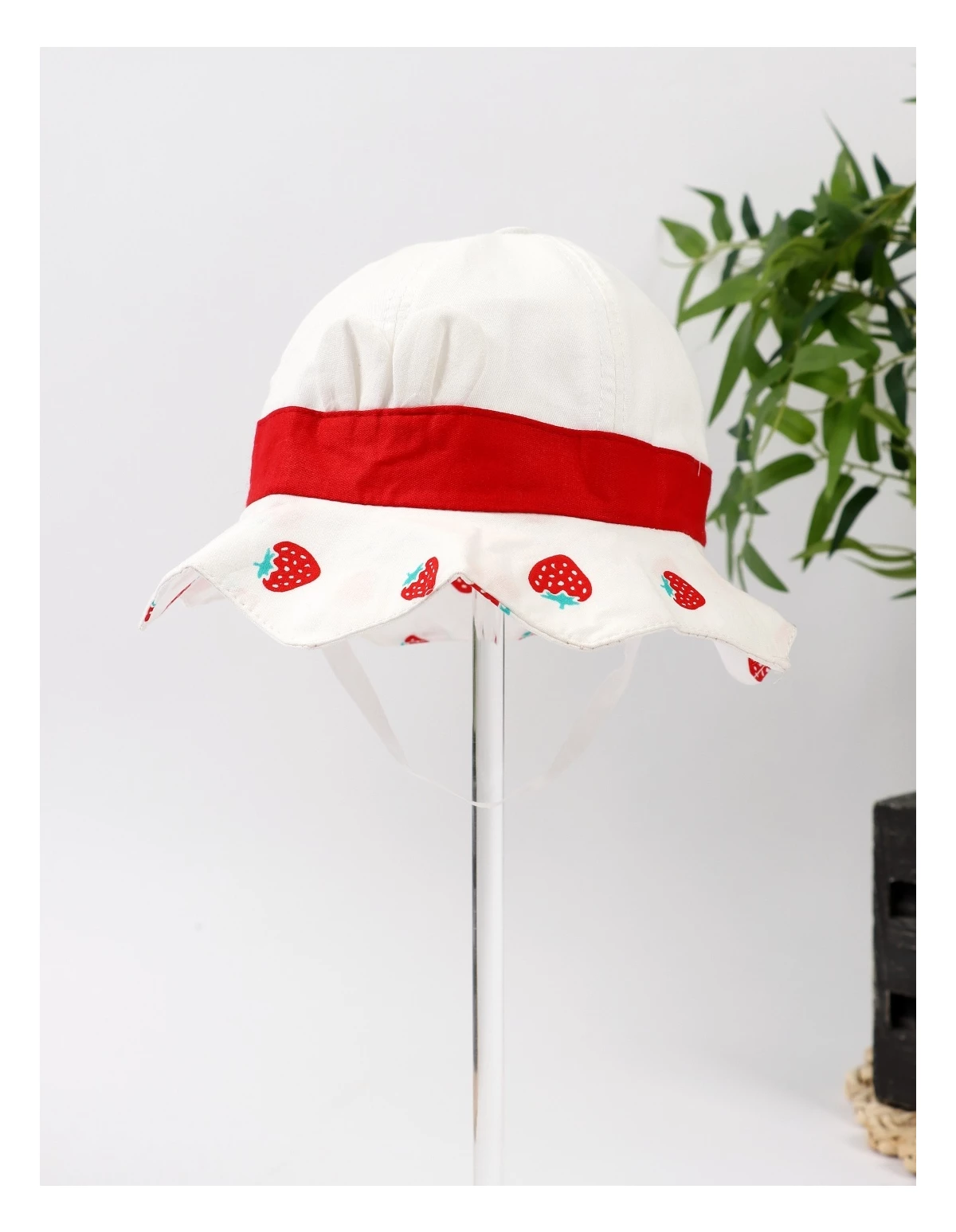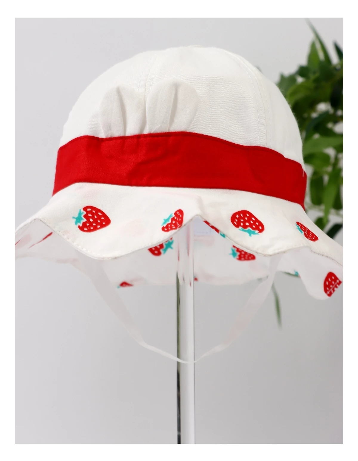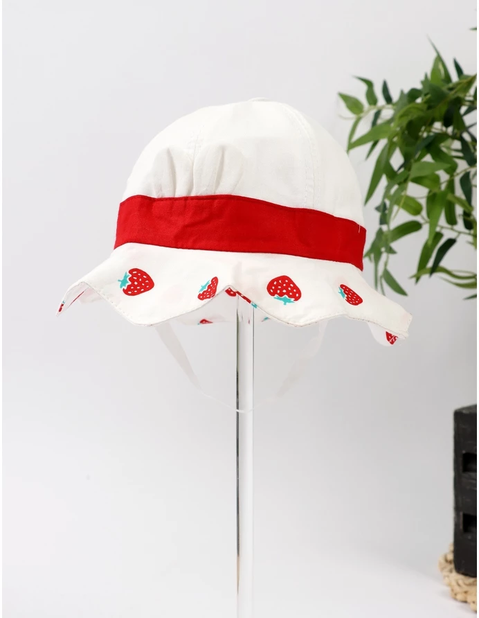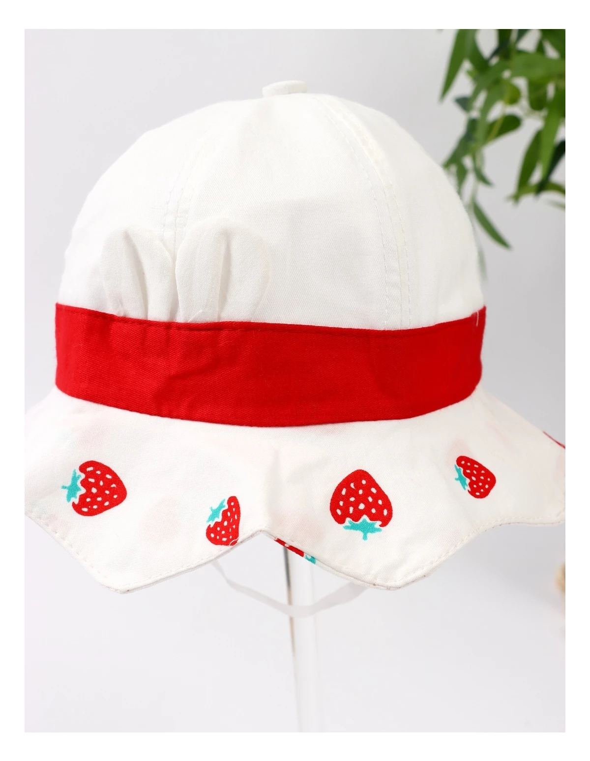 Pălărie pentru fetițe, cu urechișoare adorabile și snur pentru o fixare sigură, decorată cu imprimeu cu căpșuni, fiind realizată din 100% bumbac. Ideală pentru zilele însorite, oferă protecție și un aspect cîntăreț pentru micuța ta!