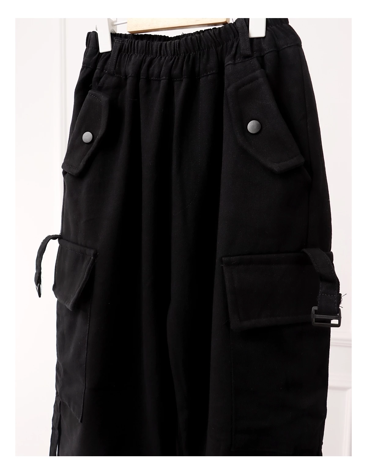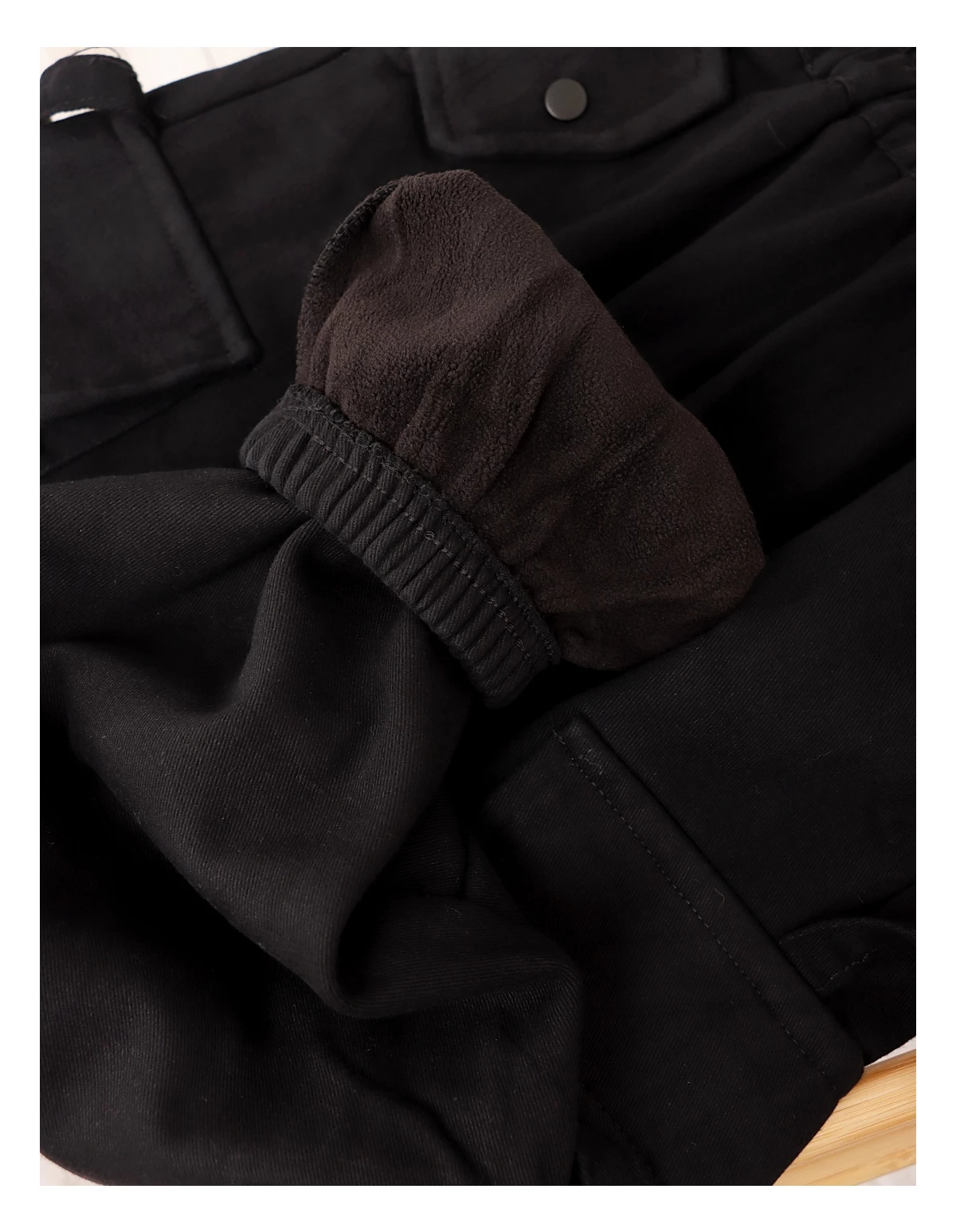 Pantaloni de blug pentru fete și băieți, cu un design modern și unic în stil cargo tactil, echipați cu buzunare laterale, cordon lateral și elastic la glezne. Talie elastică pentru confort și pantaloni îmblăniti în interior, perfecti pentru zilele răcoroase. Confecționați din 73.5% bumbac și 26.5% poliester, oferă confort, durabilitate și un look stylish pentru cei mici în orice aventură.