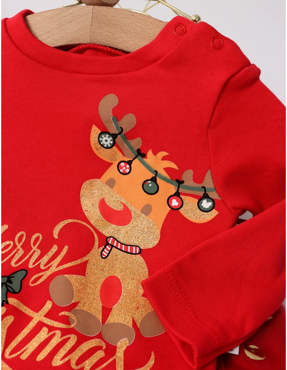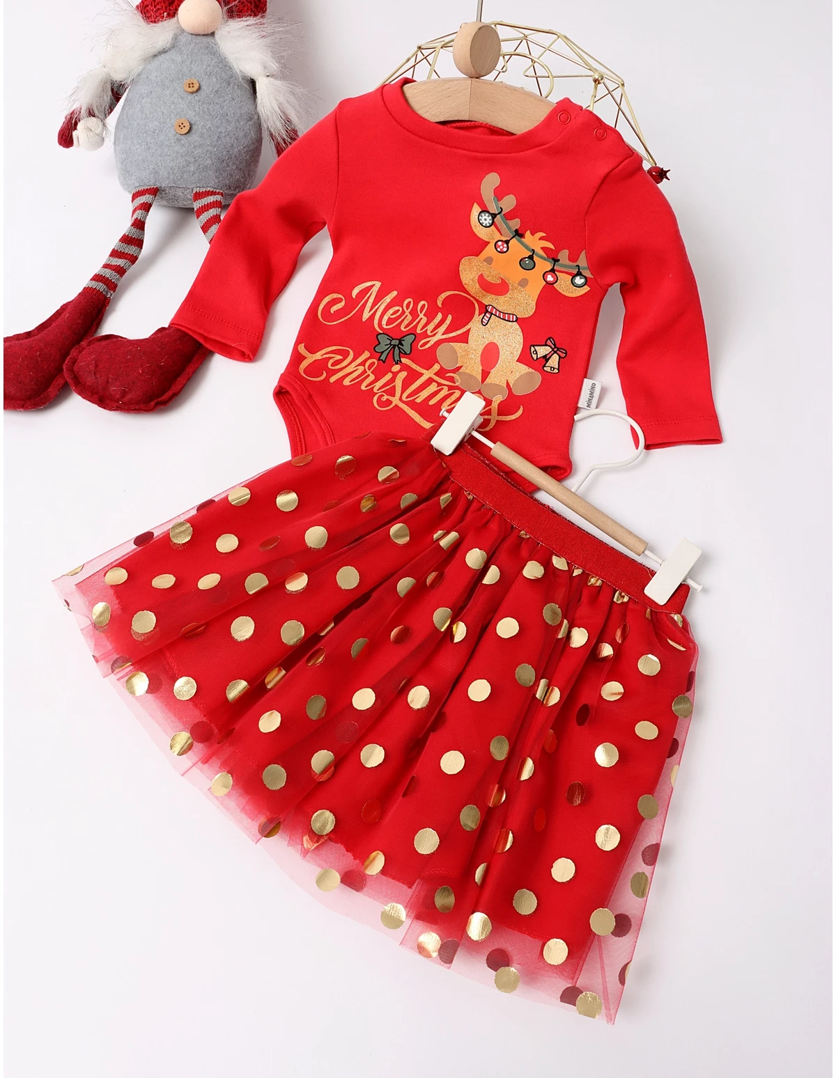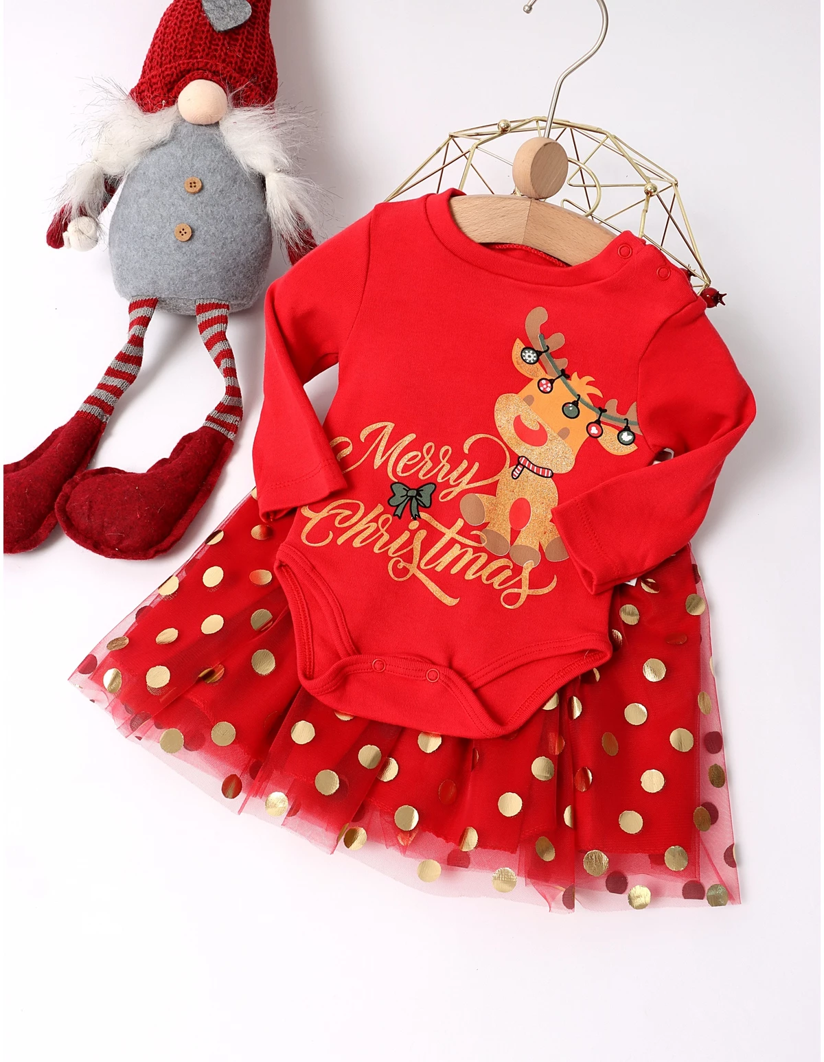 Adaugă un strop de magie sărbătorilor cu acest body adorabil pentru fetițe, cu temă de Crăciun! Acest body este dotat cu deschidere în capse, facilitând îmbrăcarea rapidă. Imprimeul vesel cu reni aduce un aer festiv, iar fustița cu elastic în talie și detalii din tulle completează ținuta cu un plus de eleganță. Fabricat din 100% bumbac, acest body asigură confortul necesar pielii delicate a fetiței tale. Ideal pentru petreceri de Crăciun, întâlniri în familie sau sesiuni foto festive, acest outfit va deveni rapid preferatul micuței tale!