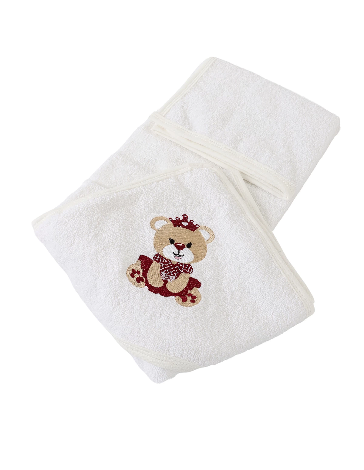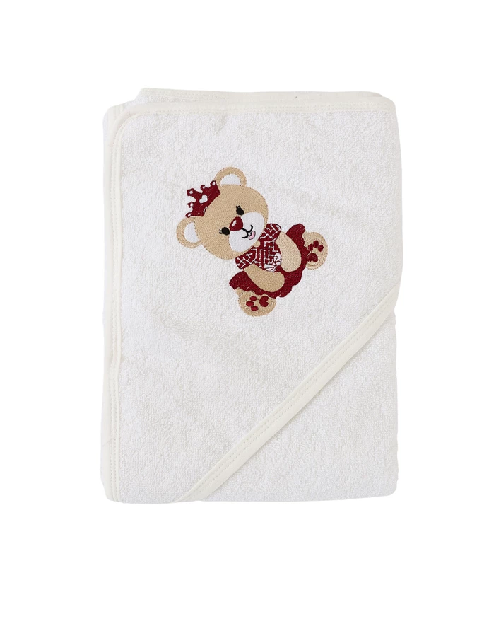 Prosop de baie pentru bebeluși, absorbant și moale, confecționat din 100% bumbac. Designul include un capișon, adăugând un plus de căldură și confort. De culoare albă, cu un imprimeu de urs cusut, este perfect pentru momentele de după baie ale celor mici.