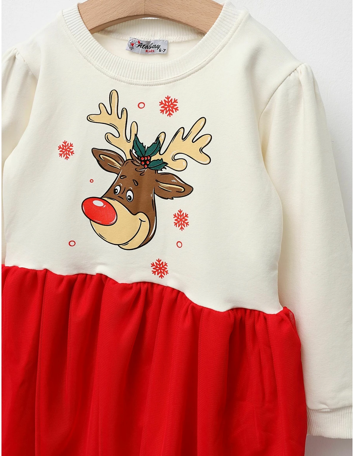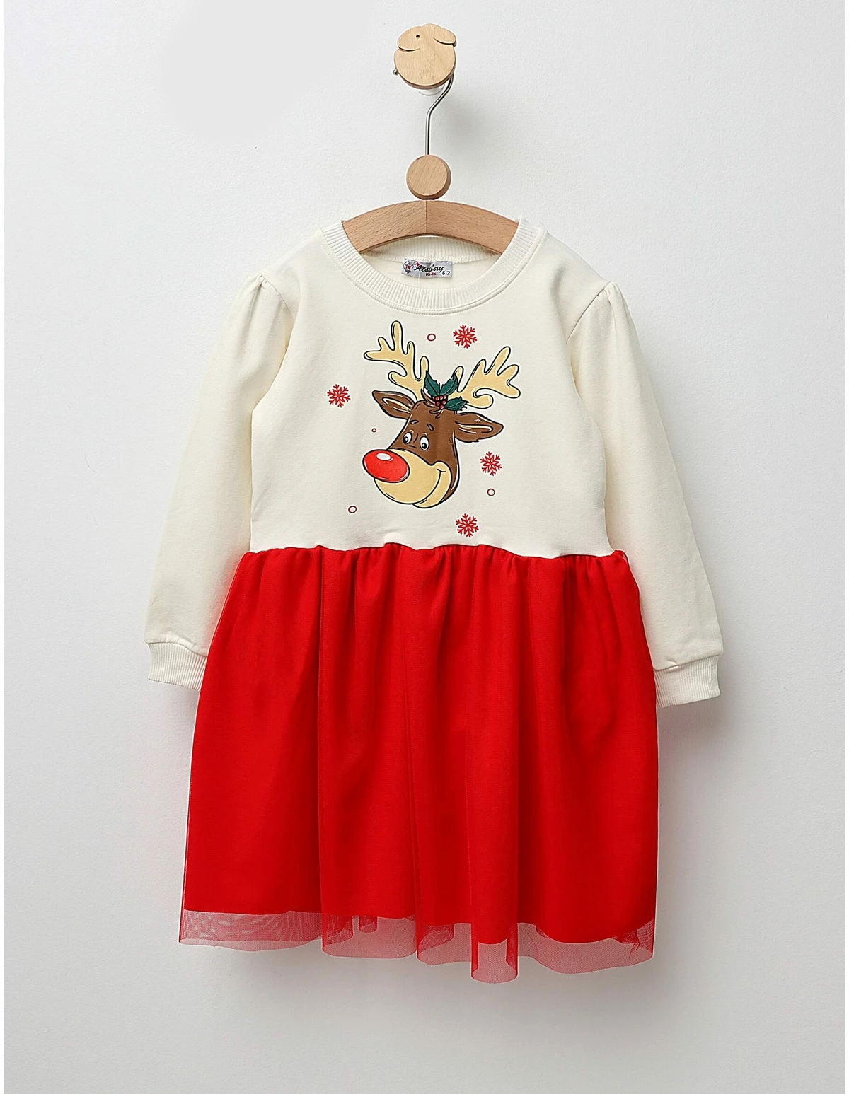 Îmbracă-ți fetița cu această rochiță adorabilă cu temă de Crăciun, perfectă pentru sărbători! Modelul are partea de sus stil bluză, împodobită cu un imprimeu jucăuș cu reni, adăugând o notă festivă ținutei. Rochița este plusată pe interior pentru un confort maxim în zilele răcoroase și este completată cu o jupă elegantă pentru un aspect fermecător. Fabricată dintr-un amestec de 95% bumbac și 5% elastan, aceasta oferă o potrivire confortabilă și o libertate de mișcare. Ideală pentru petreceri de Crăciun, întâlniri cu familia sau momente speciale, această rochiță va face ca fetița ta să strălucească!