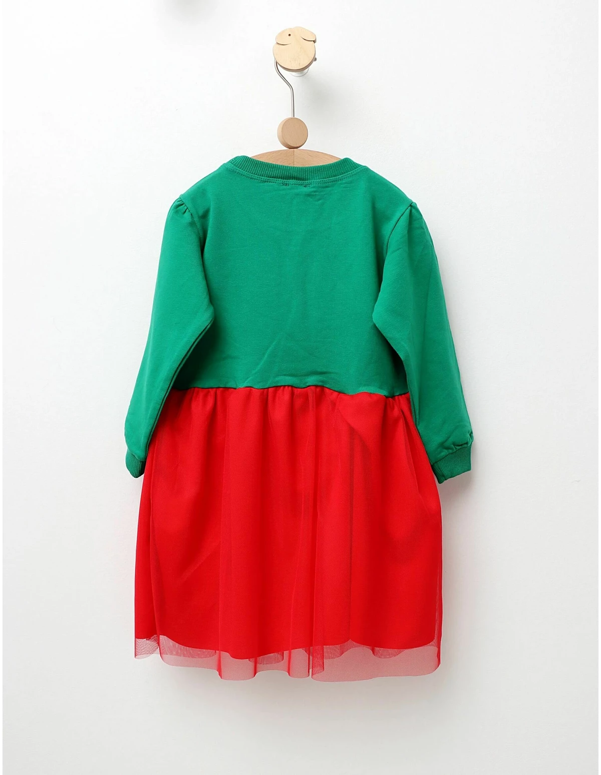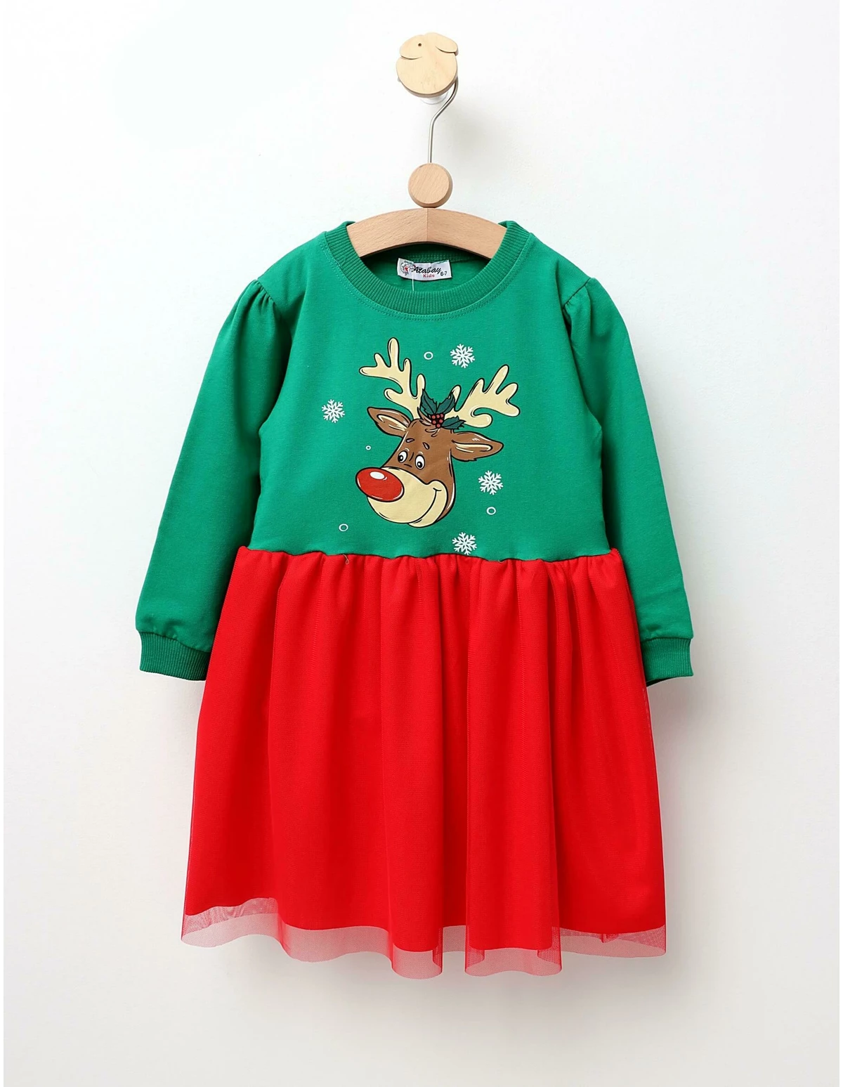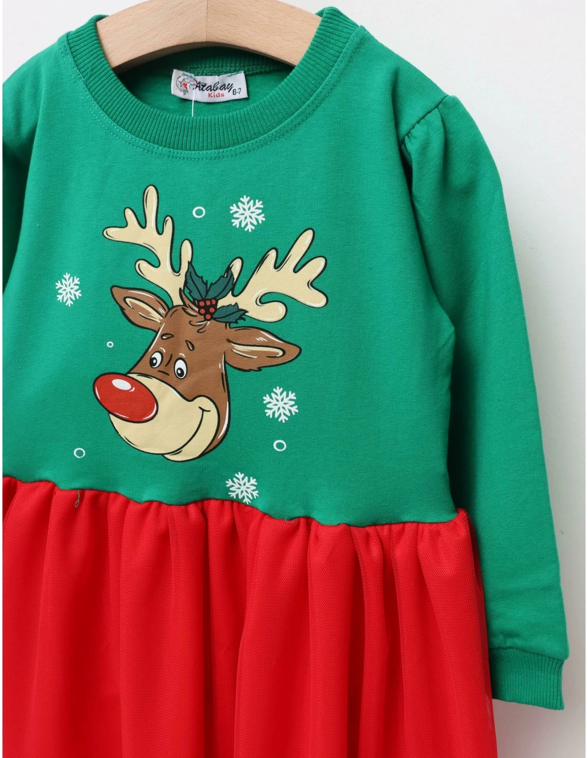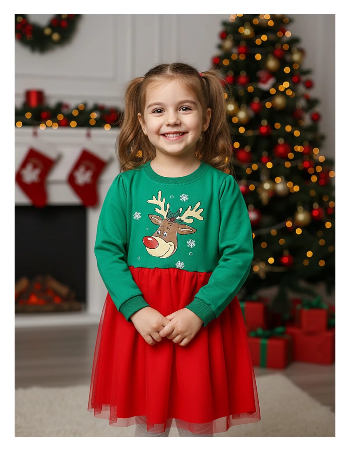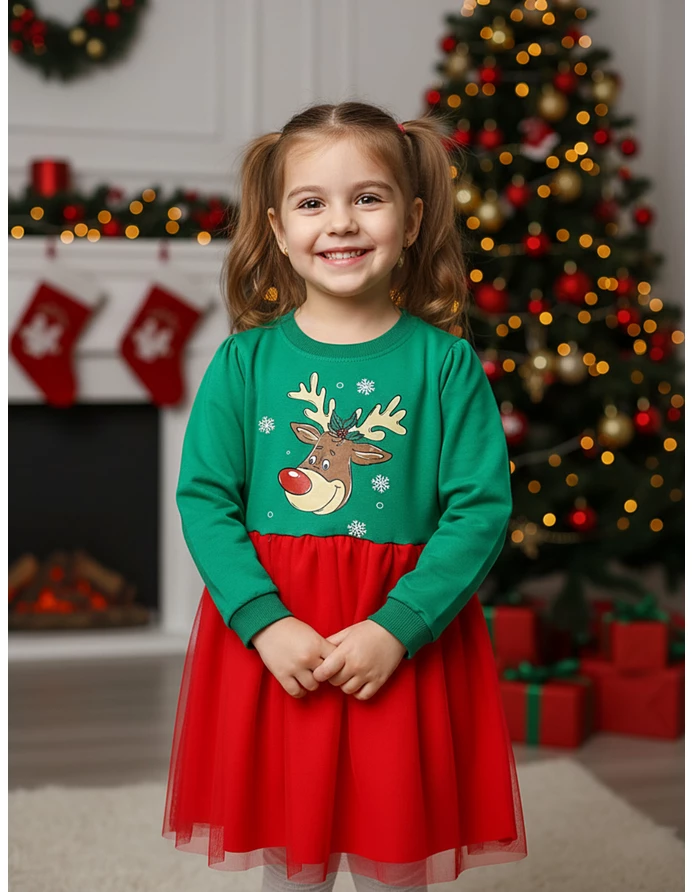 Îmbracă-ți fetița cu această rochiță adorabilă cu temă de Crăciun, perfectă pentru sărbători! Modelul are partea de sus stil bluză, împodobită cu un imprimeu jucăuș cu reni, adăugând o notă festivă ținutei. Rochița este plusată pe interior pentru un confort maxim în zilele răcoroase și este completată cu o jupă elegantă pentru un aspect fermecător. Fabricată dintr-un amestec de 95% bumbac și 5% elastan, aceasta oferă o potrivire confortabilă și o libertate de mișcare. Ideală pentru petreceri de Crăciun, întâlniri cu familia sau momente speciale, această rochiță va face ca fetița ta să strălucească!